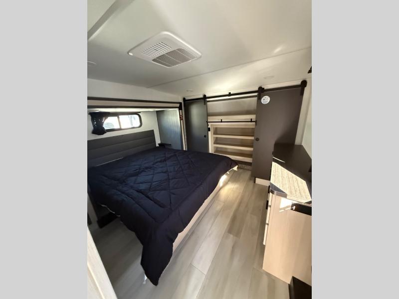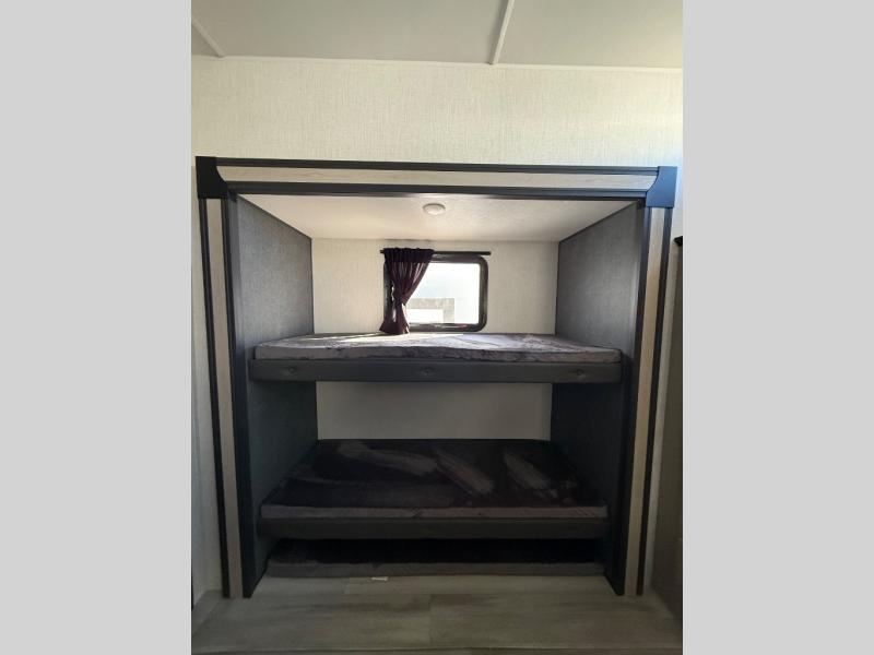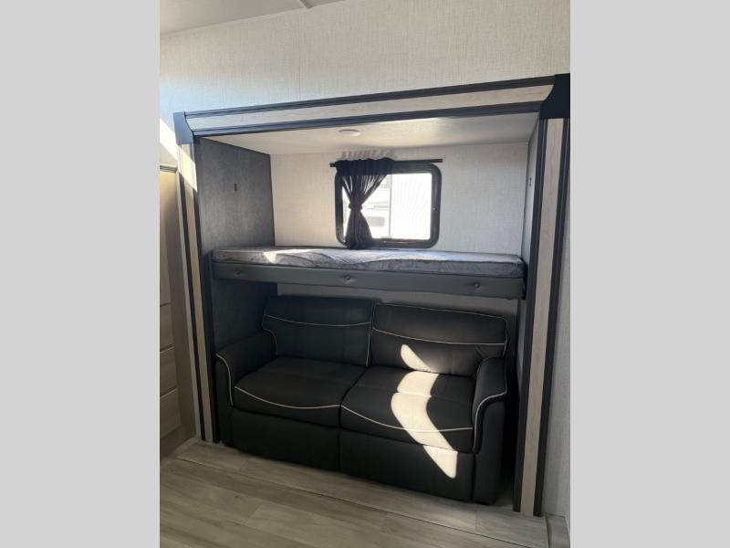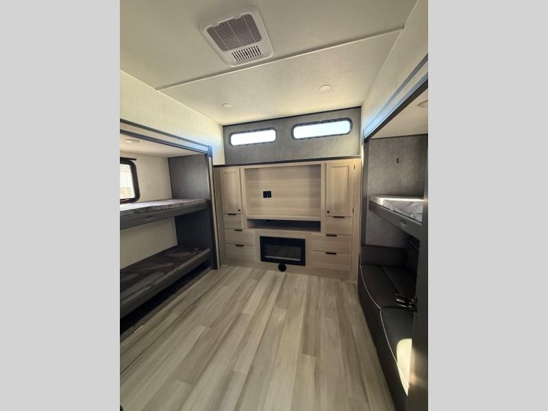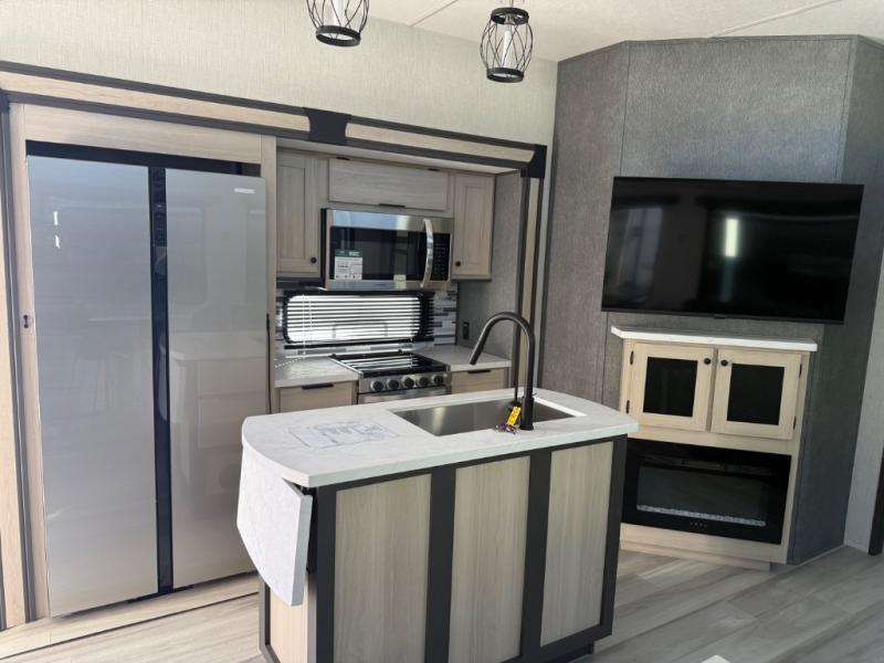 This fifth wheel's name describes it perfectly; it's the best! Your guests will love the rear private bunkhouse with dual opposing slides, bunk beds, plus a hide-a-bed sofa and an entertainment center with dual wardrobes. There is even a half bath with its own exterior entry door! You will have the front private bedroom all to yourselves with a king bed slide out and a walk-in wardrobe with washer and dryer prep. And the full bath is close by for easy nighttime use. The combined middle kitchen and living room will be a space everyone can meet in since there is a hi-top table and chairs and theater seating, an entertainment center with a fireplace, plus a kitchen island where snacks can be set out.