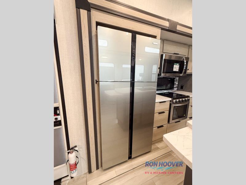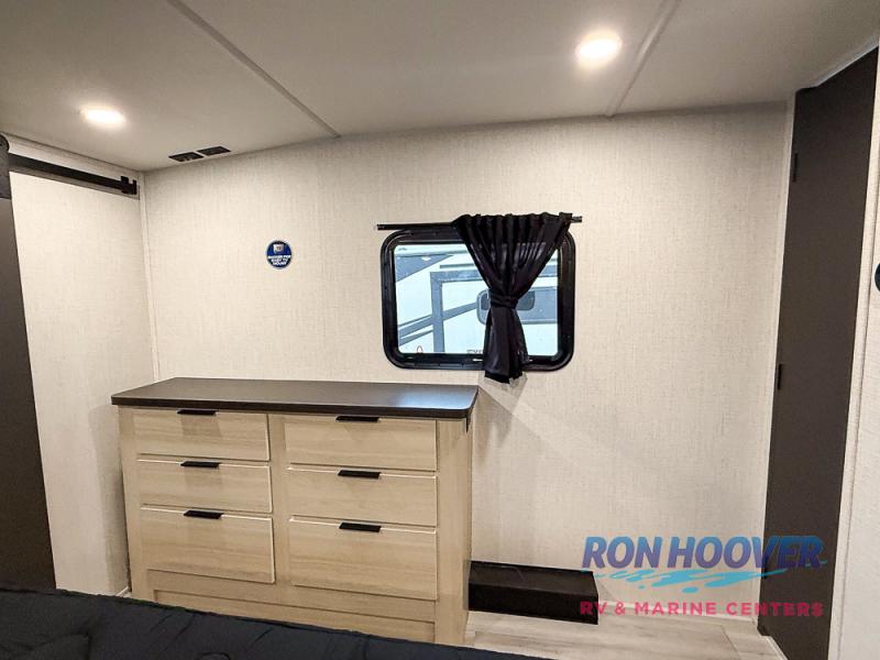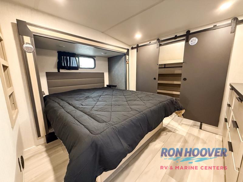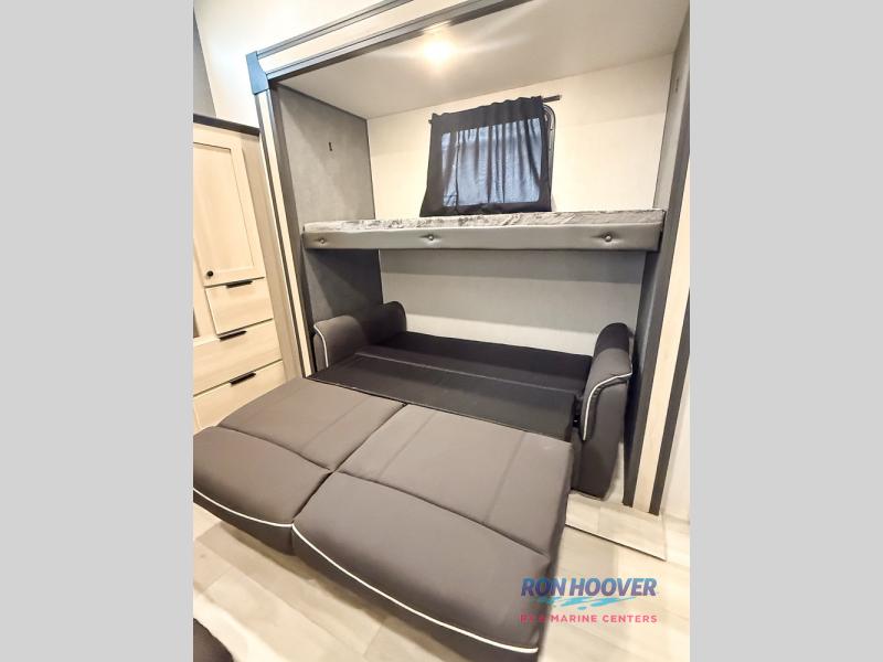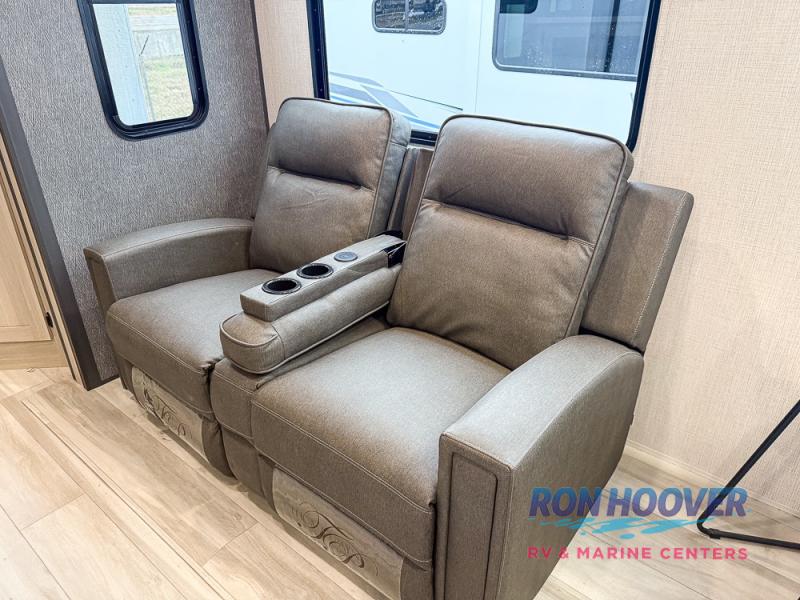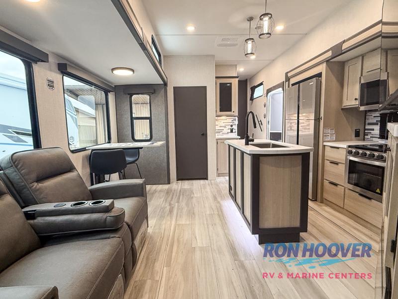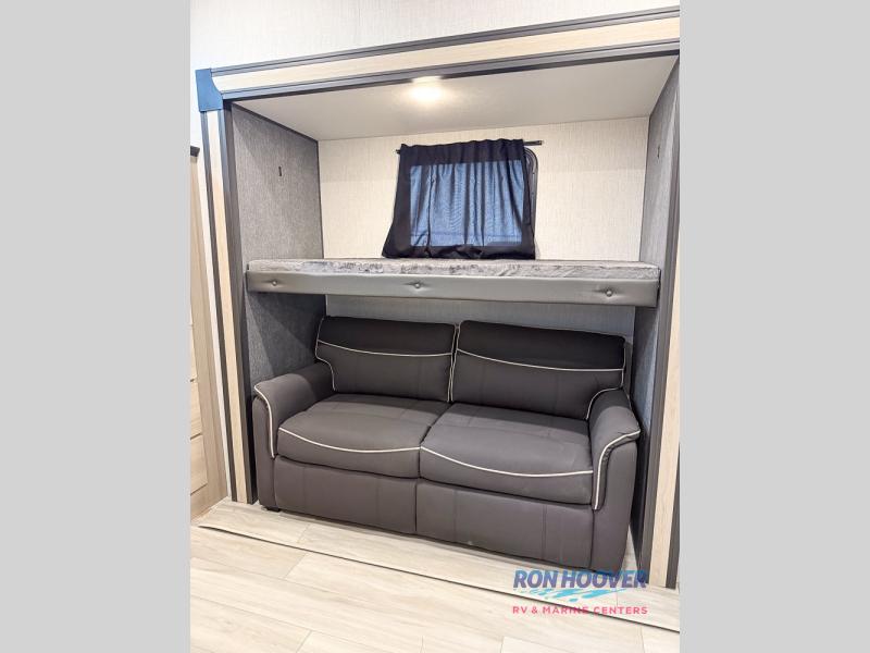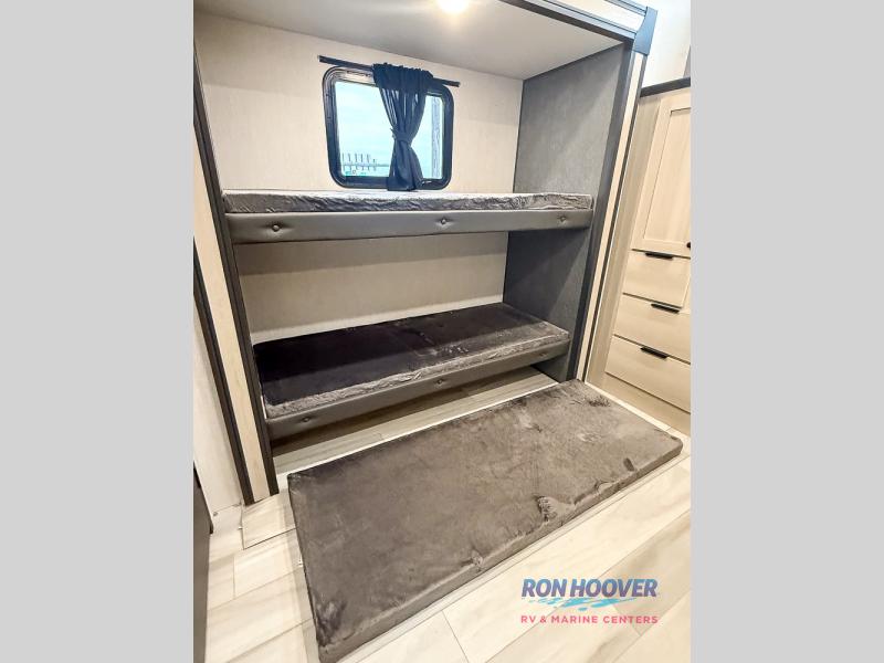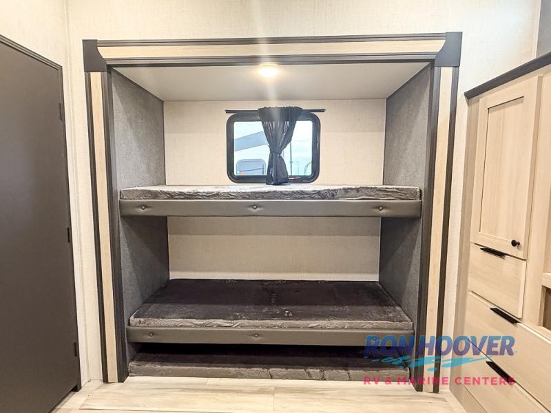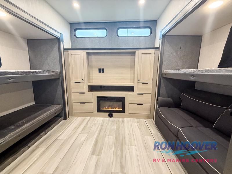 This fifth wheel's name describes it perfectly; it's the best! Your guests will love the rear private bunkhouse with dual opposing slides, bunk beds, plus a hide-a-bed sofa and an entertainment center with dual wardrobes. There is even a half bath with its own exterior entry door! You will have the front private bedroom all to yourselves with a king bed slide out and a walk-in wardrobe with washer and dryer prep. And the full bath is close by for easy nighttime use. The combined middle kitchen and living room will be a space everyone can meet in since there is a hi-top table and chairs and theater seating, an entertainment center with a fireplace, plus a kitchen island where snacks can be set out.