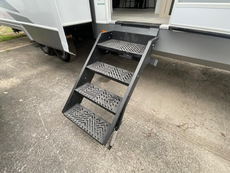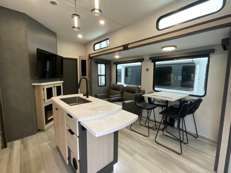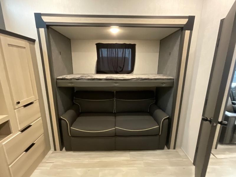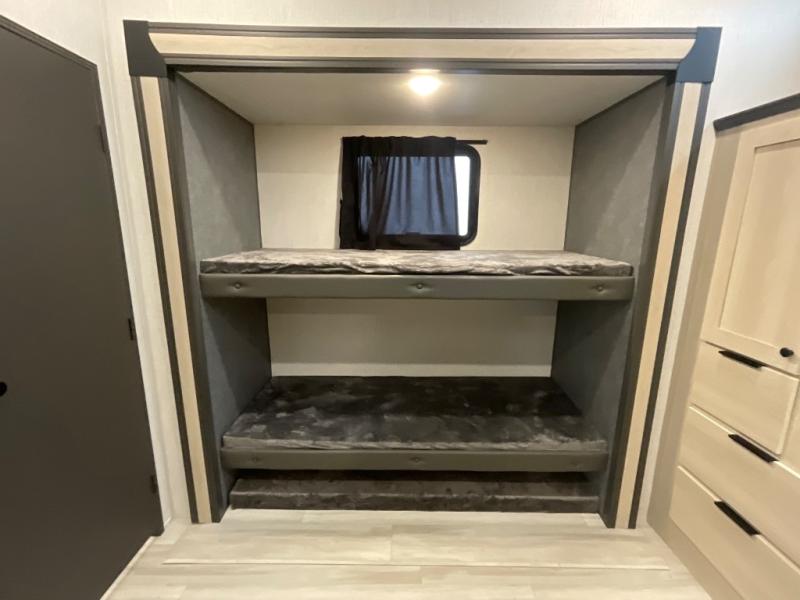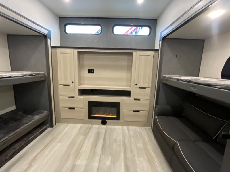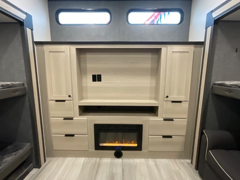 This fifth wheel's name describes it perfectly; it's the best! Your guests will love the rear private bunkhouse with dual opposing slides, bunk beds, plus a hide-a-bed sofa and an entertainment center with dual wardrobes. There is even a half bath with its own exterior entry door! You will have the front private bedroom all to yourselves with a king bed slide out and a walk-in wardrobe with washer and dryer prep. And the full bath is close by for easy nighttime use. The combined middle kitchen and living room will be a space everyone can meet in since there is a hi-top table and chairs and theater seating, an entertainment center with a fireplace, plus a kitchen island where snacks can be set out.