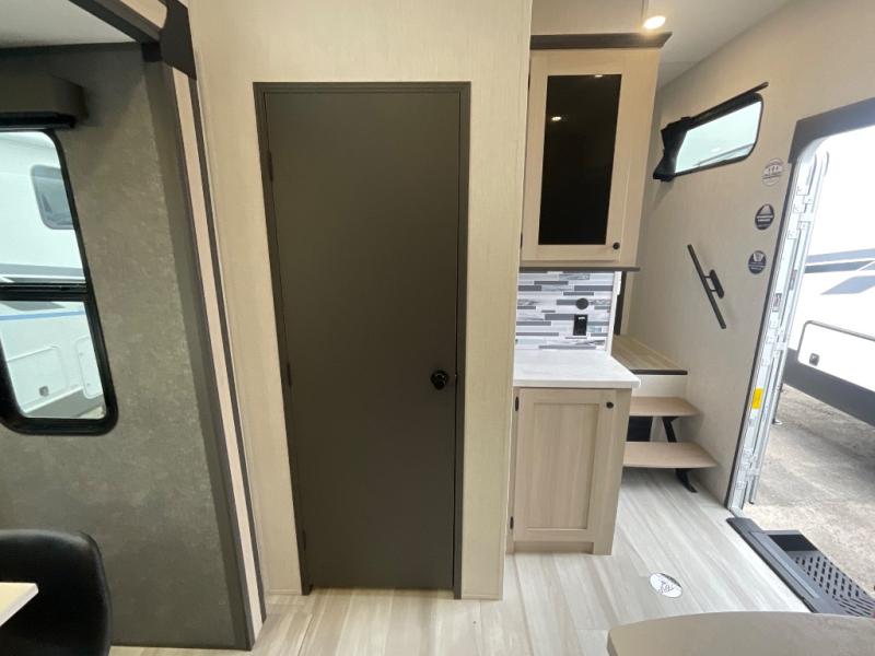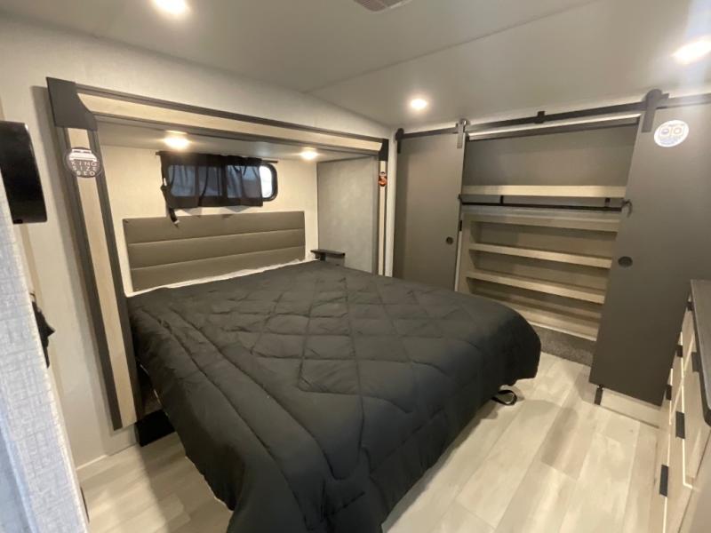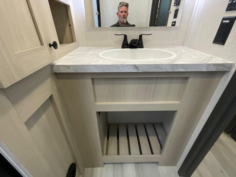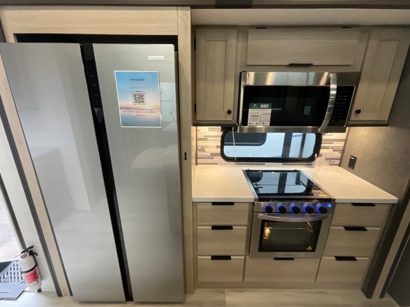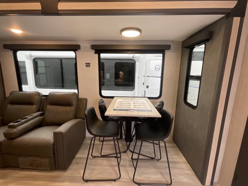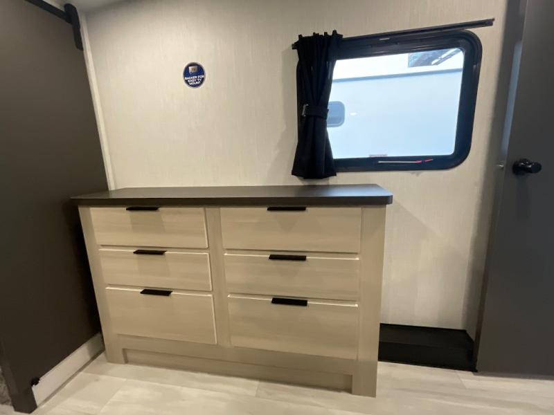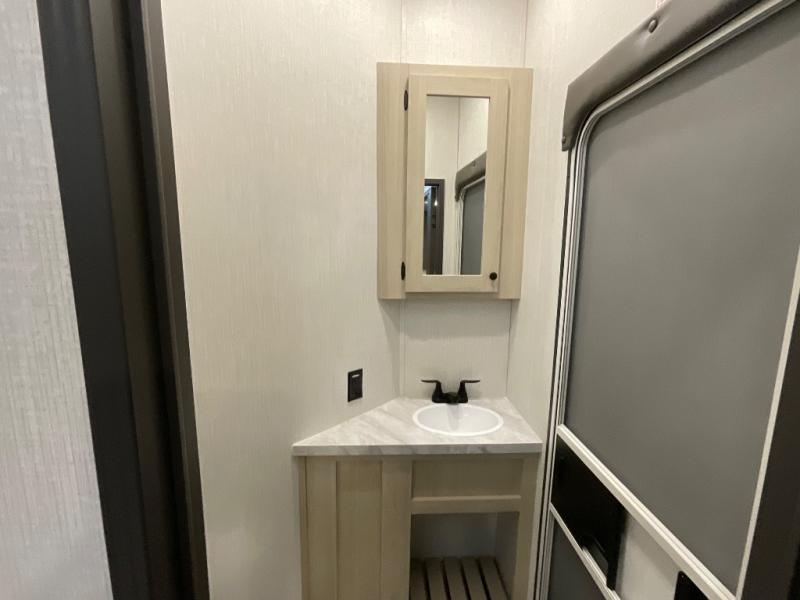 This fifth wheel's name describes it perfectly; it's the best! Your guests will love the rear private bunkhouse with dual opposing slides, bunk beds, plus a hide-a-bed sofa and an entertainment center with dual wardrobes. There is even a half bath with its own exterior entry door! You will have the front private bedroom all to yourselves with a king bed slide out and a walk-in wardrobe with washer and dryer prep. And the full bath is close by for easy nighttime use. The combined middle kitchen and living room will be a space everyone can meet in since there is a hi-top table and chairs and theater seating, an entertainment center with a fireplace, plus a kitchen island where snacks can be set out.
