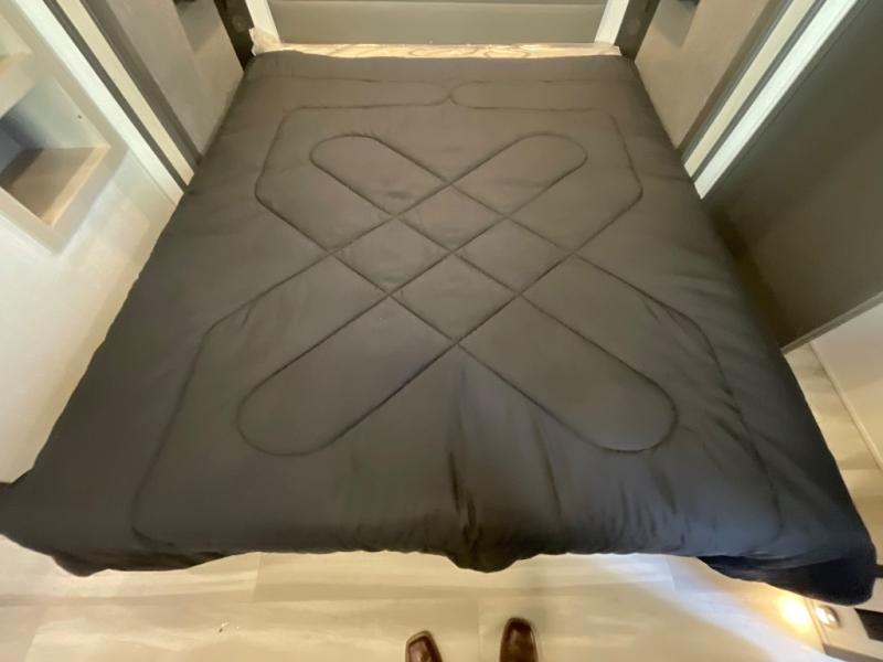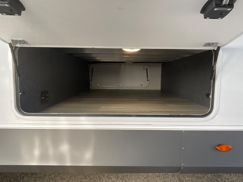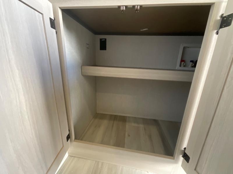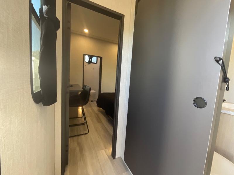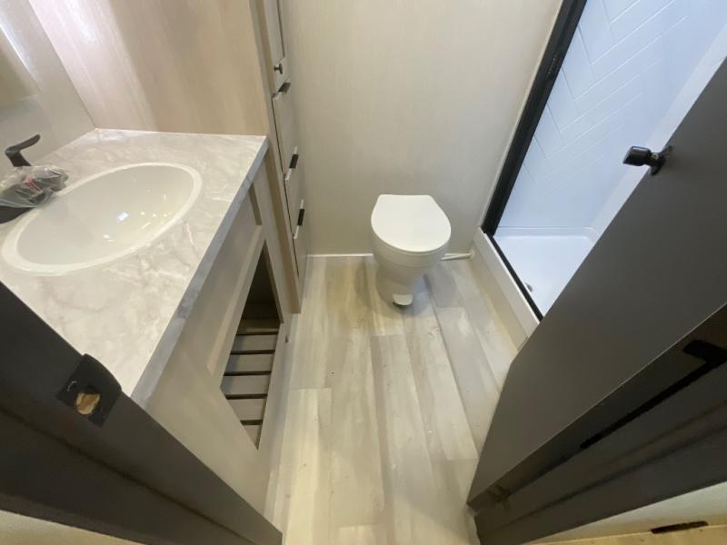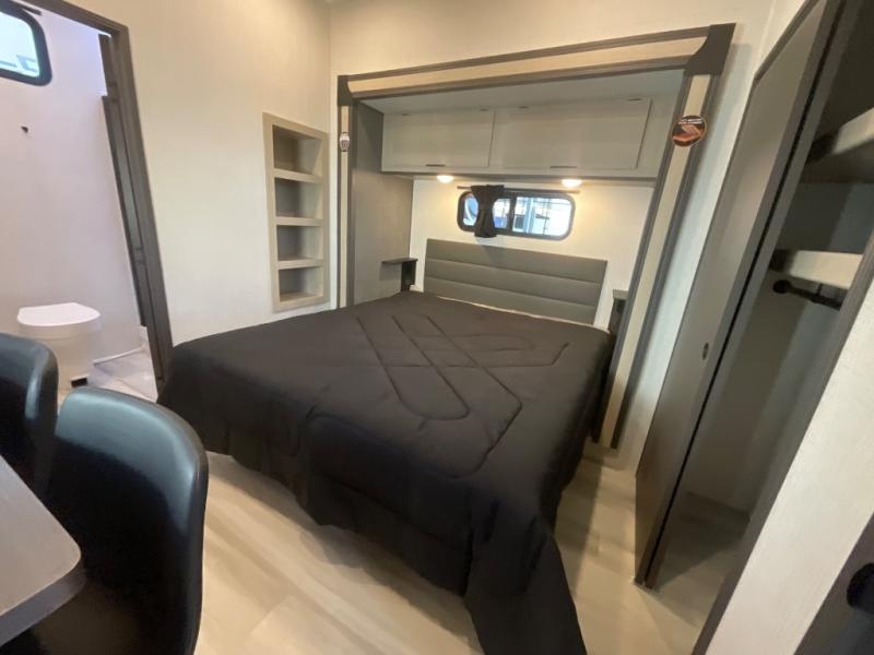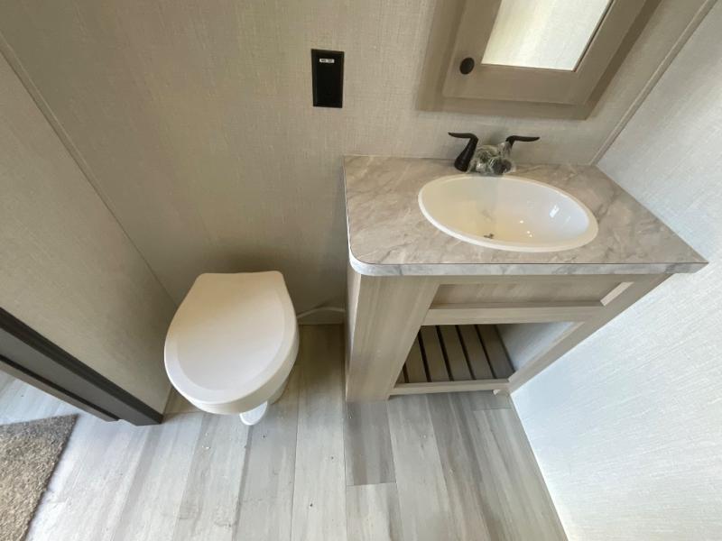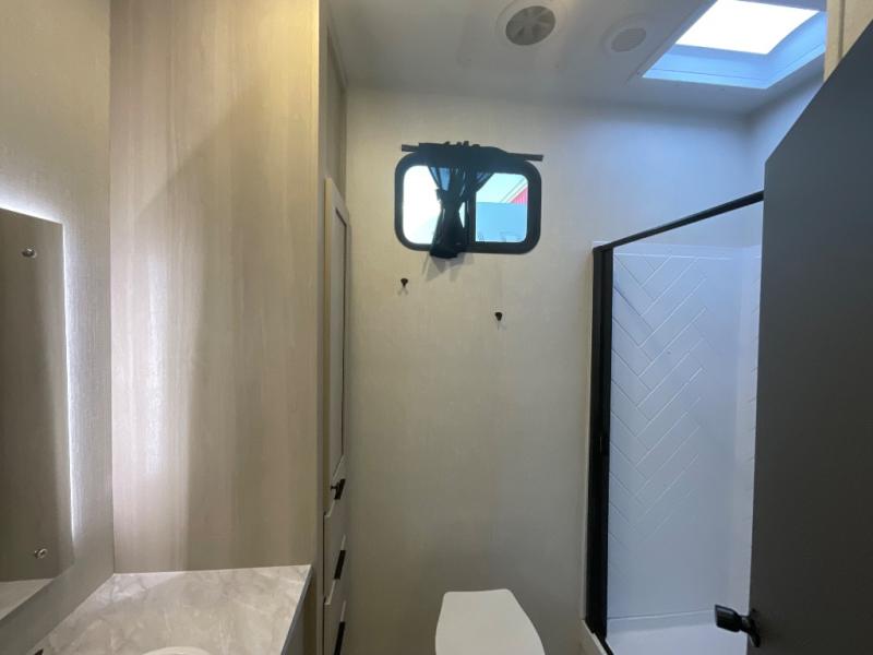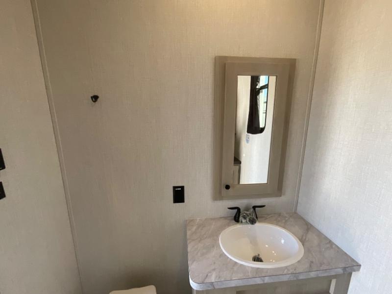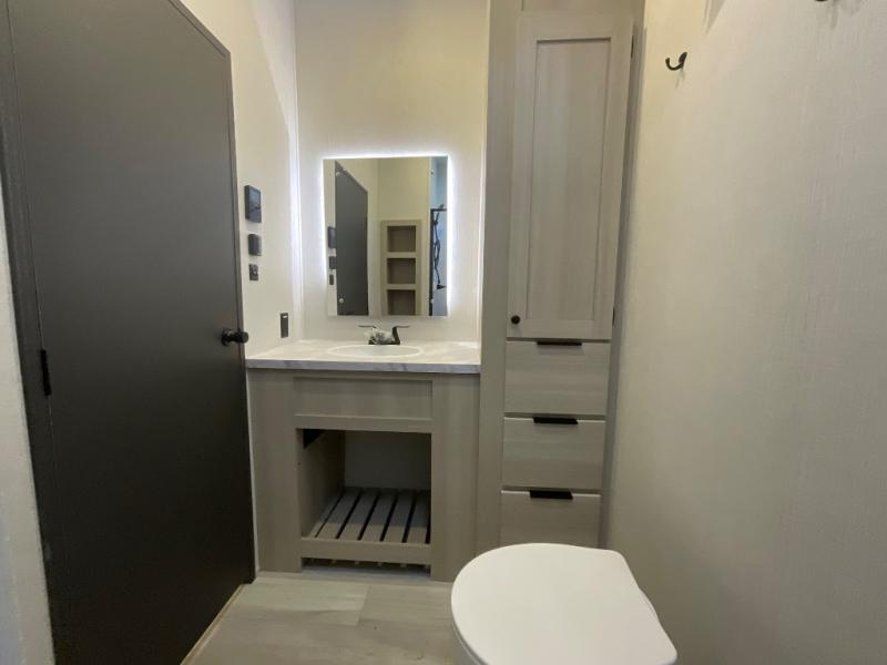 At the front, you’ll find a fully equipped kitchen designed for comfort and convenience, offering ample overhead cabinetry, a spacious 16 cu. ft. refrigerator, a 30" microwave, and a 21" 2-in-1 oven range to handle everything from quick snacks to full meals. Enjoy dining or game nights at the Hi-Top table and chairs before moving into the inviting living room, which provides generous seating for movie nights with loved ones, including theater seating and two tri-fold hide-a-bed sofas that easily convert into additional sleeping space when needed. Adjacent to the living area is a convenient half bath featuring a folding table for laundry. Toward the front, the private bedroom offers a relaxing retreat with a 66" x 80" king bed in a slide-out for added floor space, a wardrobe for clothing and essentials, and a desk/vanity across from the bed for work or getting ready for the day. Completing the layout at the rear is a full bathroom equipped with a foot-flush toilet, a walk-in shower, and a linen closet to keep toiletries neatly organized.