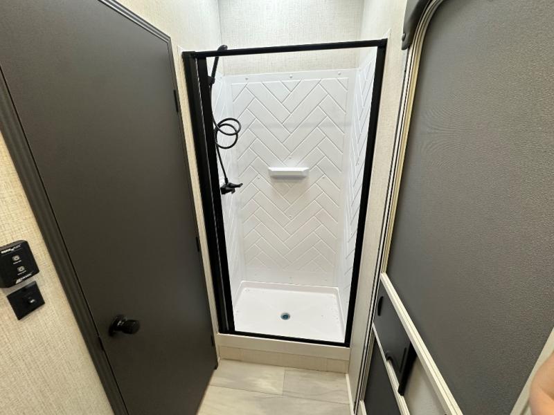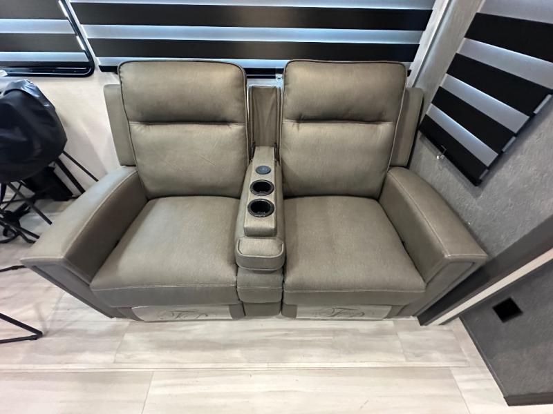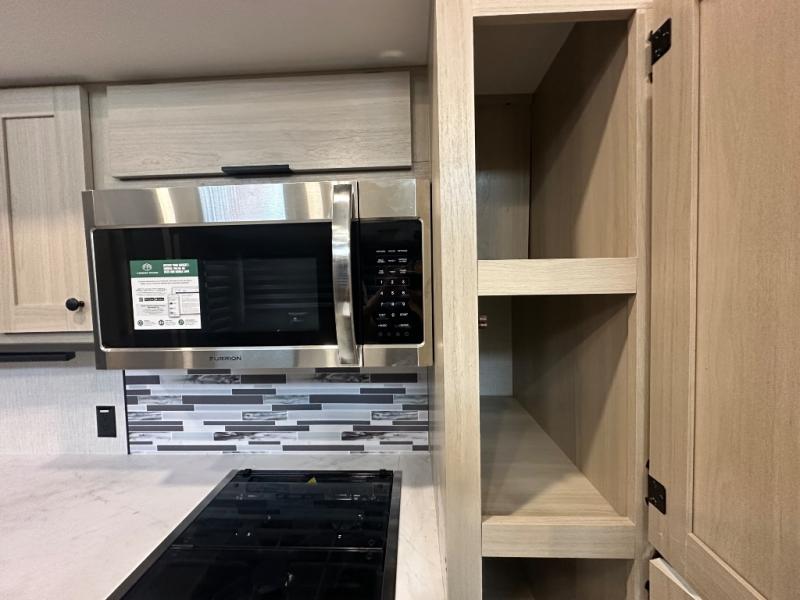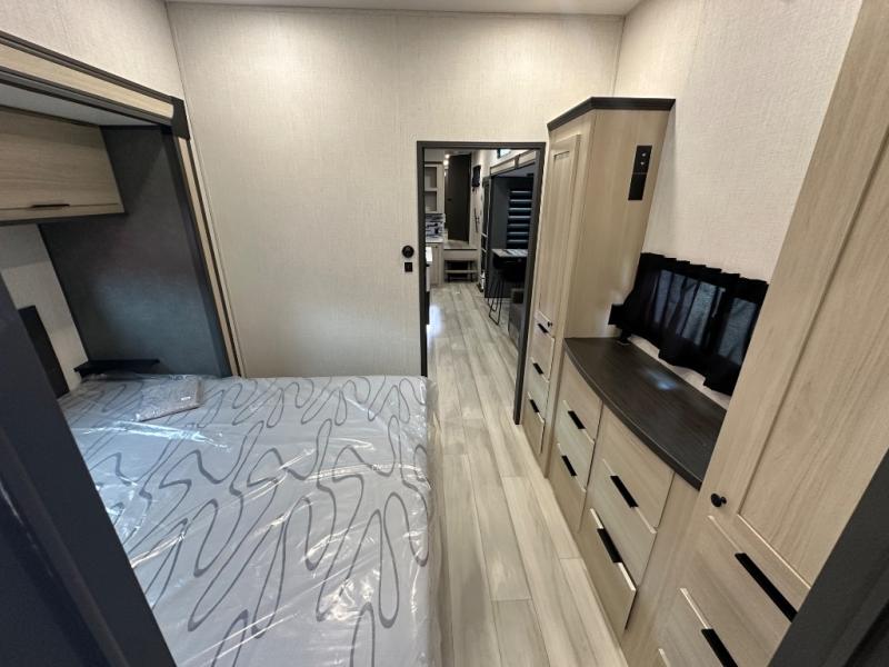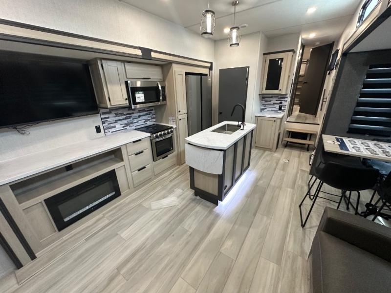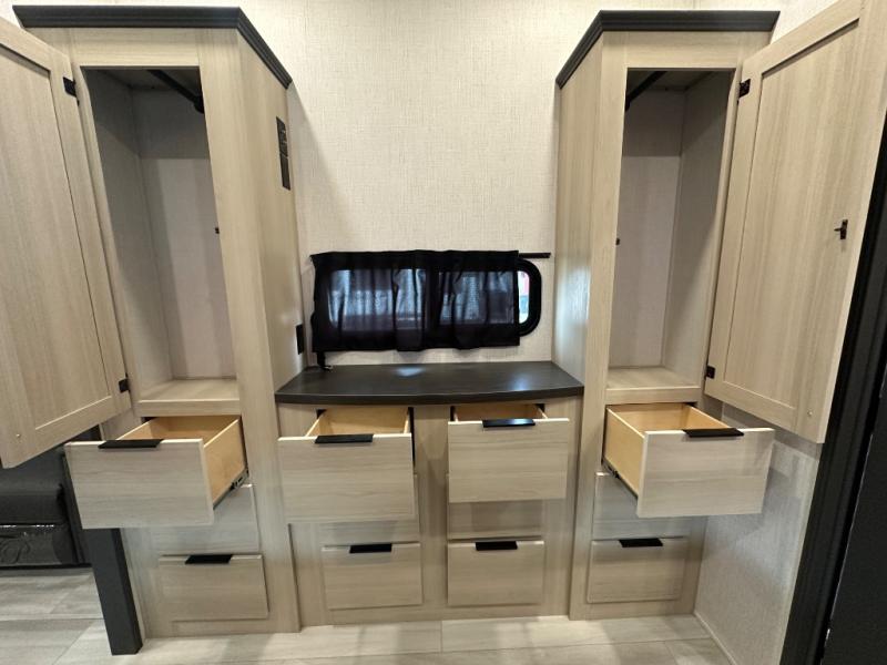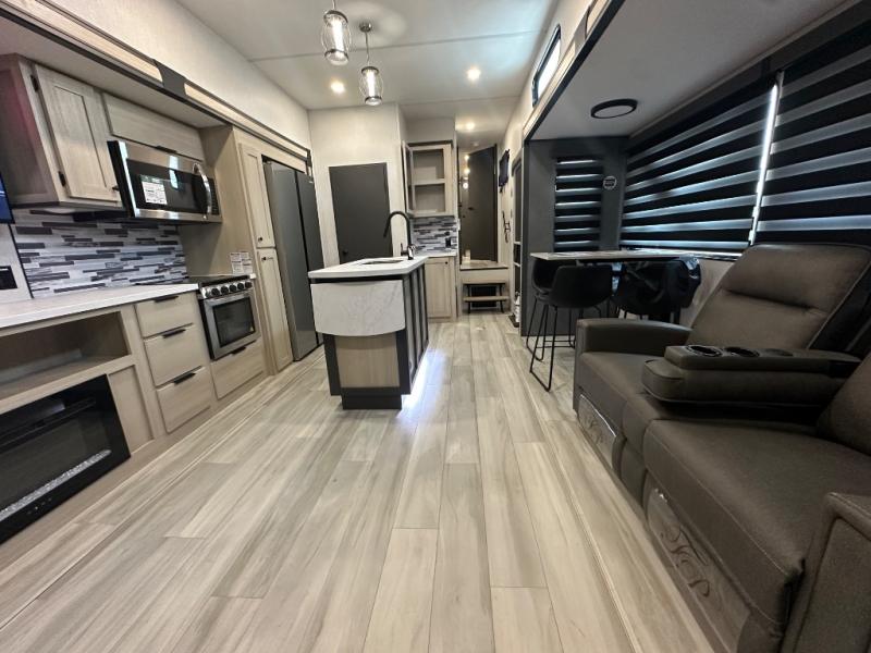 With two full baths, two bedrooms, and two entry doors, this fifth wheel is packed with comfort! The front bedroom includes a queen bed slide out, dresser, and front walk-in wardrobe with washer and dryer prep. And there is a full bath close by for easy access. You'll find another queen bed slide in the rear master bedroom, along with dual wardrobes and a dresser, plus a full rear bath with its own exterior entry door. In the morning, everyone can meet in the middle kitchen and living room while the chef prepares breakfast with the 21" 2-in-1 oven. There is a hi-top table and chairs for dining, theater seating for relaxing, and a flip-up counter at the island for even more counter space. You can set up your Keurig machine at the coffee bar, and the two pantries plus 16 cu. ft. 12V refrigerator will allow you to keep food stocked!