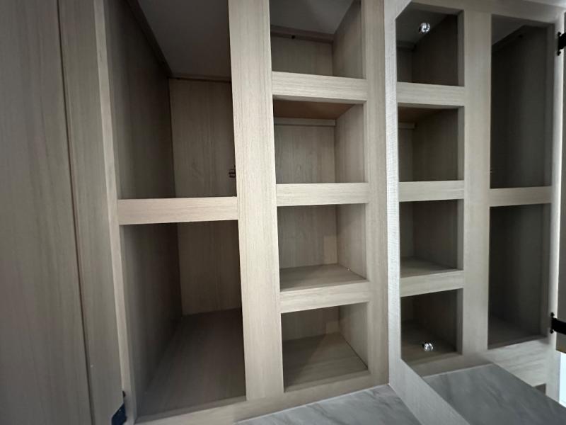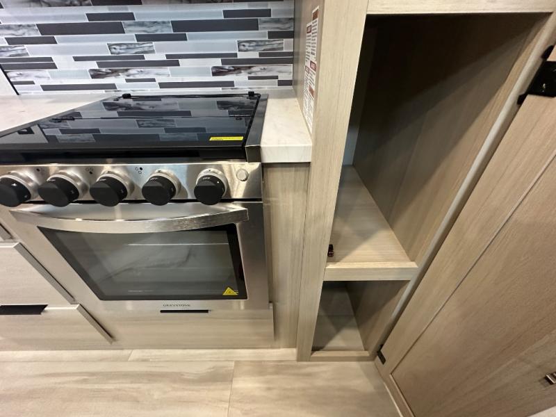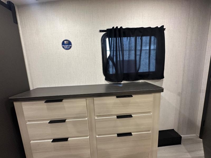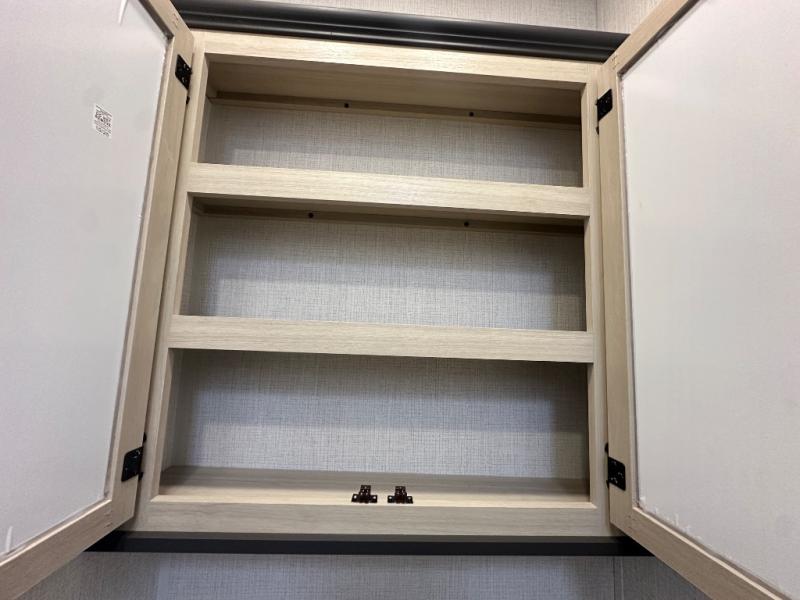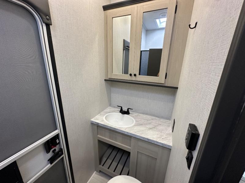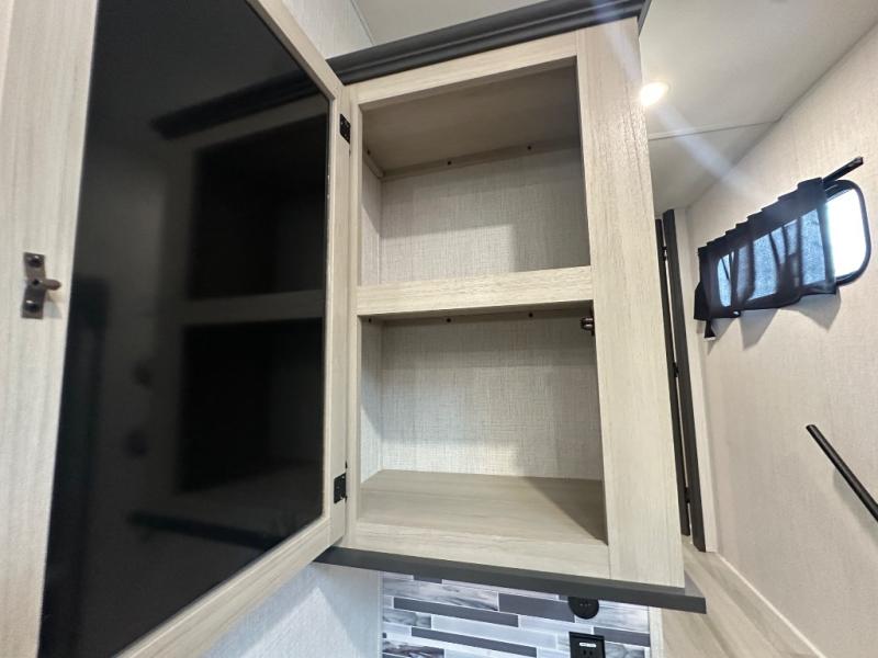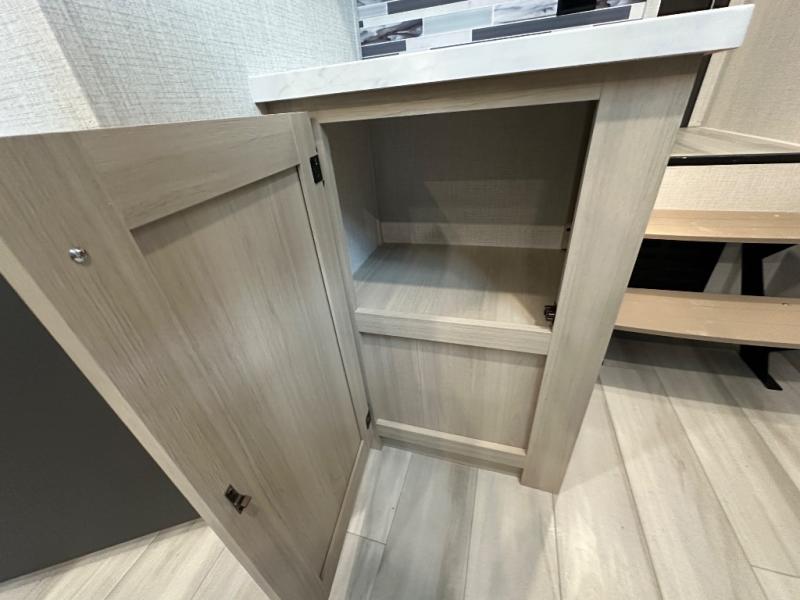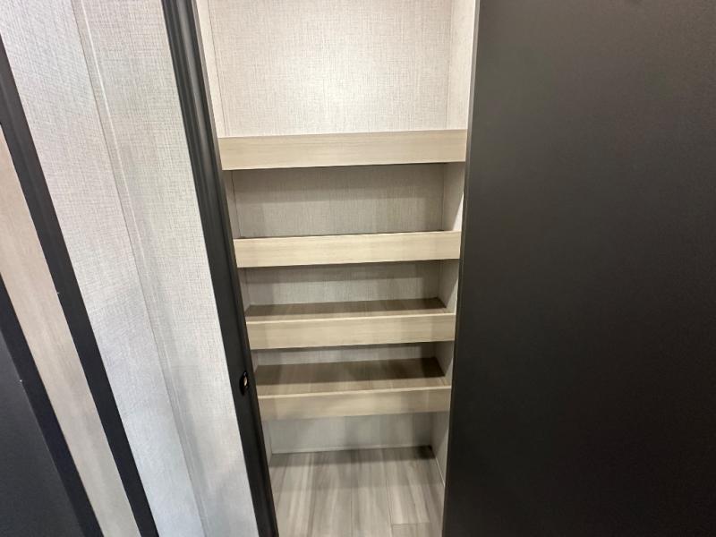 With two full baths, two bedrooms, and two entry doors, this fifth wheel is packed with comfort! The front bedroom includes a queen bed slide out, dresser, and front walk-in wardrobe with washer and dryer prep. And there is a full bath close by for easy access. You'll find another queen bed slide in the rear master bedroom, along with dual wardrobes and a dresser, plus a full rear bath with its own exterior entry door. In the morning, everyone can meet in the middle kitchen and living room while the chef prepares breakfast with the 21" 2-in-1 oven. There is a hi-top table and chairs for dining, theater seating for relaxing, and a flip-up counter at the island for even more counter space. You can set up your Keurig machine at the coffee bar, and the two pantries plus 16 cu. ft. 12V refrigerator will allow you to keep food stocked!