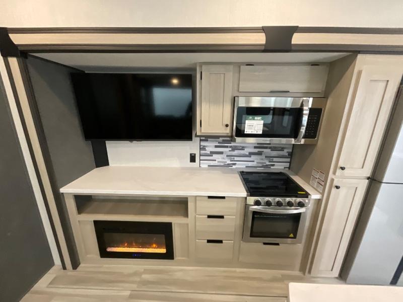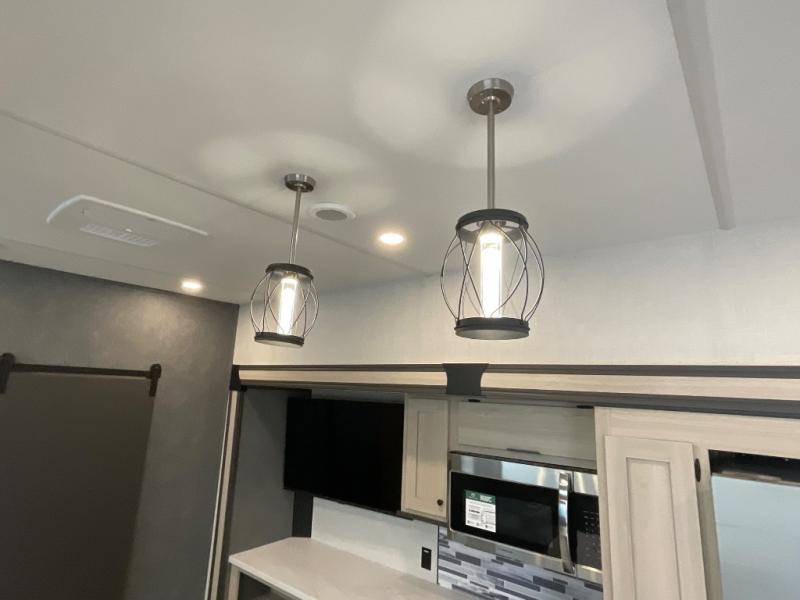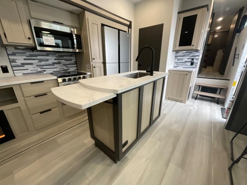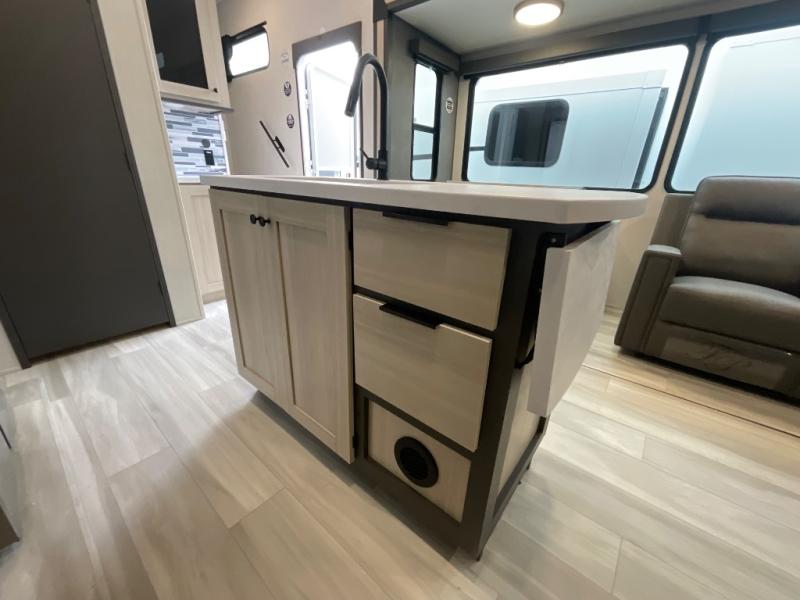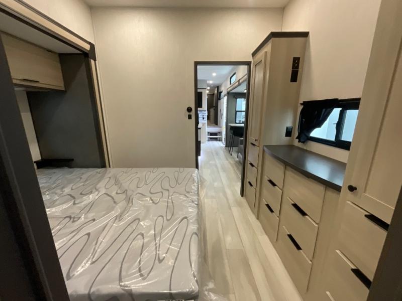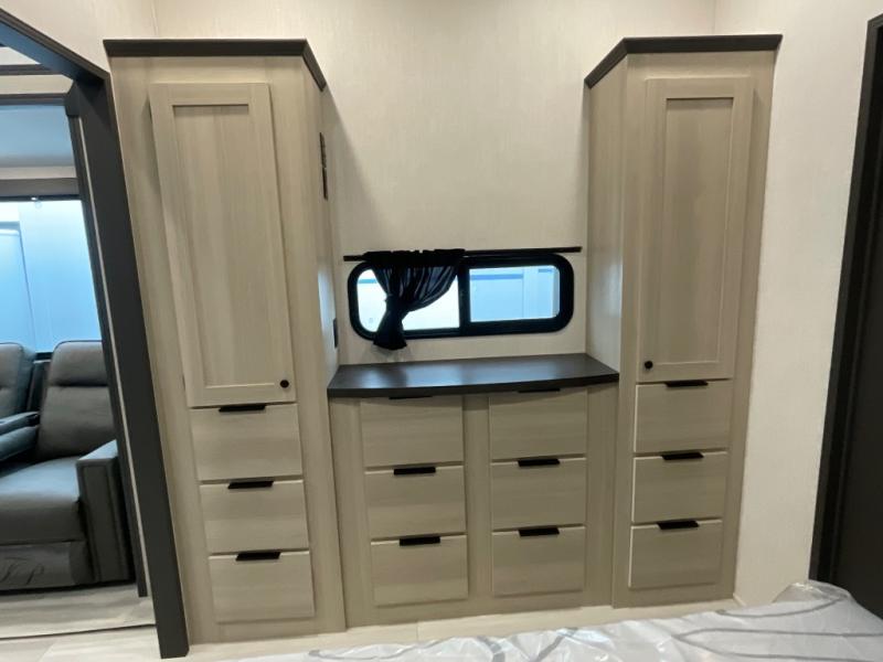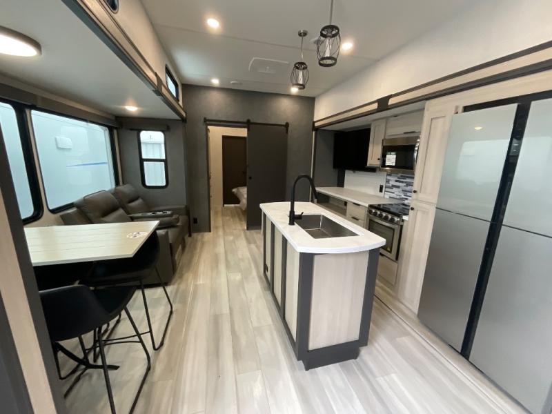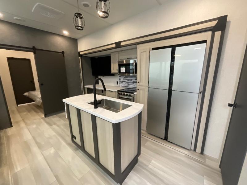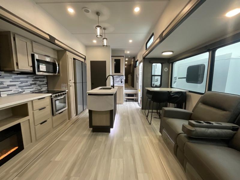 With two full baths, two bedrooms, and two entry doors, this fifth wheel is packed with comfort! The front bedroom includes a queen bed slide out, dresser, and front walk-in wardrobe with washer and dryer prep. And there is a full bath close by for easy access. You'll find another queen bed slide in the rear master bedroom, along with dual wardrobes and a dresser, plus a full rear bath with its own exterior entry door. In the morning, everyone can meet in the middle kitchen and living room while the chef prepares breakfast with the 21" 2-in-1 oven. There is a hi-top table and chairs for dining, theater seating for relaxing, and a flip-up counter at the island for even more counter space. You can set up your Keurig machine at the coffee bar, and the two pantries plus 16 cu. ft. 12V refrigerator will allow you to keep food stocked!