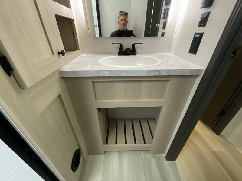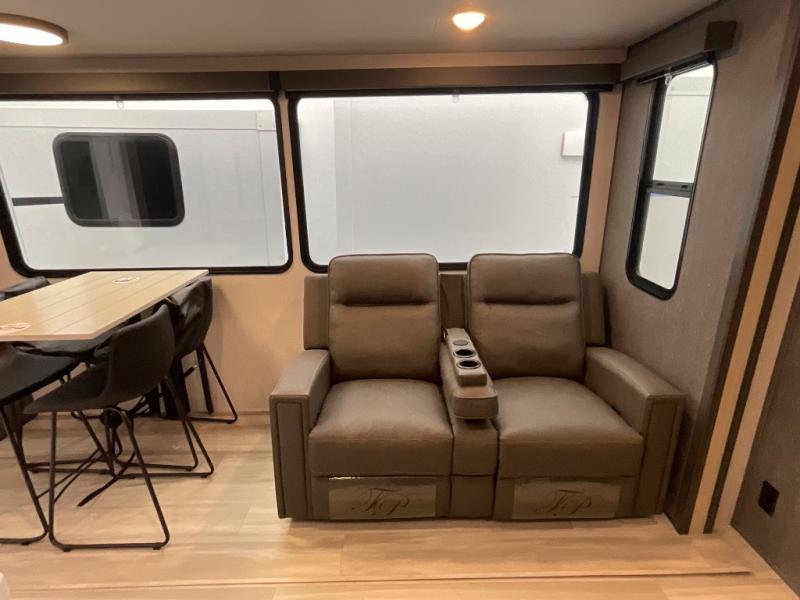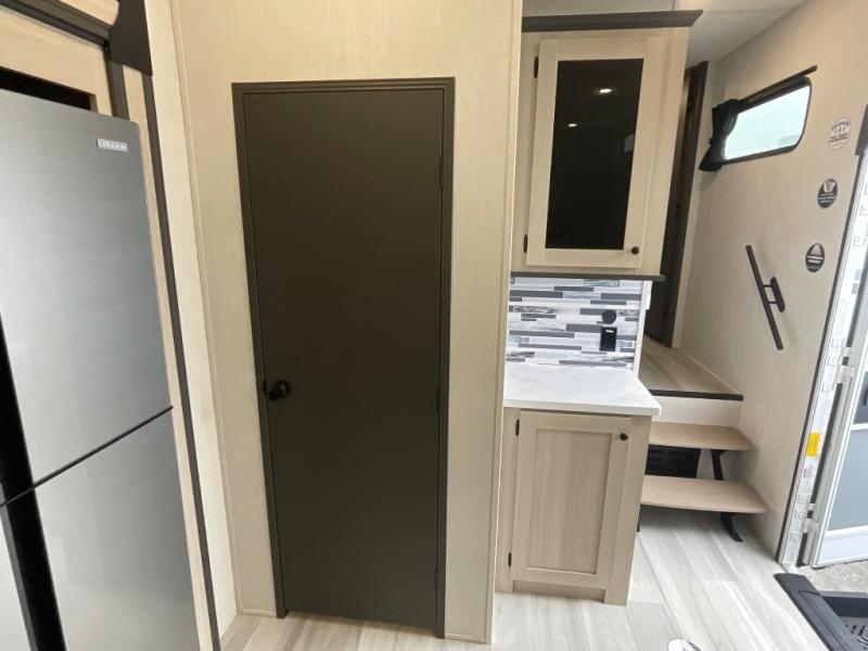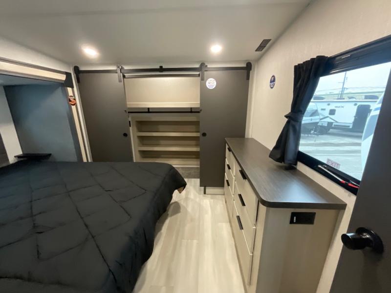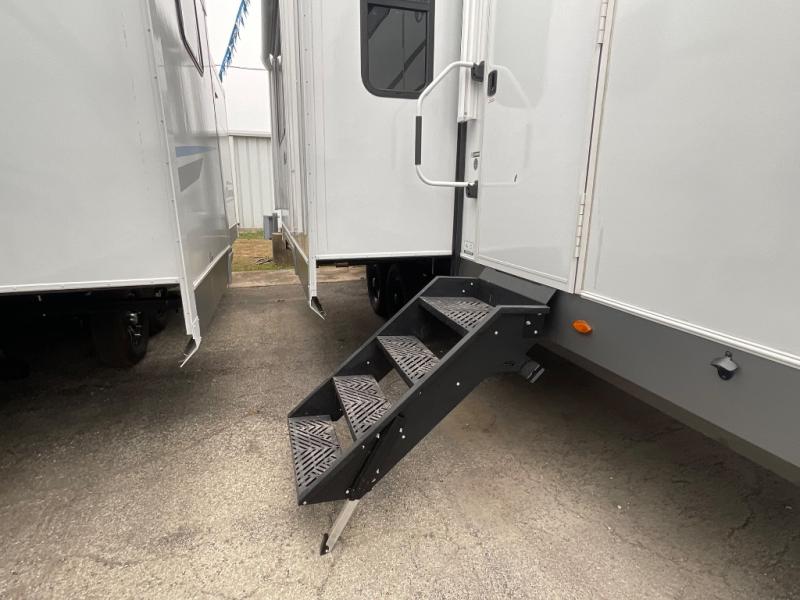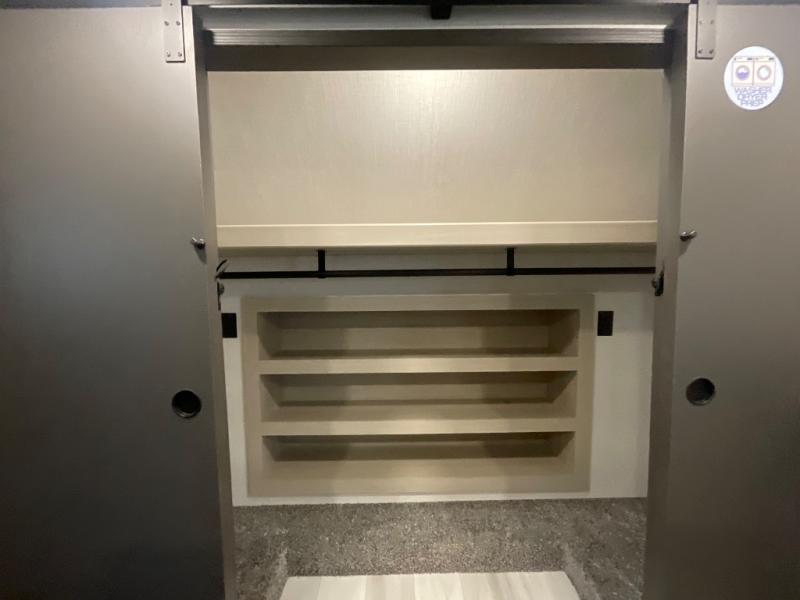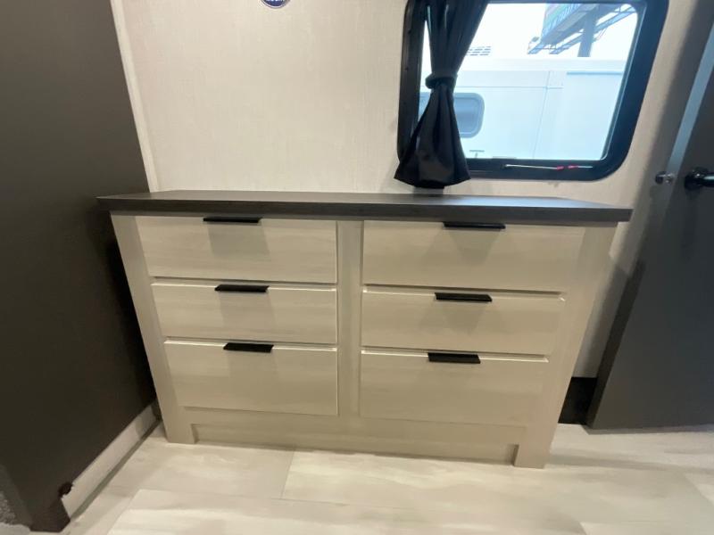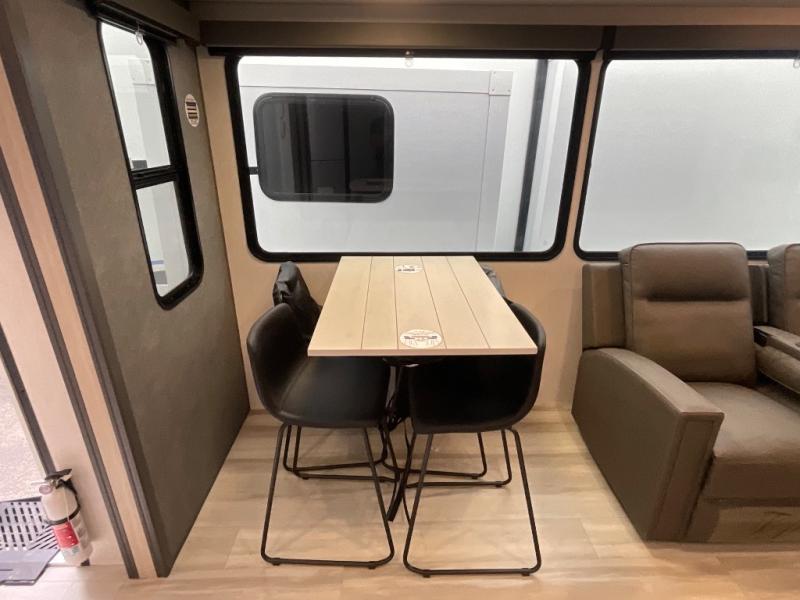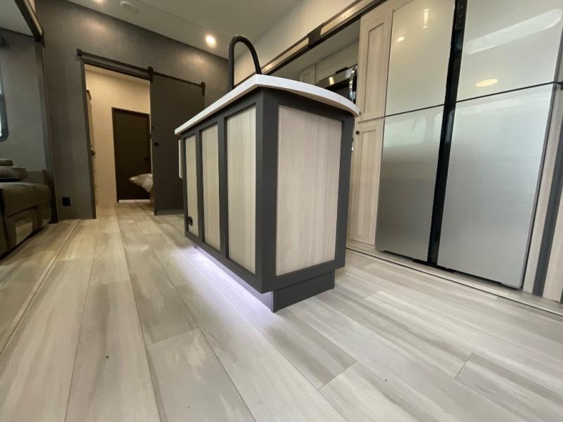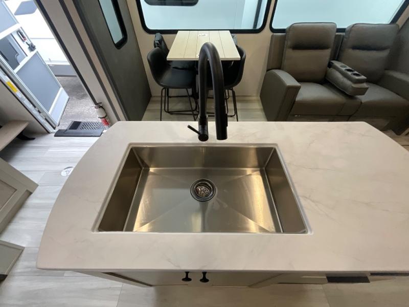 With two full baths, two bedrooms, and two entry doors, this fifth wheel is packed with comfort! The front bedroom includes a queen bed slide out, dresser, and front walk-in wardrobe with washer and dryer prep. And there is a full bath close by for easy access. You'll find another queen bed slide in the rear master bedroom, along with dual wardrobes and a dresser, plus a full rear bath with its own exterior entry door. In the morning, everyone can meet in the middle kitchen and living room while the chef prepares breakfast with the 21" 2-in-1 oven. There is a hi-top table and chairs for dining, theater seating for relaxing, and a flip-up counter at the island for even more counter space. You can set up your Keurig machine at the coffee bar, and the two pantries plus 16 cu. ft. 12V refrigerator will allow you to keep food stocked!