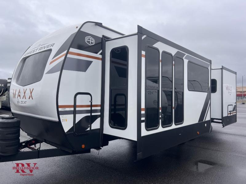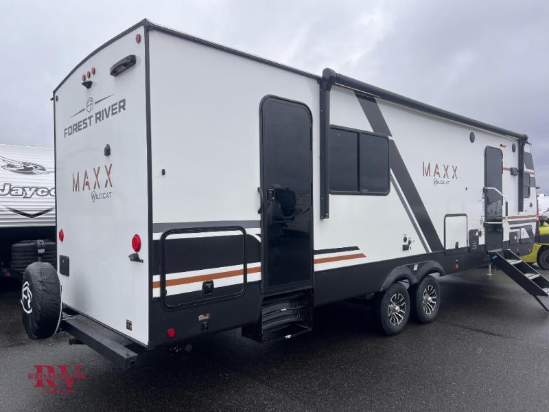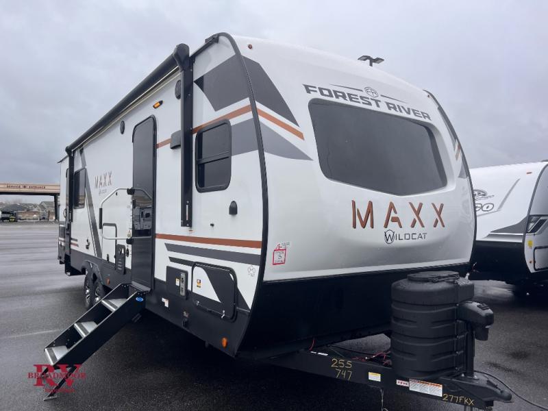 Each Forest River Wildcat MAXX travel trailer is constructed with 2" thick Vacuum-Bonded sidewalls, Maxx-strength aluminum-framed laminated floor, and reflective Astro-Foil insulation in the roof for added protection. The Dynamic Technology Package includes a frame-mounted receiver hitch, a battery disconnect, and a 200-watt solar panel for off-grid capabilities. You will also enjoy the Peak Package with a power tongue jack, solid surface kitchen countertops, a 21" 2-In-1 range and oven, an on-demand tankless water heater, and more convenient features.
