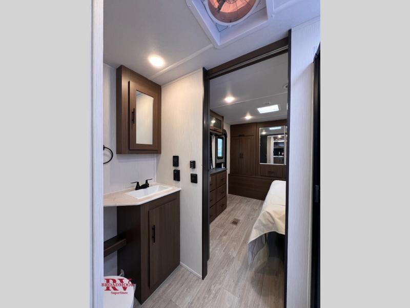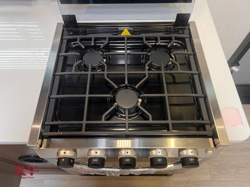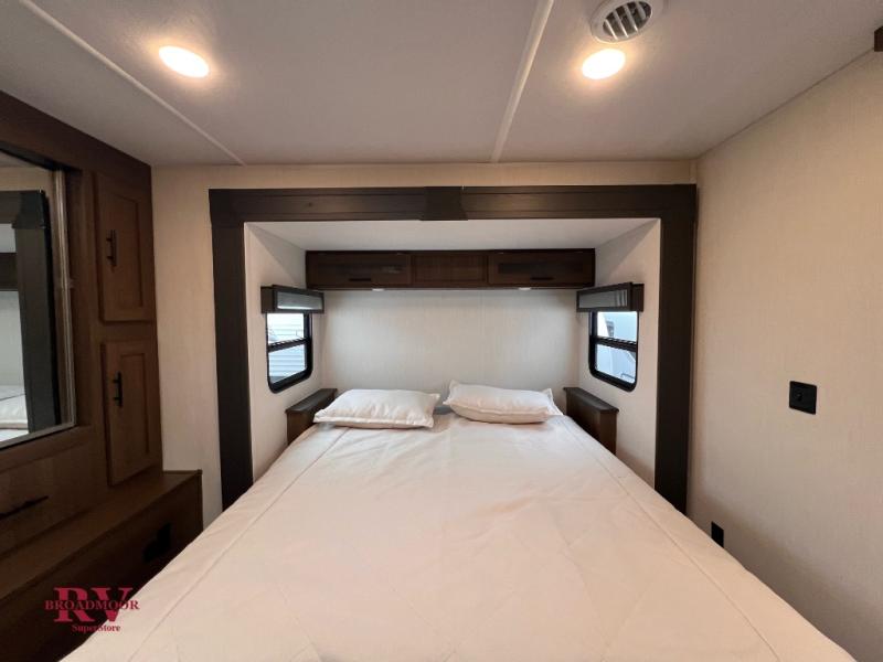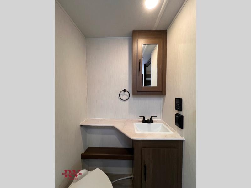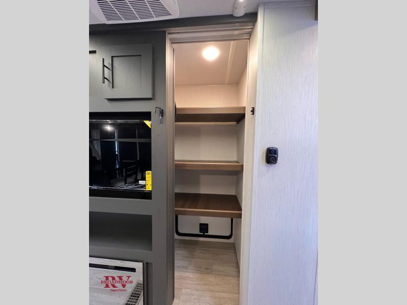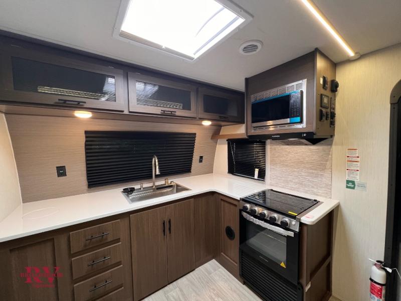 Wherever you decide to camp, you can be sure to have at-home comforts in this double slide out travel trailer. The front kitchen is any chef's dream with its large counter space, 12V refrigerator and a hidden pantry, and the front windshield will provide great views as you cook. Your crew can relax on the sofa sleeper across from the Smart TV, or play a game at the booth dinette with storage below. The walk-thru bath will create a rear master bedroom you are sure to love. There is a Maxx king bed here, a dresser and a large wardrobe, complete with washer and dryer prep. You'll even find the second entry door in this room for added convenience!