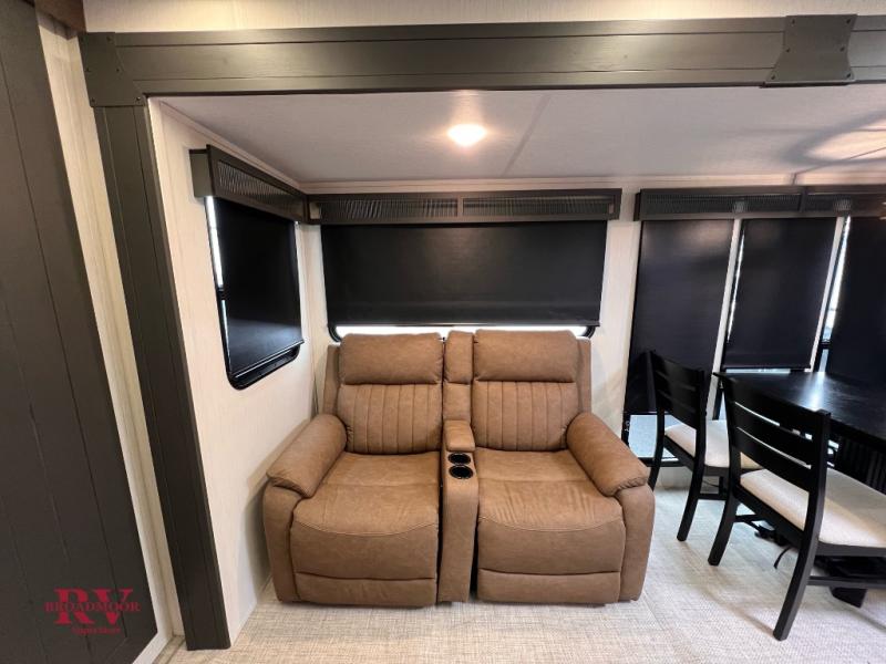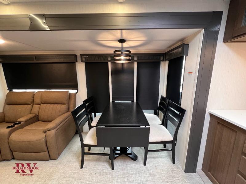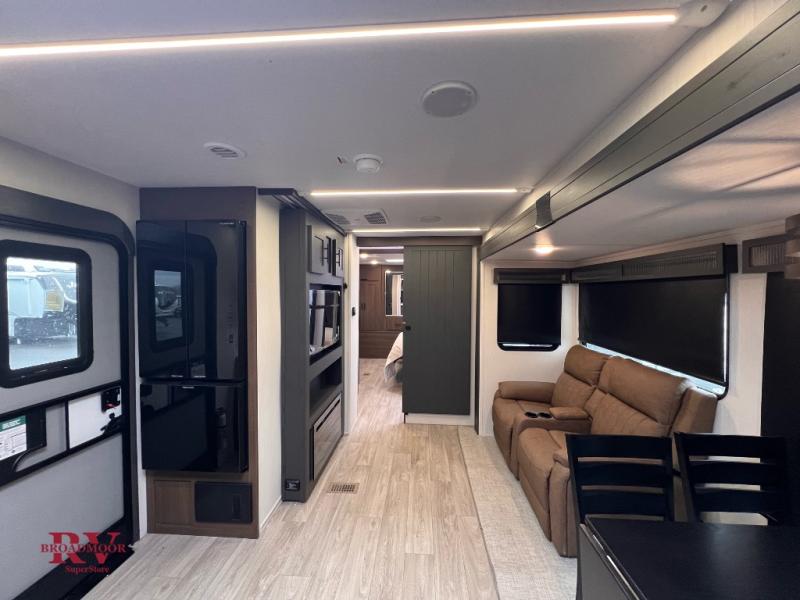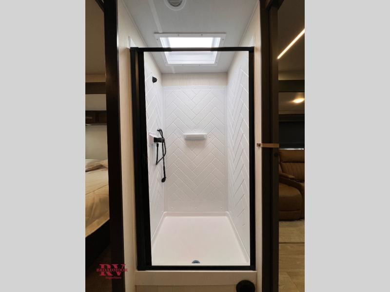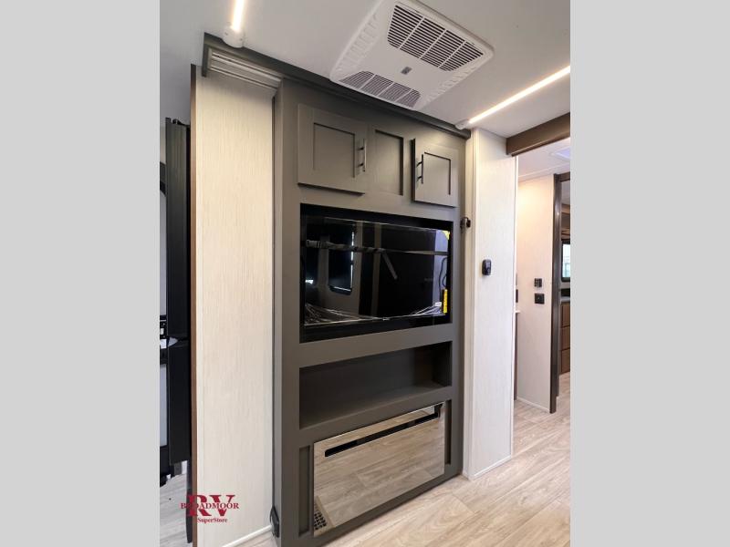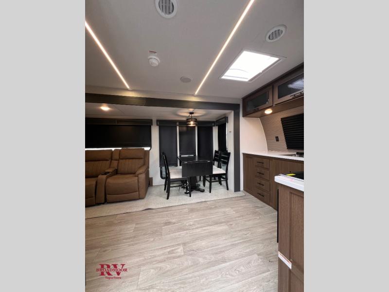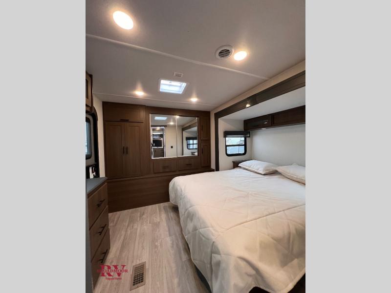 Wherever you decide to camp, you can be sure to have at-home comforts in this double slide out travel trailer. The front kitchen is any chef's dream with its large counter space, 12V refrigerator and a hidden pantry, and the front windshield will provide great views as you cook. Your crew can relax on the sofa sleeper across from the Smart TV, or play a game at the booth dinette with storage below. The walk-thru bath will create a rear master bedroom you are sure to love. There is a Maxx king bed here, a dresser and a large wardrobe, complete with washer and dryer prep. You'll even find the second entry door in this room for added convenience!