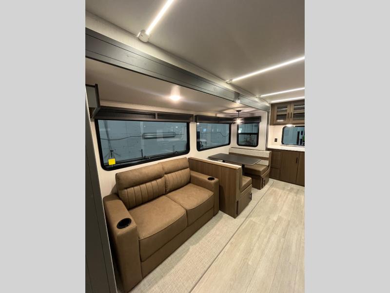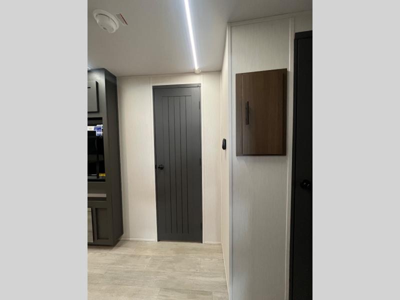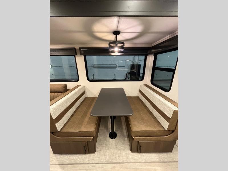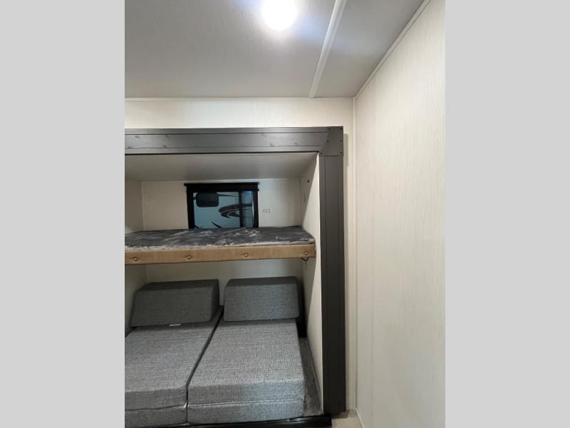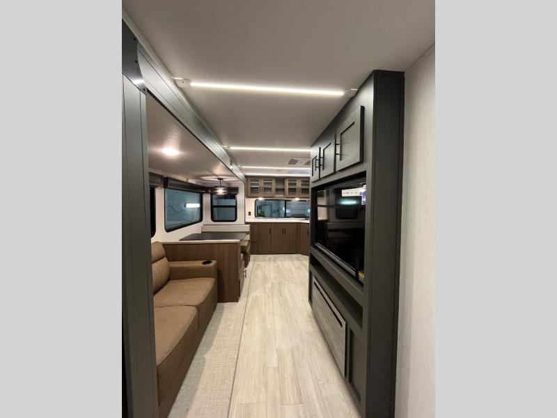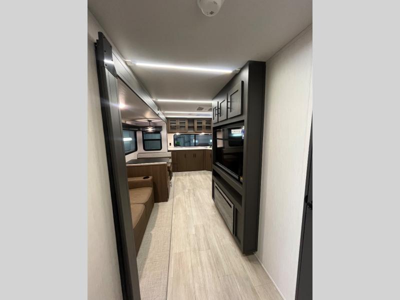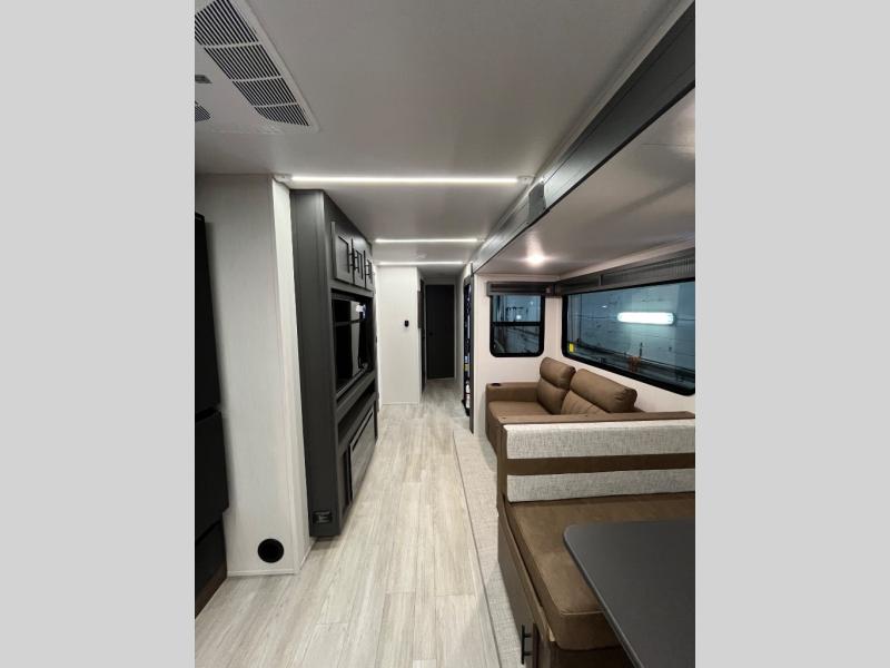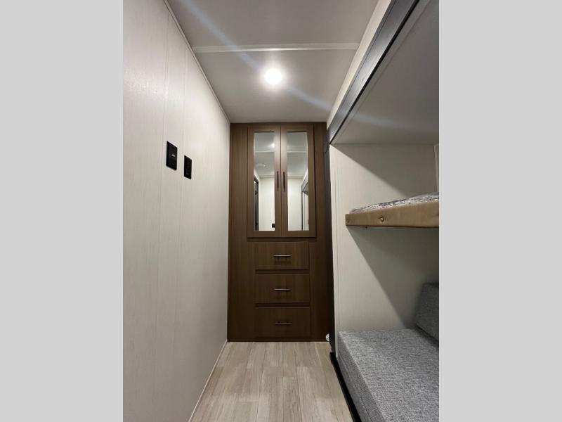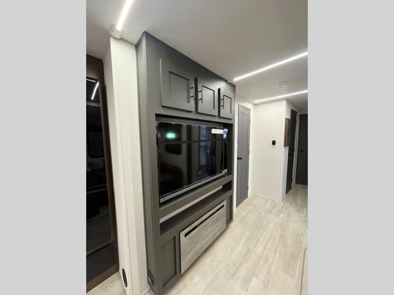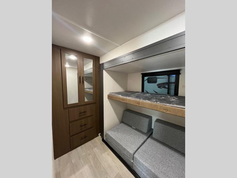 With its spacious layout and premium features, this unit will be the perfect companion for your next journey. The rear kitchen is spacious and features a microwave, 12V refrigerator, and sink, plus a booth dinette, which is perfect for enjoying meals with loved ones, while the sleeper sofa provides a comfortable spot to relax. The entertainment center is the perfect spot to catch up on your favorite shows or movies, and the fireplace crackles with warmth, creating a cozy ambiance. The front bedroom is a peaceful retreat, featuring a luxurious Maxx King bed, nightstands, and wardrobes on each side. The cherry on top is this unit’s private space, with a bunk bed and a cat-nap sleeper, a cozy retreat for kids or guests, complete with a wardrobe for storing clothes and personal items.