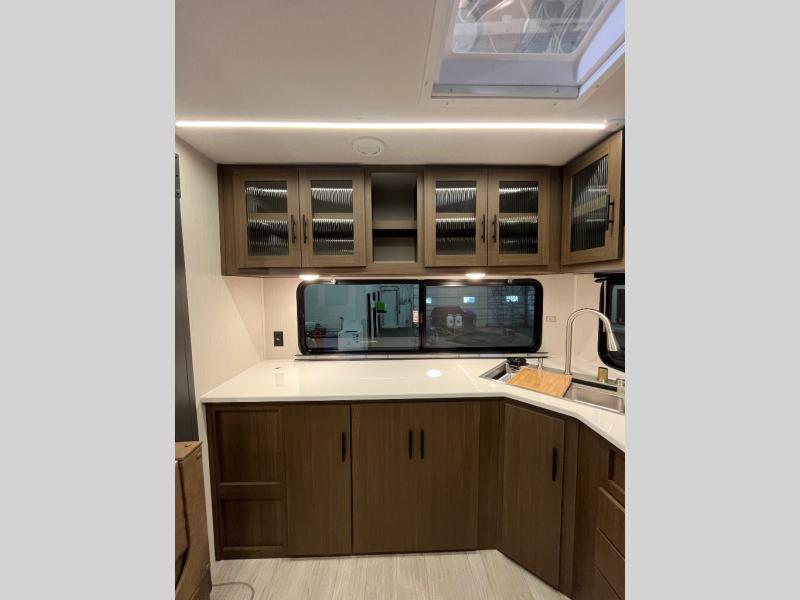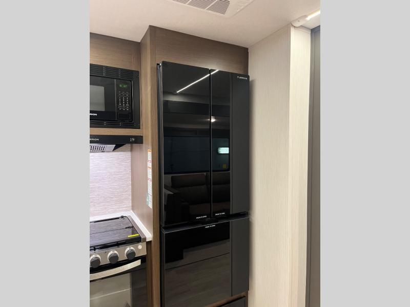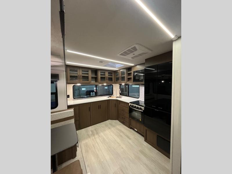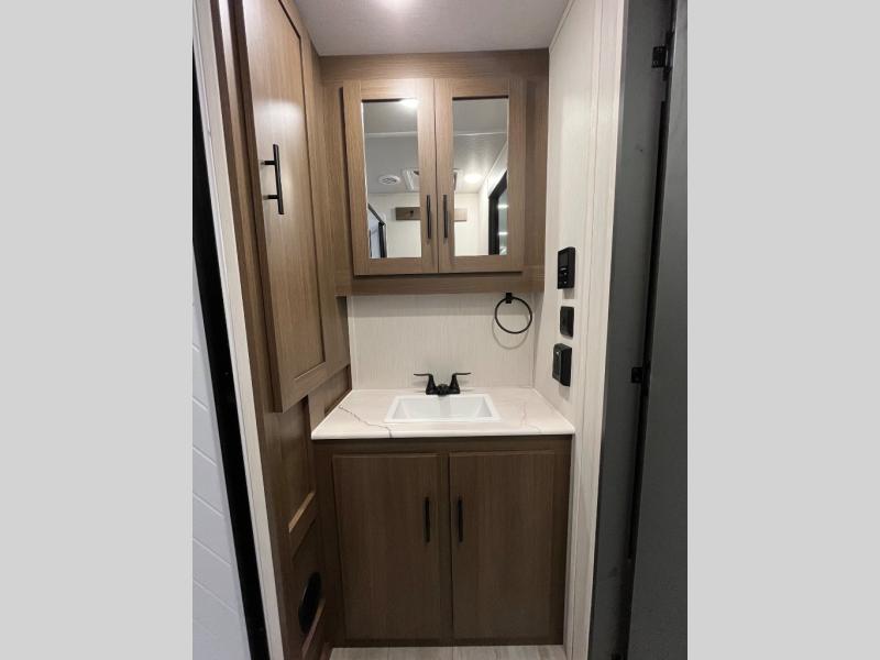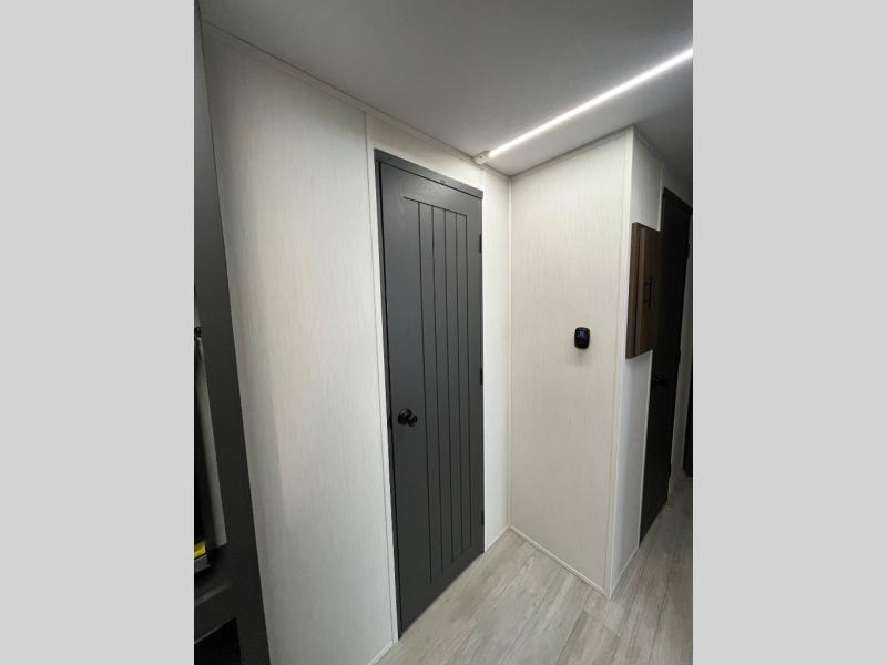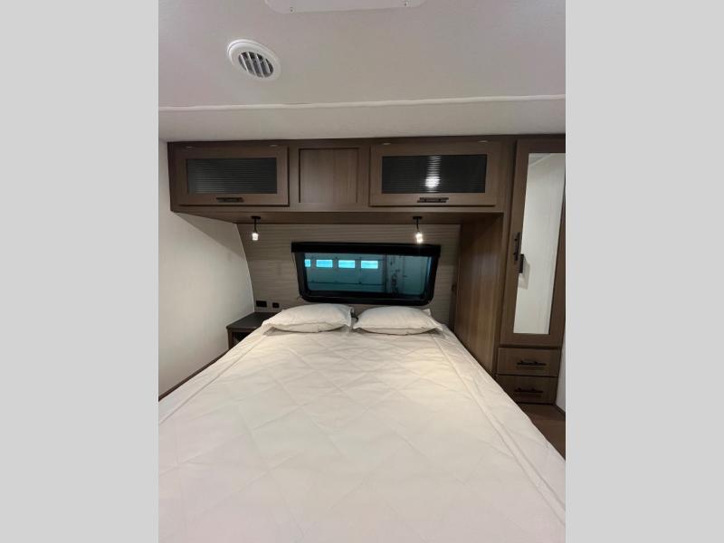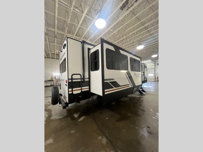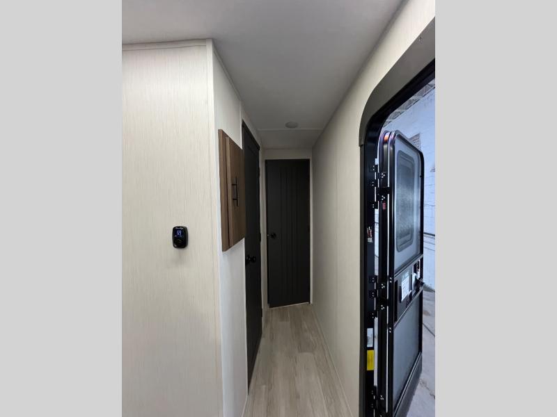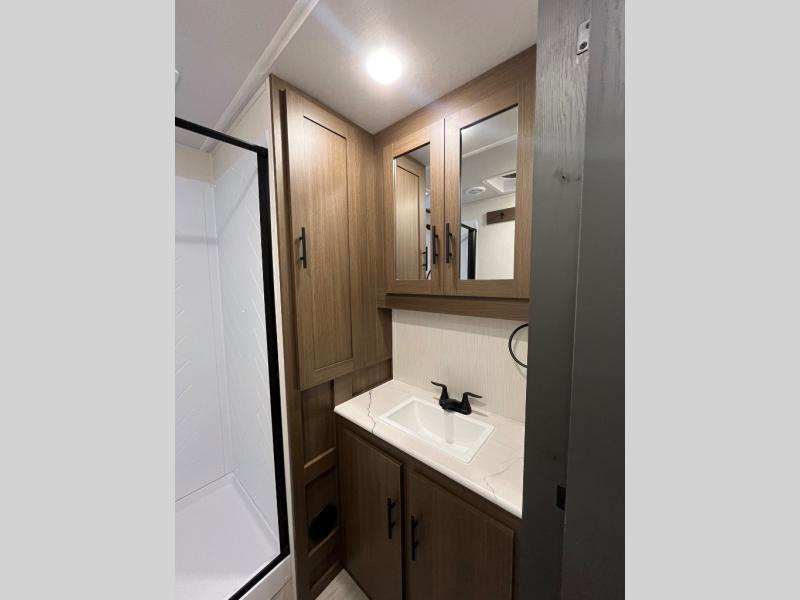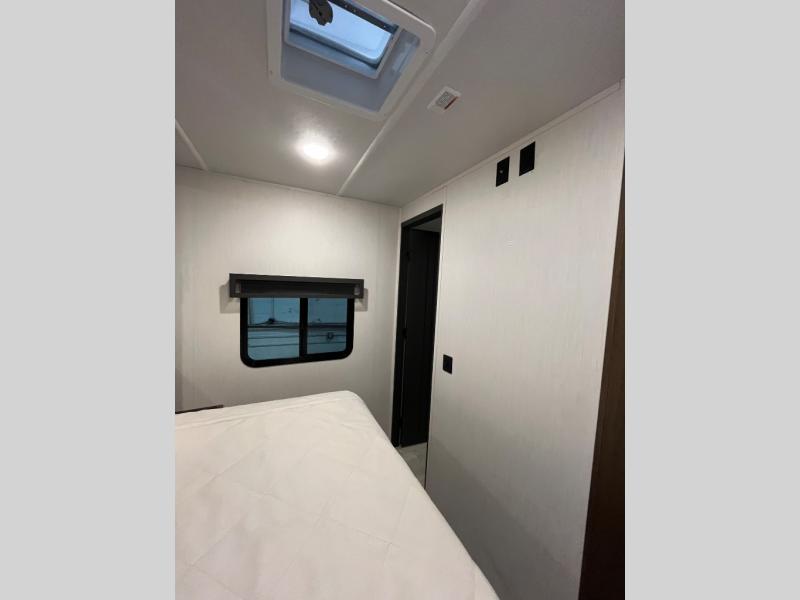 With its spacious layout and premium features, this unit will be the perfect companion for your next journey. The rear kitchen is spacious and features a microwave, 12V refrigerator, and sink, plus a booth dinette, which is perfect for enjoying meals with loved ones, while the sleeper sofa provides a comfortable spot to relax. The entertainment center is the perfect spot to catch up on your favorite shows or movies, and the fireplace crackles with warmth, creating a cozy ambiance. The front bedroom is a peaceful retreat, featuring a luxurious Maxx King bed, nightstands, and wardrobes on each side. The cherry on top is this unit’s private space, with a bunk bed and a cat-nap sleeper, a cozy retreat for kids or guests, complete with a wardrobe for storing clothes and personal items.