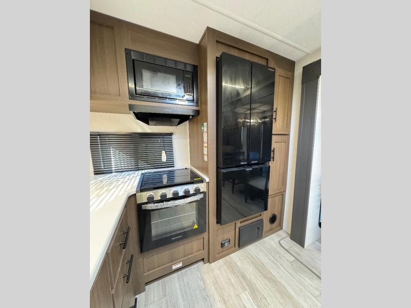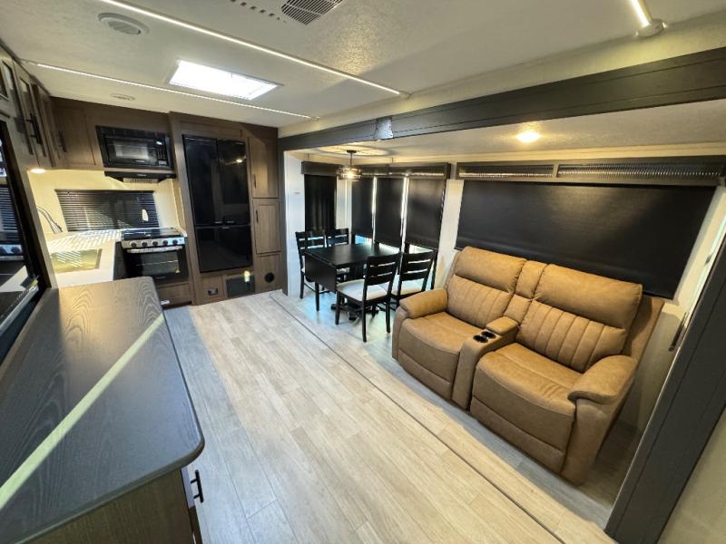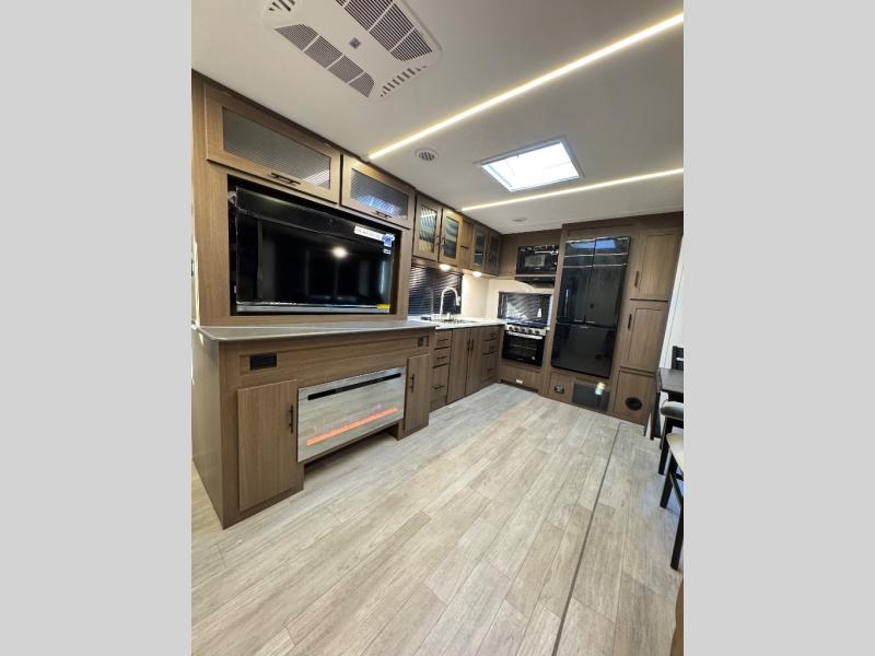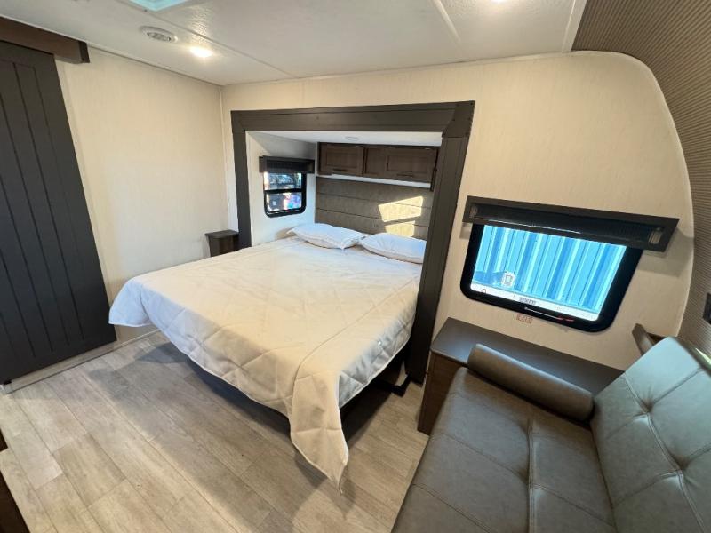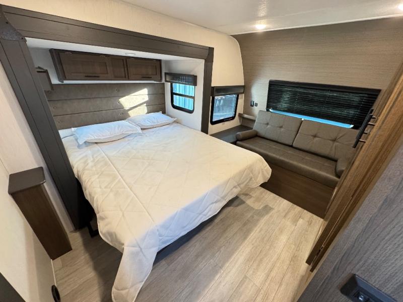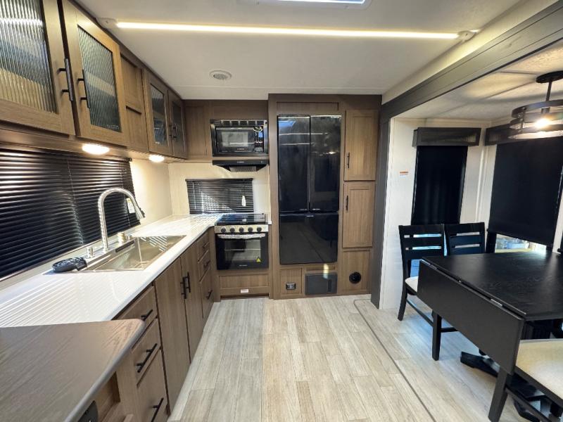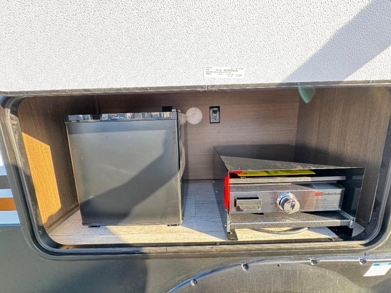 Are you ready to escape to the campground after a busy work week? This travel trailer will provide comfort wherever you decide to park it! After you've put out the 20' awning, you can unload the Maxx pass-thru storage and make lunch on the outside kitchen with a griddle and refrigerator. If you don't want to sit outside to eat, you'll find a booth dinette and tri-fold hide-a-bed sofa sleeper within the living room slide out. There is also a Smart TV and fireplace here so you can get the most out of movie nights! Another stand-out feature in this model is the generous counter space in the rear kitchen, allowing you to prep meals and easily set snacks out, plus there is a 12V refrigerator and pantry for food storage! A full bath will let you freshen up each day, and the front private bedroom will have you feeling right at home. There is a Maxx kind bed slide, storage space, and a front bedroom sofa in front of the front windshield for great outdoor views!