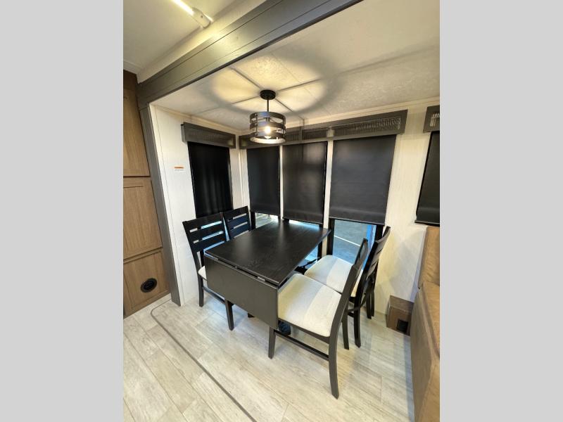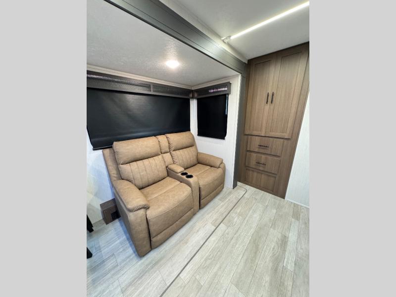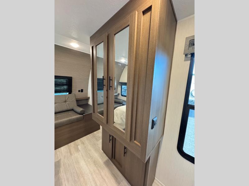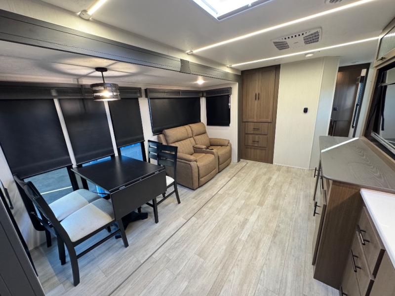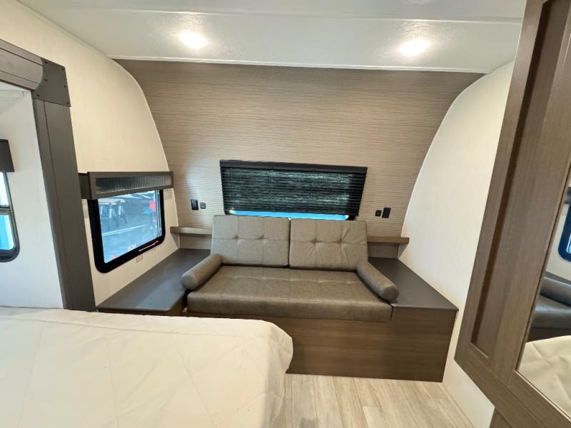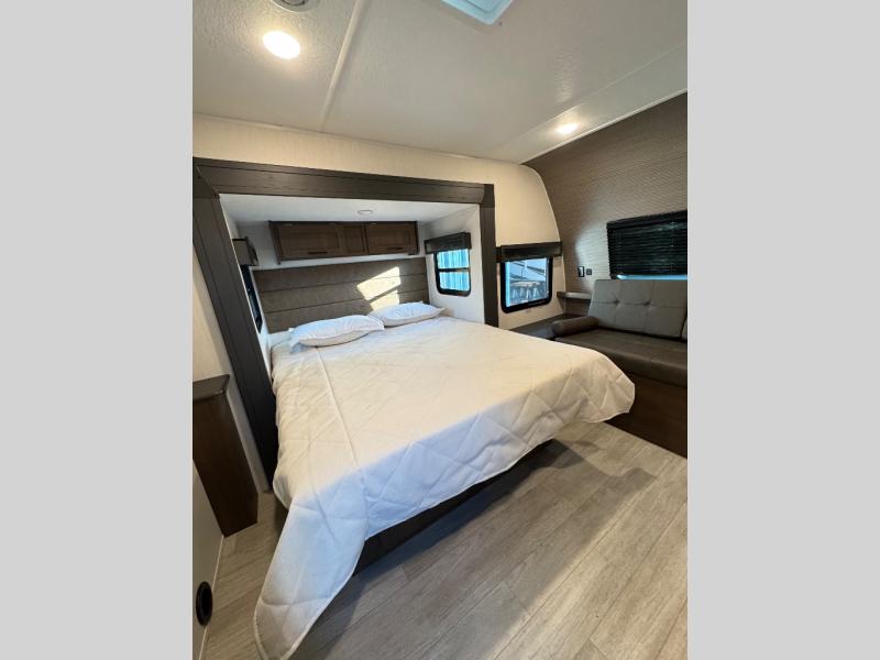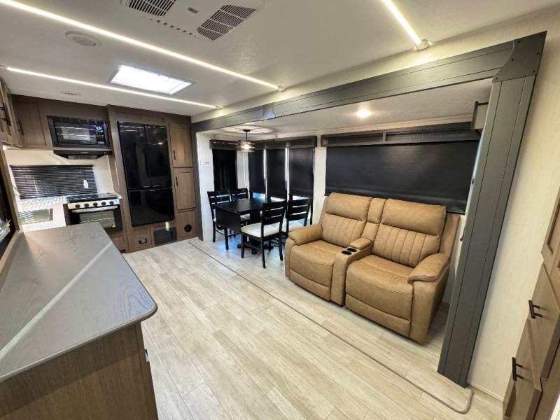 Are you ready to escape to the campground after a busy work week? This travel trailer will provide comfort wherever you decide to park it! After you've put out the 20' awning, you can unload the Maxx pass-thru storage and make lunch on the outside kitchen with a griddle and refrigerator. If you don't want to sit outside to eat, you'll find a booth dinette and tri-fold hide-a-bed sofa sleeper within the living room slide out. There is also a Smart TV and fireplace here so you can get the most out of movie nights! Another stand-out feature in this model is the generous counter space in the rear kitchen, allowing you to prep meals and easily set snacks out, plus there is a 12V refrigerator and pantry for food storage! A full bath will let you freshen up each day, and the front private bedroom will have you feeling right at home. There is a Maxx kind bed slide, storage space, and a front bedroom sofa in front of the front windshield for great outdoor views!