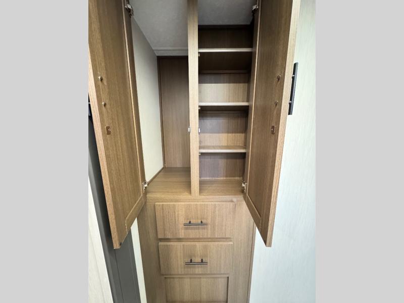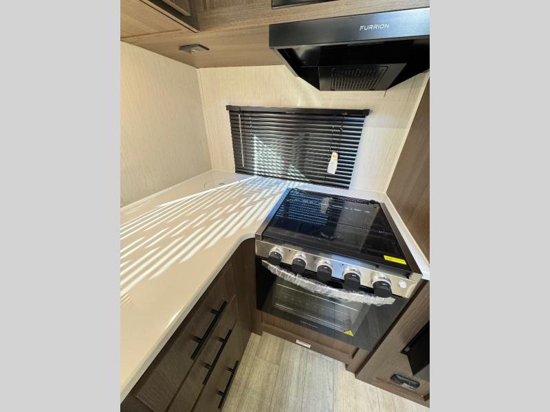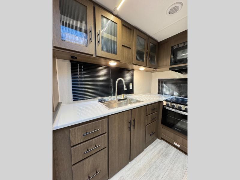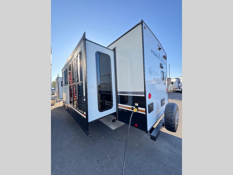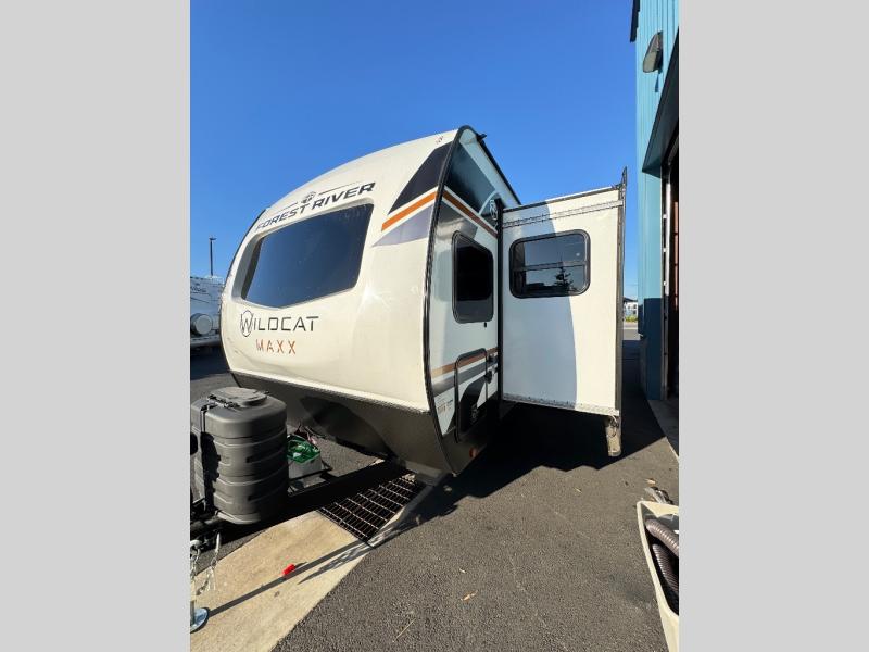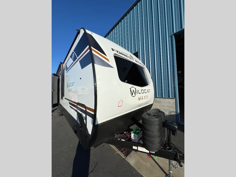 Each Forest River Wildcat MAXX travel trailer is constructed with 2" thick Vacuum-Bonded sidewalls, Maxx-strength aluminum-framed laminated floor, and reflective Astro-Foil insulation in the roof for added protection. The Dynamic Technology Package includes a frame-mounted receiver hitch, a battery disconnect, and a 200-watt solar panel for off-grid capabilities. You will also enjoy the Peak Package with a power tongue jack, solid surface kitchen countertops, a 21" 2-In-1 range and oven, an on-demand tankless water heater, and more convenient features.