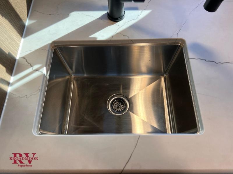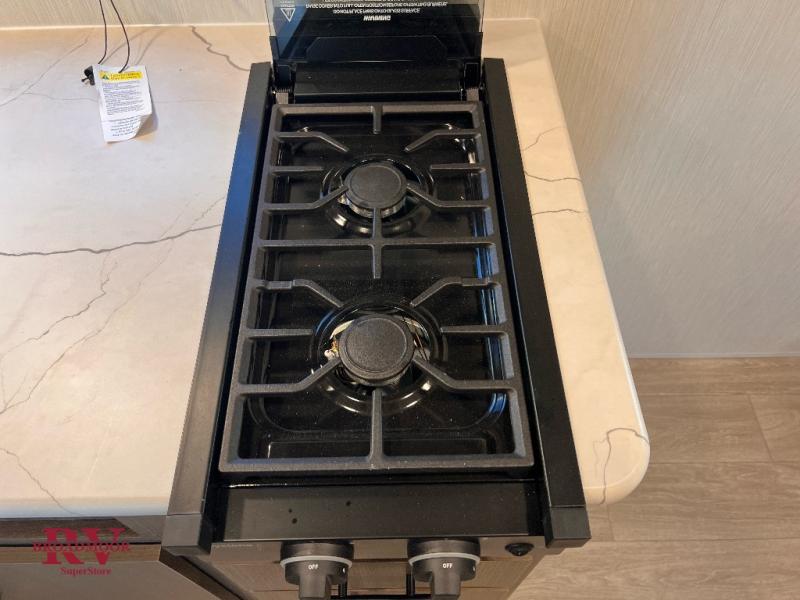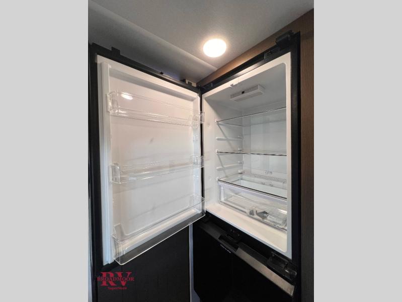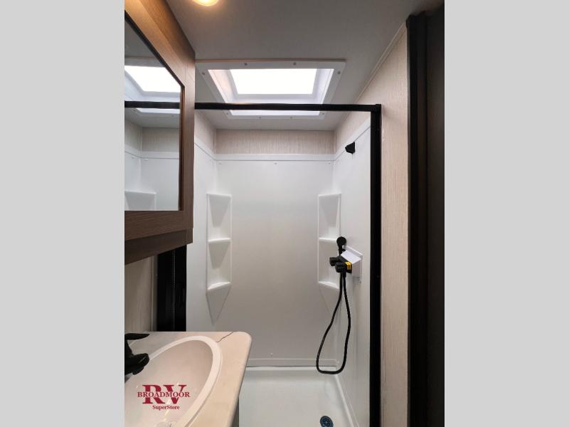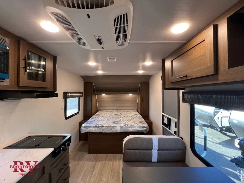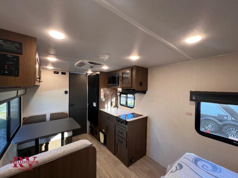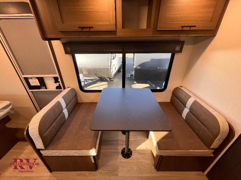 You will love this RV’s carpetless interior, which features a spacious living area, perfect for relaxing and enjoying the scenery. The rear bathroom is a practical and convenient space, perfect for getting ready in the morning or freshening up after a long day. The booth dinette is a cozy spot for meals or game nights, and provides a comfortable space to relax and socialize. The kitchen is equipped with a 12V refrigerator and microwave, making meal prep a breeze. Overhead cabinets provide ample storage for your kitchen essentials. Finally, the front bedroom is a serene retreat, featuring a comfortable queen bed, nightstands, and wardrobes on each side of the bed.