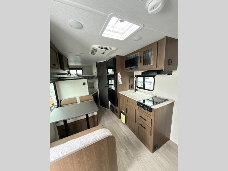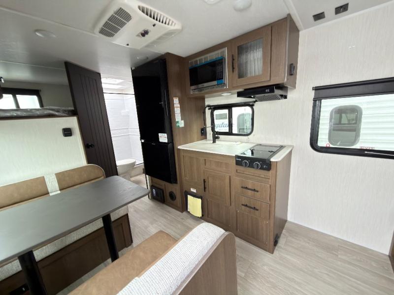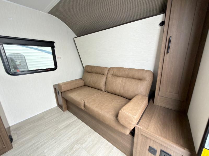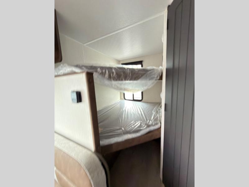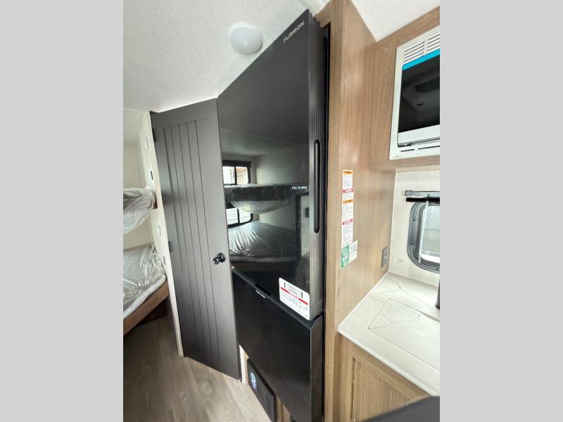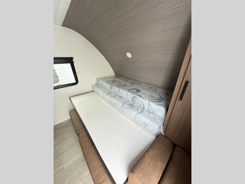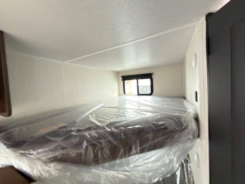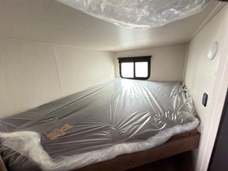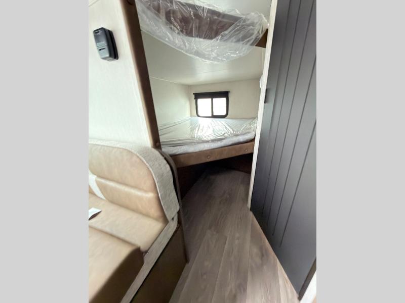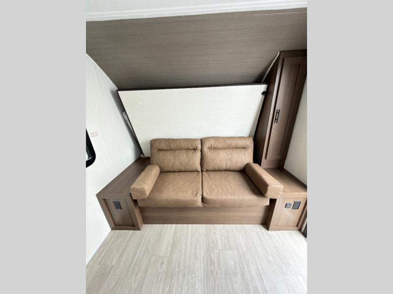 The bunk room is a kid's paradise, featuring spacious double-size bunk beds, ample wardrobes, and convenient nightstands. It's the perfect spot for little ones to rest and recharge. The full bathroom is a serene oasis, offering a relaxing space to start and end each day. Its thoughtful design makes mornings and evenings a breeze. The booth dinette is a cozy haven for family meals, game nights, and laughter-filled moments. It's the perfect spot to share stories and make memories. The kitchen is a culinary delight, equipped with a 12V refrigerator, microwave, and generous overhead cabinets. Prepare delicious meals and snacks with ease, and enjoy quality time with loved ones. The living area features a comfortable sofa and a clever Murphy bed, providing additional sleeping space for guests or family members. It's the perfect spot to relax, unwind, and enjoy quality time together.
