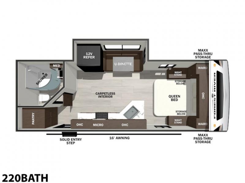 Drift off to sleep feeling relaxed and rejuvenated. The queen bed is a tranquil retreat, complete with nightstands and a spacious wardrobe! The full bathroom is a serene oasis, featuring a radius shower and ample storage. Unwind and recharge in style. The kitchen is equipped with a 12V refrigerator, pantry, and overhead cabinets, providing ample space for meal prep and storage. The U-dinette is a cozy haven for meals and conversation, perfect for sharing stories and making memories.