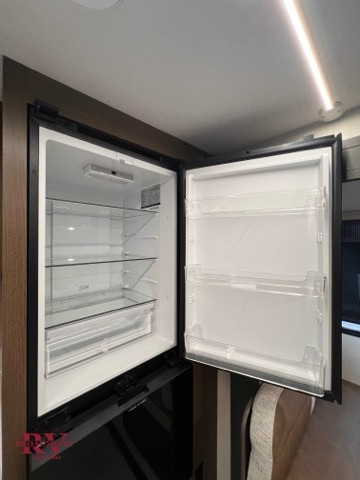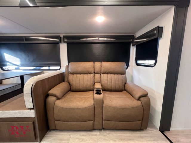 Prepare delicious meals and snacks with ease inside or outside of the RV, and enjoy quality time with loved ones! The rear kitchen is a culinary haven, featuring ample counter space, a walk-in pantry with shelves, and an outside kitchen for alfresco dining. The booth dinette is a charming spot for meals and conversation, perfect for sharing stories and making memories. Relax and unwind with family and friends, or enjoy a quiet evening in the spacious living area. The entertainment center is the heart of the trailer, featuring a fireplace that creates a warm and inviting ambiance. The trifold sofa provides additional seating and sleeping space, perfect for lounging and socializing. The front bedroom is a romantic retreat, featuring a queen bed, nightstands, and spacious wardrobes.