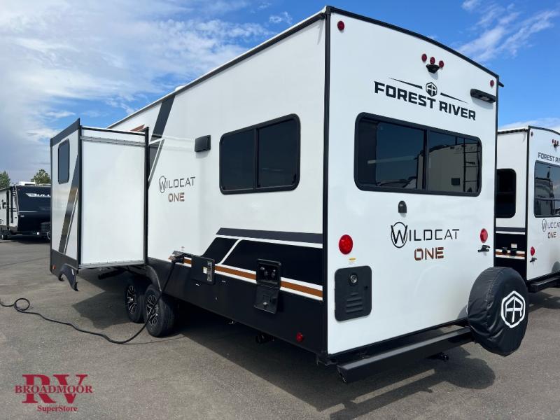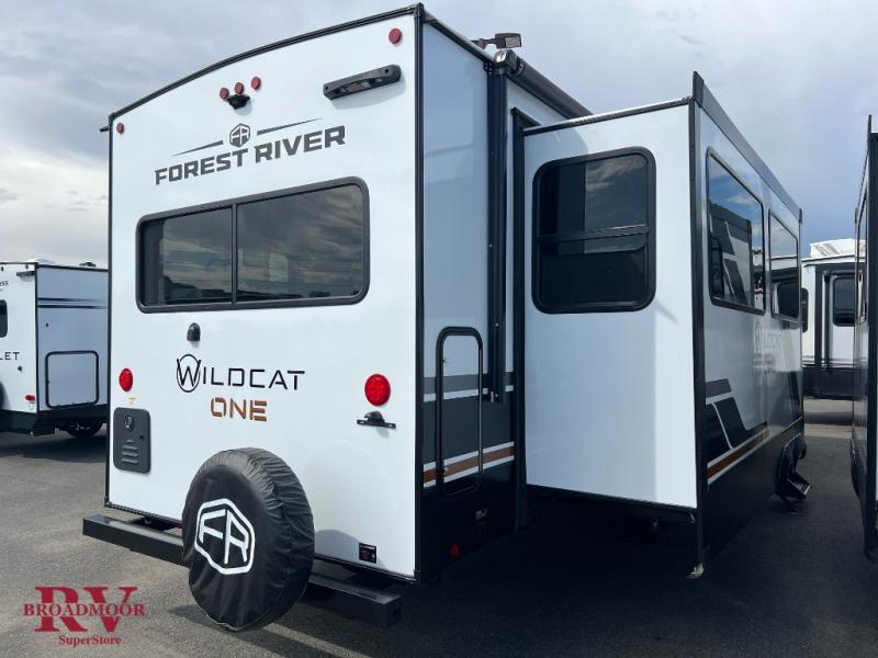 With any Wildcat ONE travel trailer by Forest River in tow, you will find fun and adventure wherever you go! Each model is constructed 2" thick Vacuum-Bonded sidewalls, a Maxx-strength aluminum-framed laminated floor, and double R-7 fiberglass insulation for added protection. These features are included with the Maxx Insulation Package, which also includes slam-latch baggage doors, a fully enclosed underbelly, and more. The Dynamic Technology Package features a 200W expandable roof mounted solar panel with a 30 amp charge controller for off-grid capabilities, backup camera prep, an exterior TV connection, and a frame-mounted receiver hitch to name a few conveniences. A front windshield is found within the Peak Package, along with a power tongue jack, solid surface kitchen countertops, friction hinge entry doors, and an exterior ladder prep.