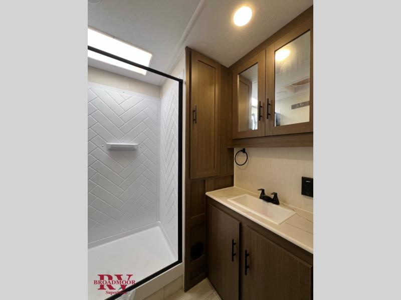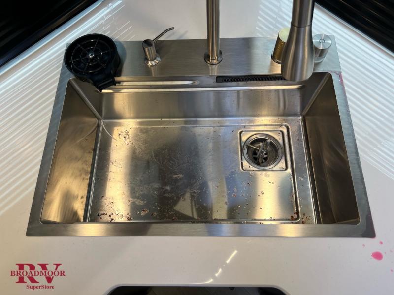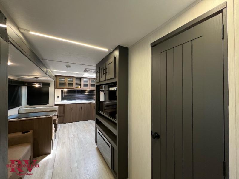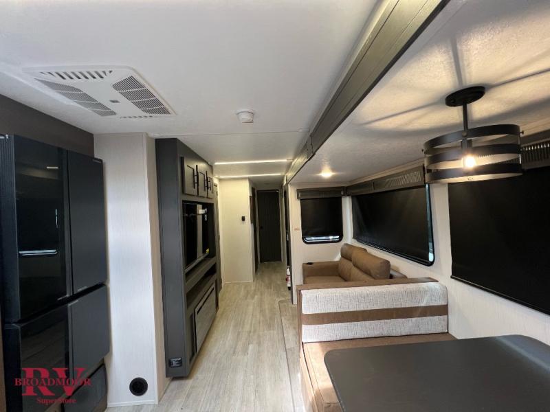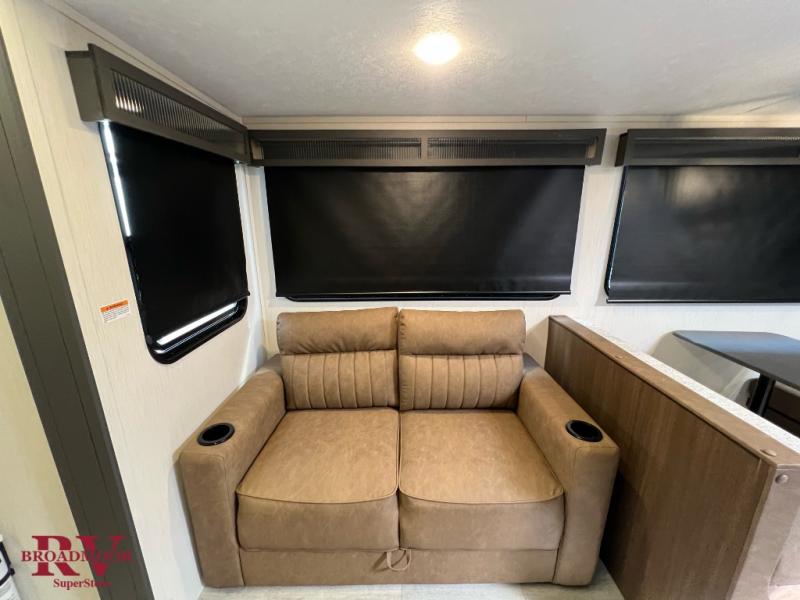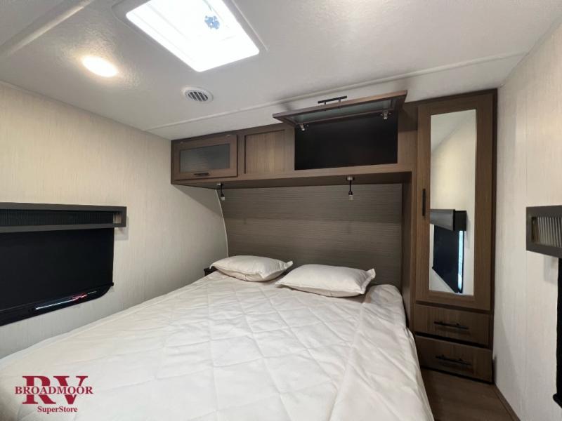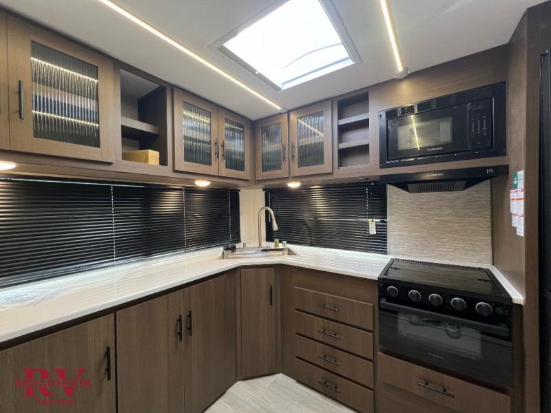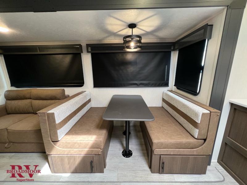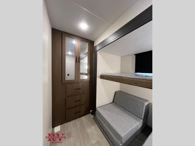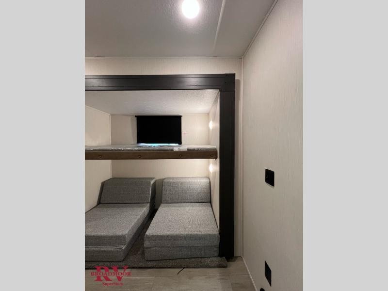 If you enjoy camping with friends and family, but still want your own space at night, this travel trailer is perfect for you! The front private bedroom includes a Maxx king bed, a bedside wardrobe, plus a second wardrobe with two drawers below. Your guest can take the mid-bunkroom that includes Cat-Nap sleepers which is a bunk with fold out mats underneath. There is also a wardrobe with three drawers and a slide out to make this room more spacious. Just outside the bunkroom is the tri-fold hide-a-bed sofa and booth dinette that are in direct view of the smart TV and fireplace. You will also fall in love with the rear kitchen that includes a skylight, plenty of counter space, a large single bowl stainless steel sink, and a 12V refrigerator!