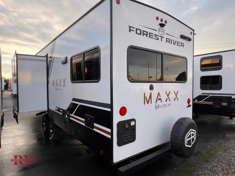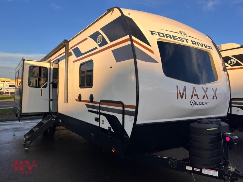 With any Wildcat ONE travel trailer by Forest River in tow, you will find fun and adventure wherever you go! Each model is constructed 2" thick Vacuum-Bonded sidewalls, a Maxx-strength aluminum-framed laminated floor, and double R-7 fiberglass insulation for added protection. These features are included with the Maxx Insulation Package, which also includes slam-latch baggage doors, a fully enclosed underbelly, and more. The Dynamic Technology Package features a 200W expandable roof mounted solar panel with a 30 amp charge controller for off-grid capabilities, backup camera prep, an exterior TV connection, and a frame-mounted receiver hitch to name a few conveniences. A front windshield is found within the Peak Package, along with a power tongue jack, solid surface kitchen countertops, friction hinge entry doors, and an exterior ladder prep.