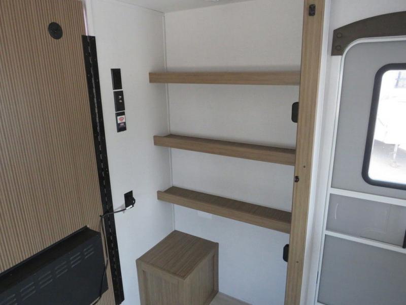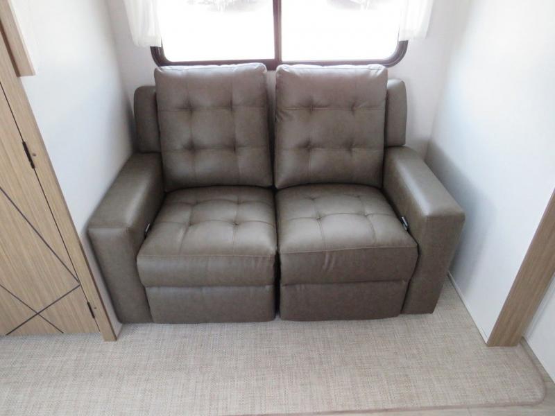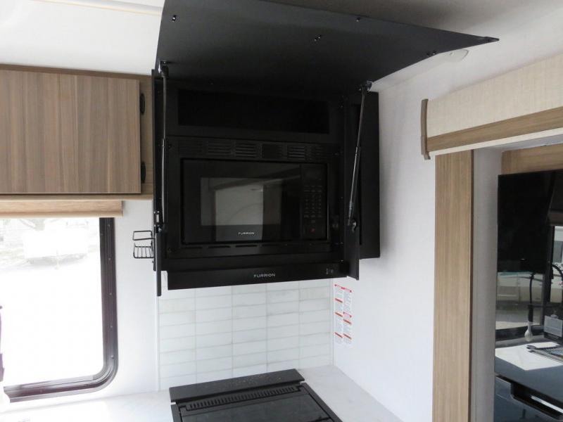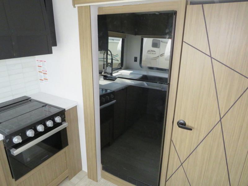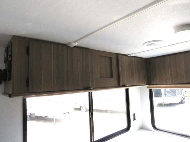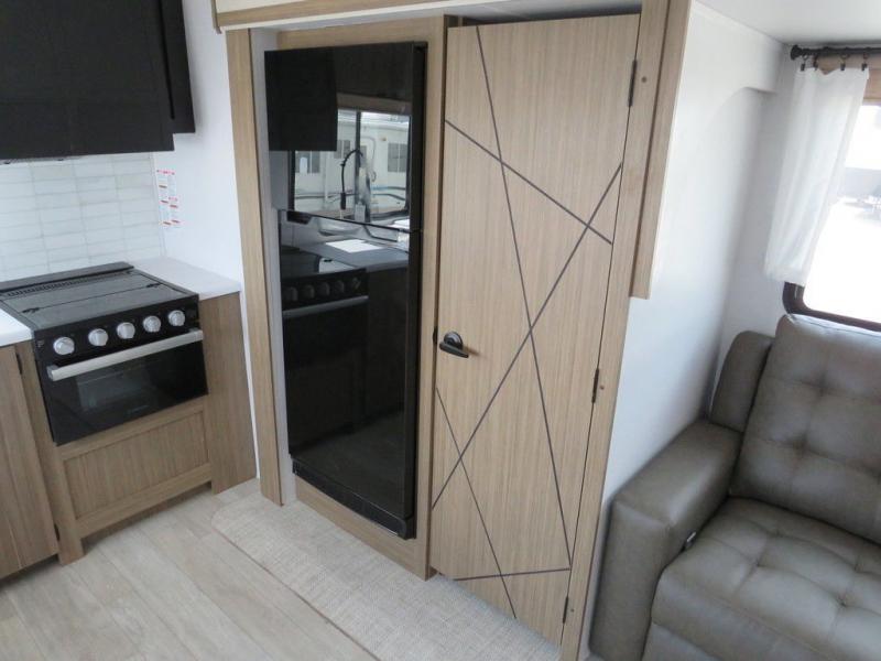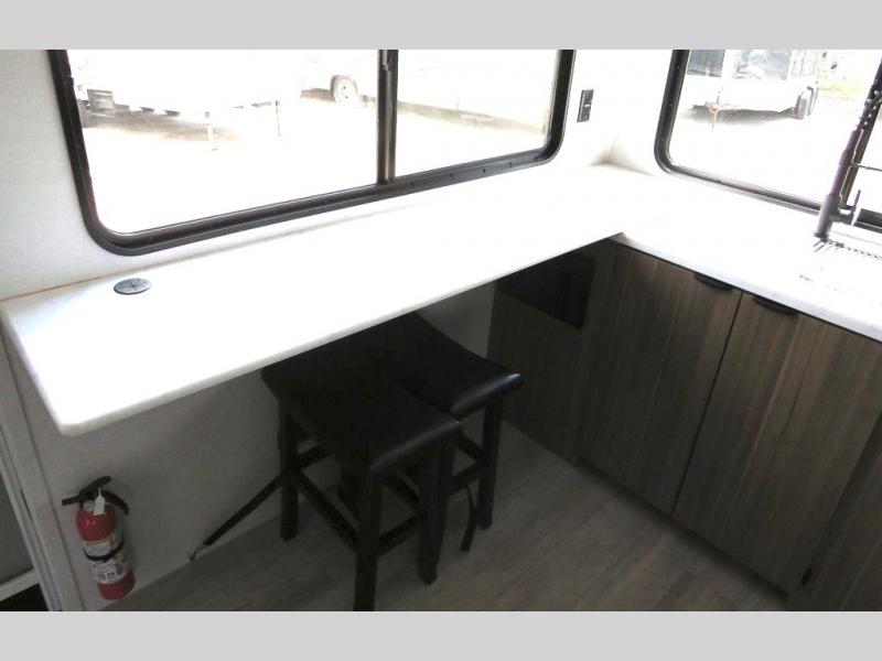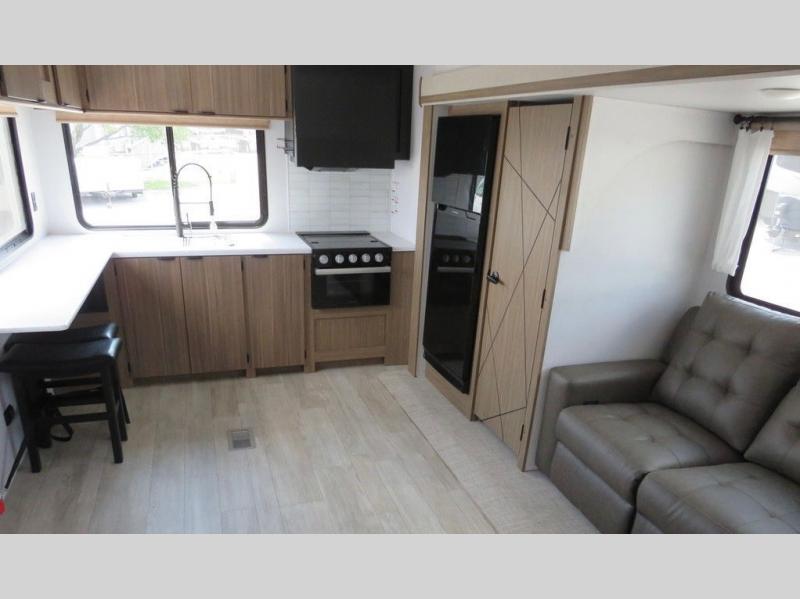 You're going to love cooking in the rear kitchen of this travel trailer! It has everything you need to prepare delicious home cooked meals including a large pantry and oversized fridge, plus there are two bar stools to sit on while you enjoy them. The theater seating is conveniently across from the swiveling entertainment center which has hidden shelves behind it for your games and movies. As you walk through the bathroom, you will notice a walk-in shower to the left and a toilet and sink to the right. It leads directly into the front private bedroom which has a Versa-Tilt custom king bed to lay your head on at night and wardrobes/nightstands on either side for your items!