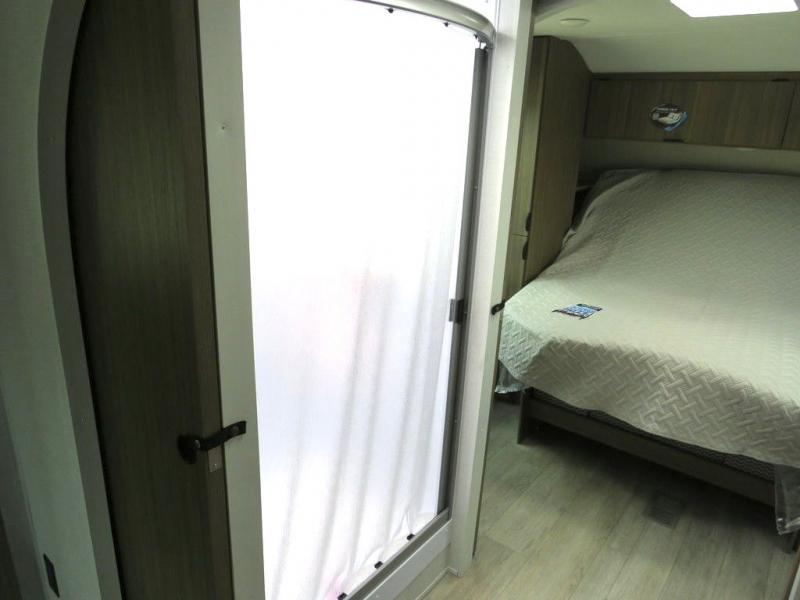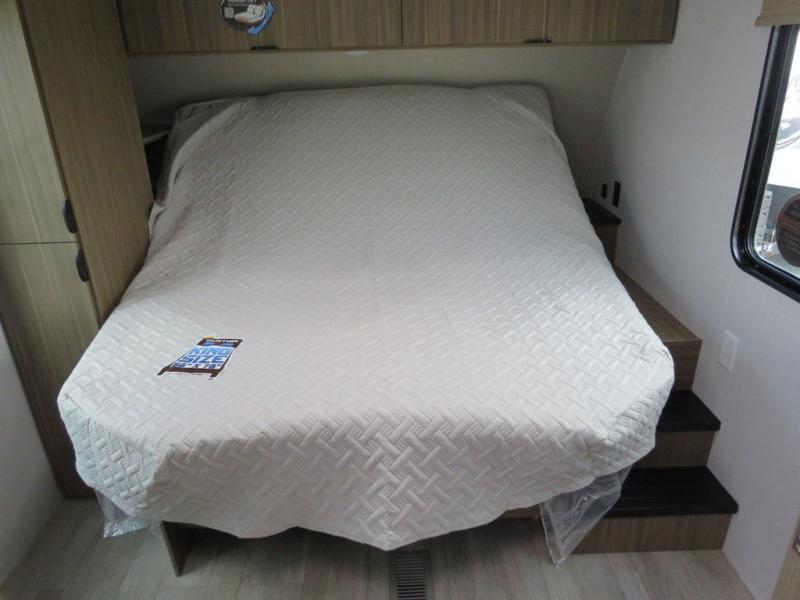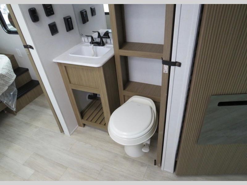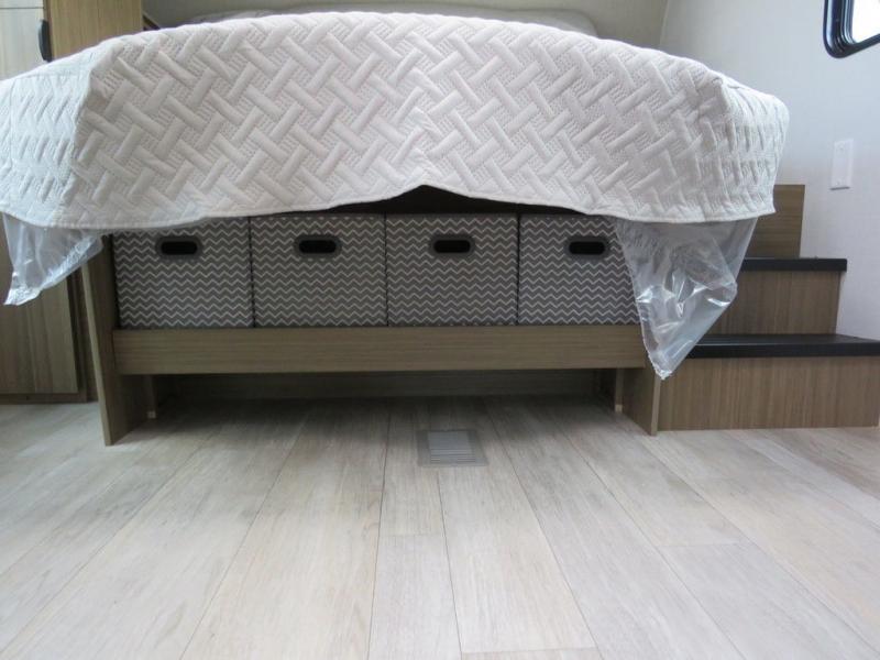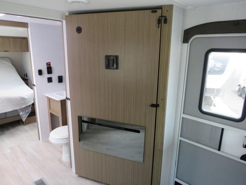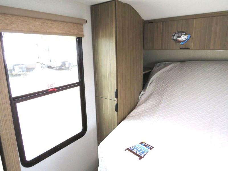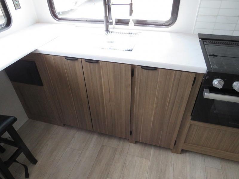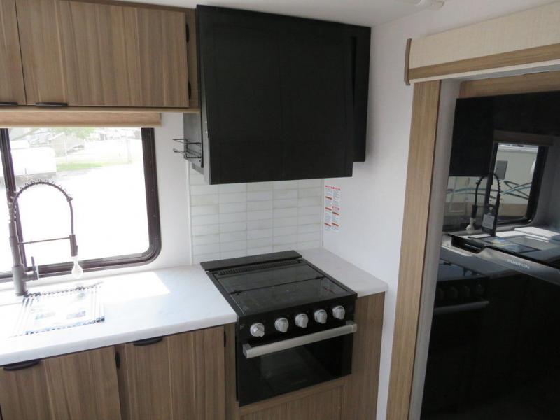 You're going to love cooking in the rear kitchen of this travel trailer! It has everything you need to prepare delicious home cooked meals including a large pantry and oversized fridge, plus there are two bar stools to sit on while you enjoy them. The theater seating is conveniently across from the swiveling entertainment center which has hidden shelves behind it for your games and movies. As you walk through the bathroom, you will notice a walk-in shower to the left and a toilet and sink to the right. It leads directly into the front private bedroom which has a Versa-Tilt custom king bed to lay your head on at night and wardrobes/nightstands on either side for your items!