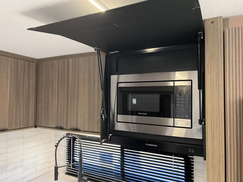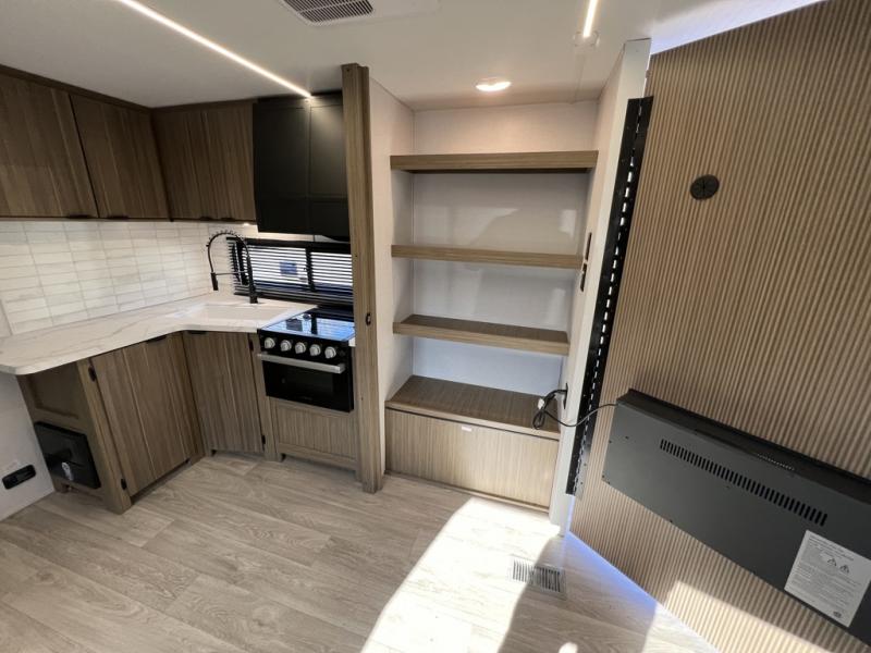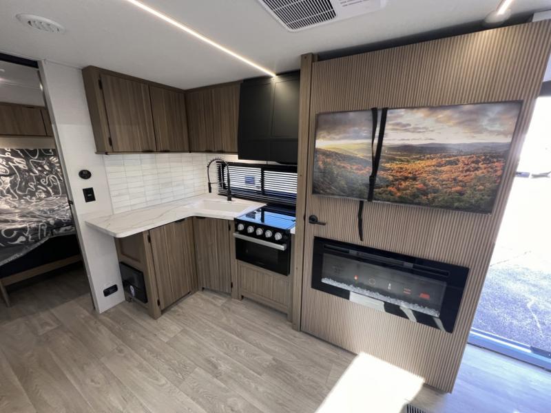 As you escape to the beautiful countryside, or embark across the country to visit family, you'll find that the modern amenities found in this Wildwood travel trailer will deliver the ultimate enjoyment all along the way! Relax on a chaise lounge that includes a table in front so that you can enjoy your morning coffee. When you are ready to face the day ahead, you can grab a towel from the linen closet in the rear bathroom and enjoy the walk-in shower before heading out for a day full of adventure. At night, a custom king bed with Versa-Tilt for a great night's rest. You will appreciate the pass-through storage, entertainment center with fireplace, and walk-in pantry for all the goodies!