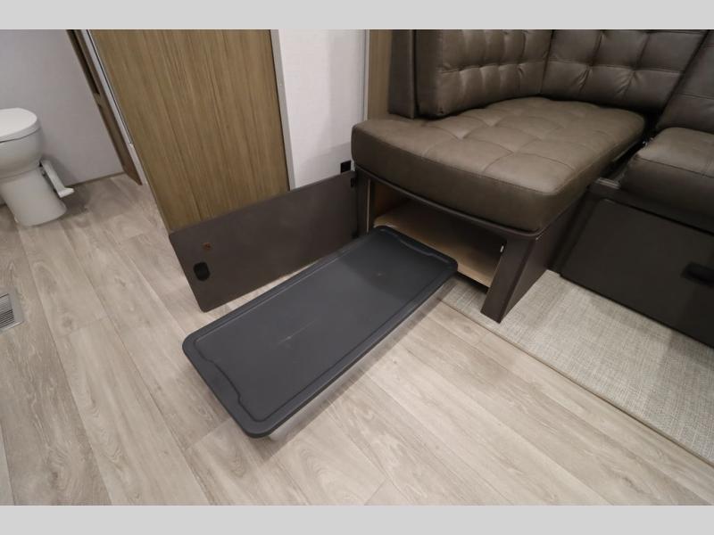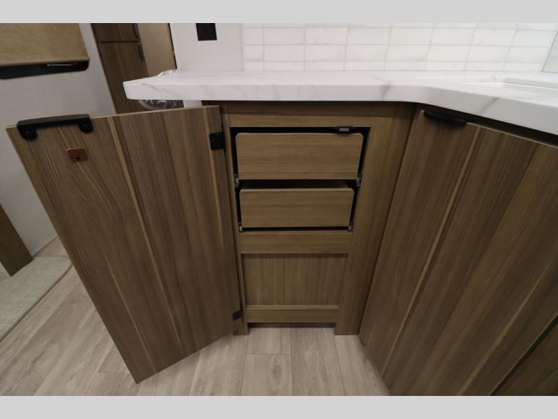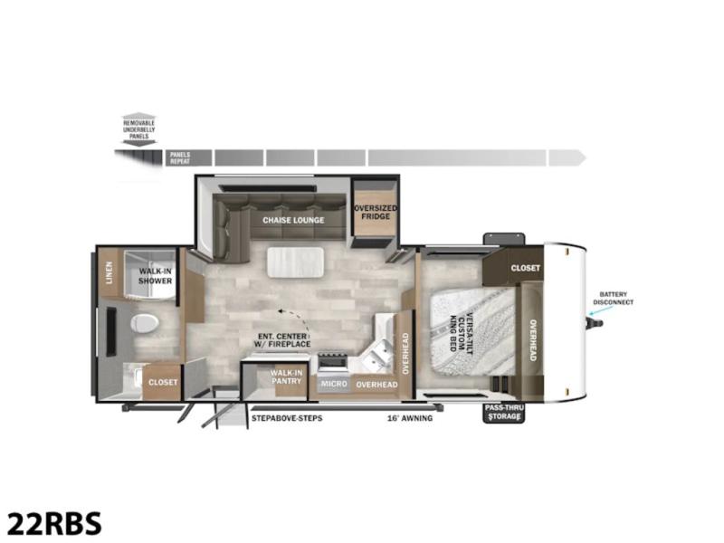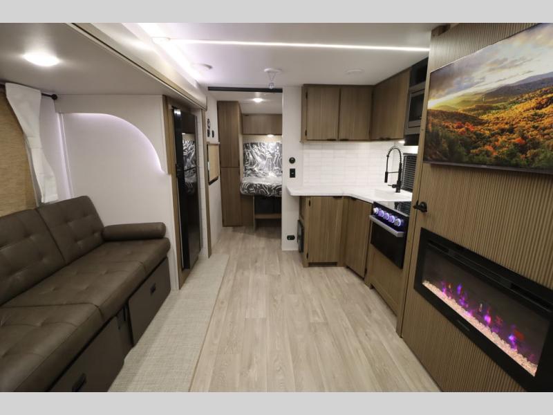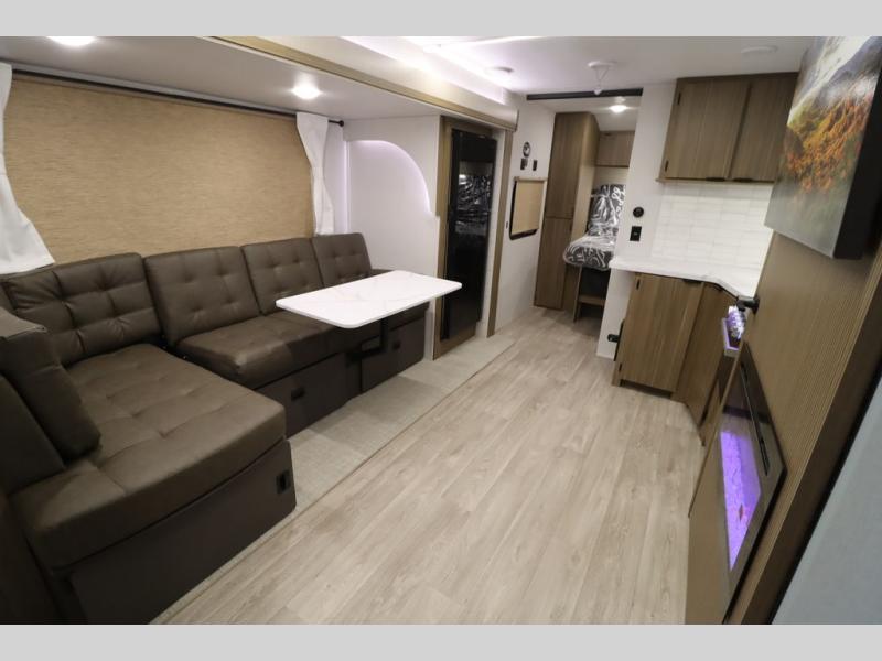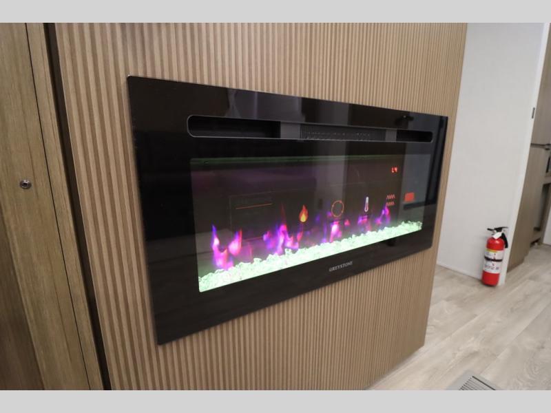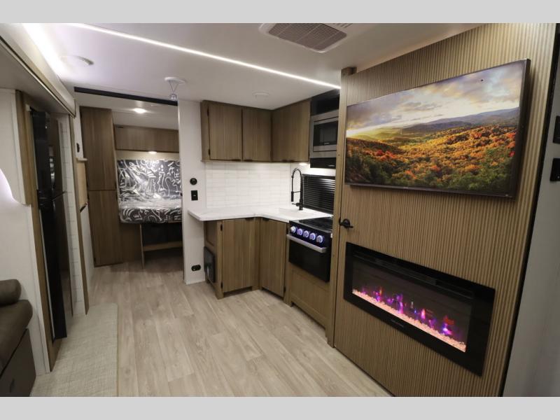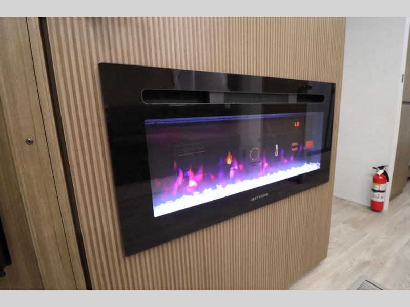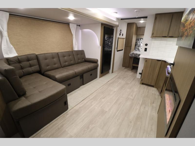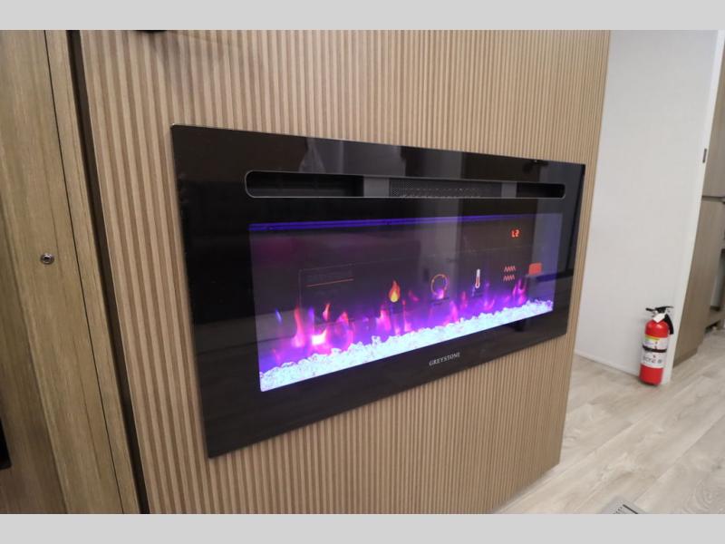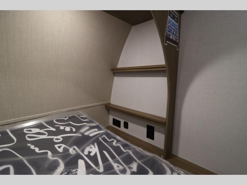 As you escape to the beautiful countryside, or embark across the country to visit family, you'll find that the modern amenities found in this Wildwood travel trailer will deliver the ultimate enjoyment all along the way! Relax on a chaise lounge that includes a table in front so that you can enjoy your morning coffee. When you are ready to face the day ahead, you can grab a towel from the linen closet in the rear bathroom and enjoy the walk-in shower before heading out for a day full of adventure. At night, a custom king bed with Versa-Tilt for a great night's rest. You will appreciate the pass-through storage, entertainment center with fireplace, and walk-in pantry for all the goodies!