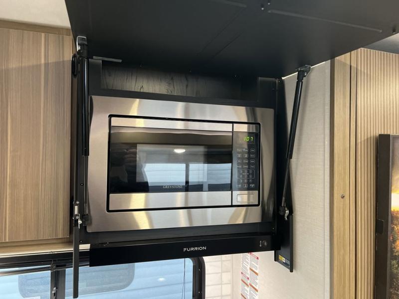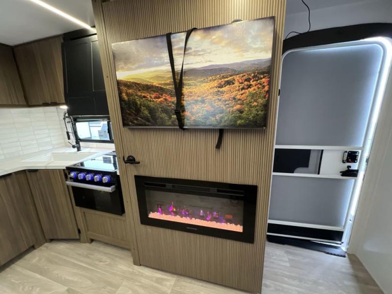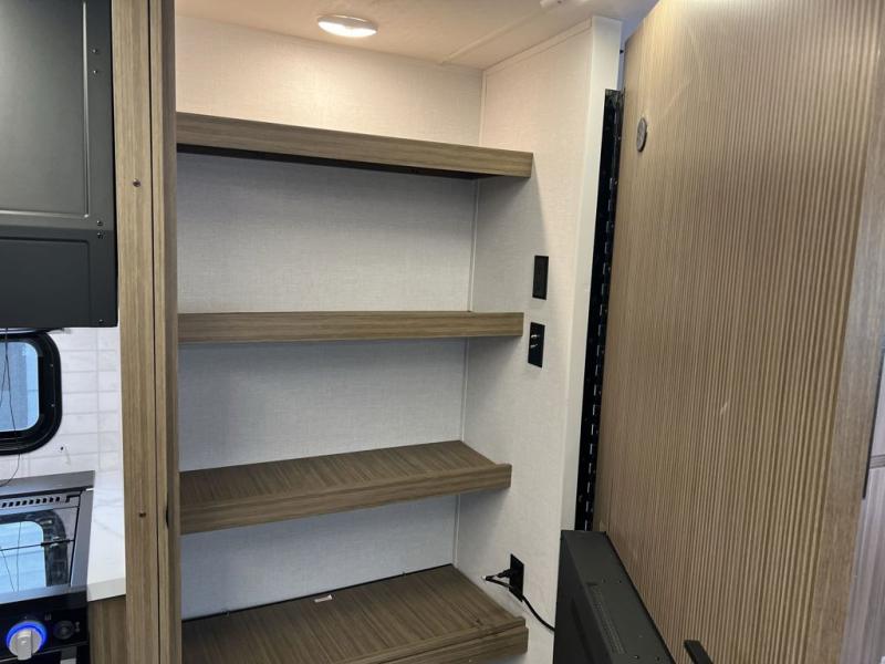 As you escape to the beautiful countryside, or embark across the country to visit family, you'll find that the modern amenities found in this Wildwood travel trailer will deliver the ultimate enjoyment all along the way! Relax on a chaise lounge that includes a table in front so that you can enjoy your morning coffee. When you are ready to face the day ahead, you can grab a towel from the linen closet in the rear bathroom and enjoy the walk-in shower before heading out for a day full of adventure. At night, a custom king bed with Versa-Tilt for a great night's rest. You will appreciate the pass-through storage, entertainment center with fireplace, and walk-in pantry for all the goodies!