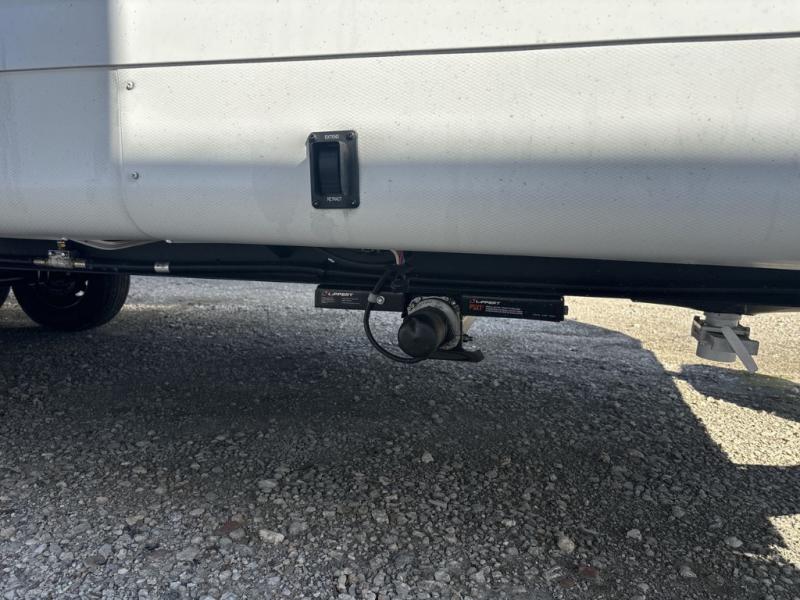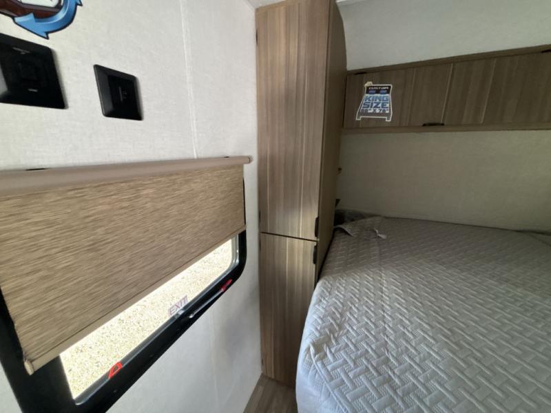 You can enjoy at-home comforts wherever you decide to camp in this travel trailer. The custom king bed with Versa Tilt includes dual shelves and a wardrobe so you can keep your space tidy. If you have a guest or two little ones, they can sleep on the jackknife sofa within the large slide out. Once you've made breakfast in the fully equipped kitchen, you can utilize the pull-out table to dine at. There is also a fireplace below the table, which will be perfect for cozy evenings indoors. And don't overlook the full rear bath, complete with a spacious shower, a toilet, bath shelves, and ample counter space!