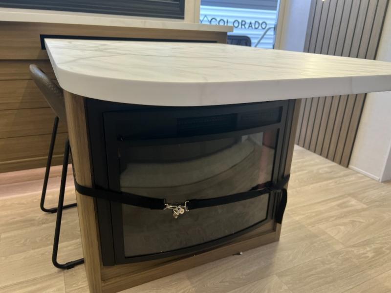 You can enjoy at-home comforts wherever you decide to camp in this travel trailer. The custom king bed with Versa Tilt includes dual shelves and a wardrobe so you can keep your space tidy. If you have a guest or two little ones, they can sleep on the jackknife sofa within the large slide out. Once you've made breakfast in the fully equipped kitchen, you can utilize the pull-out table to dine at. There is also a fireplace below the table, which will be perfect for cozy evenings indoors. And don't overlook the full rear bath, complete with a spacious shower, a toilet, bath shelves, and ample counter space!