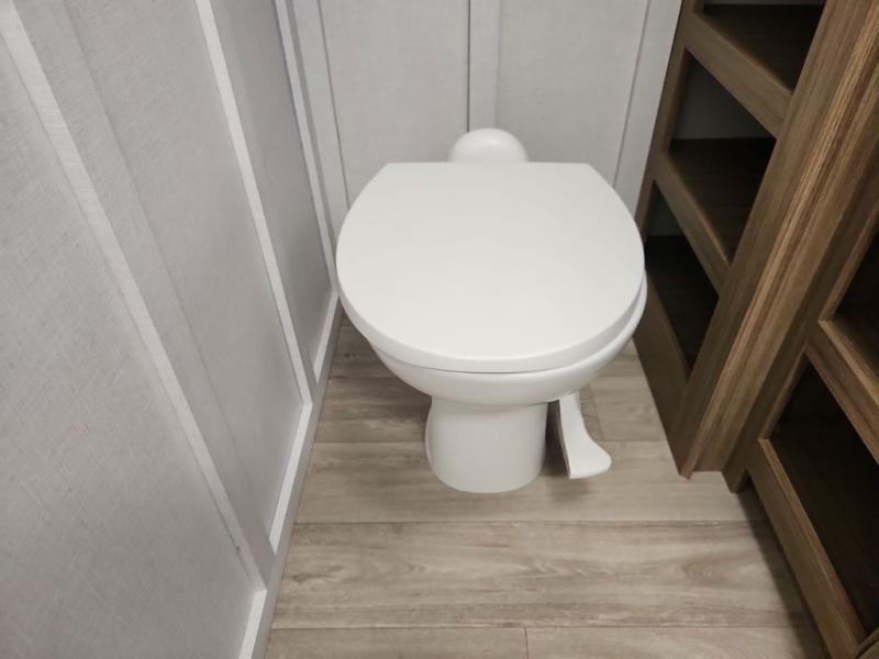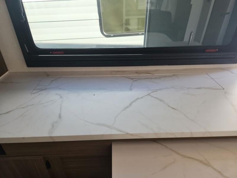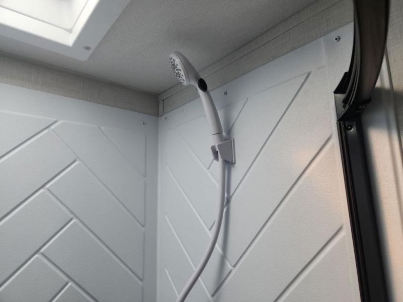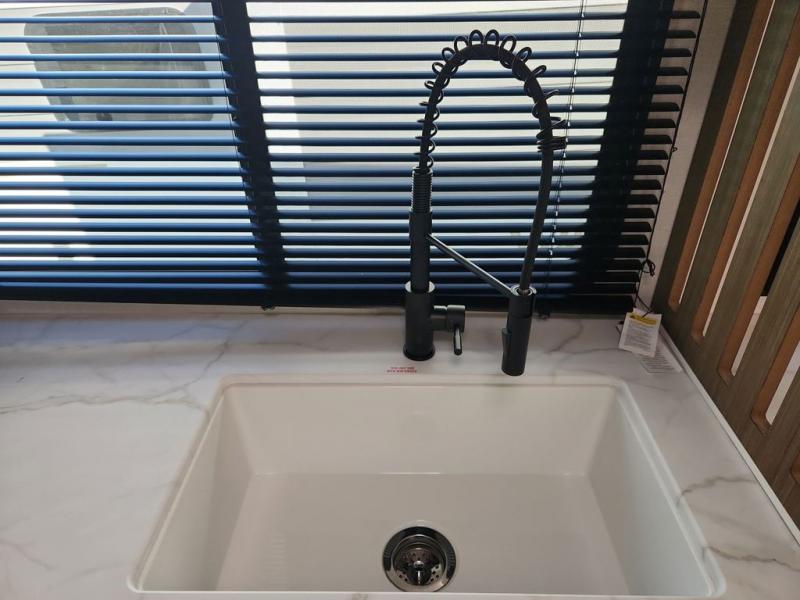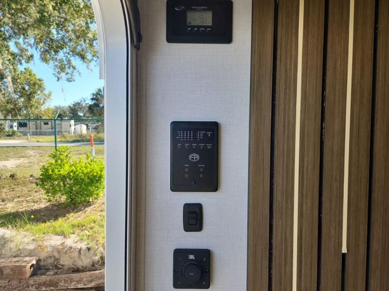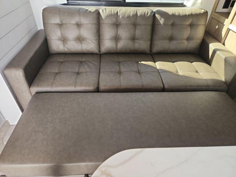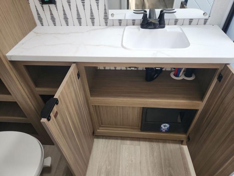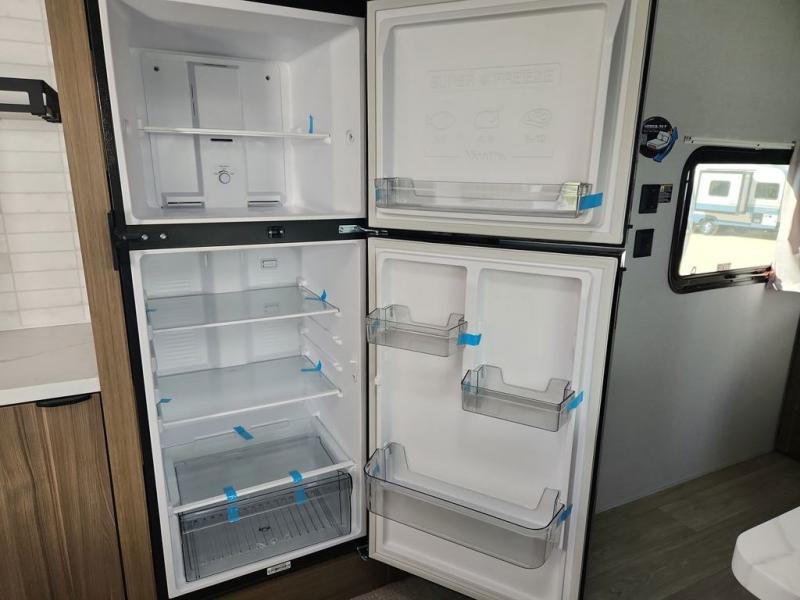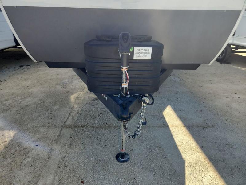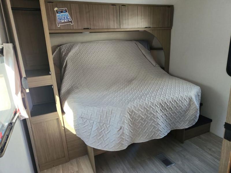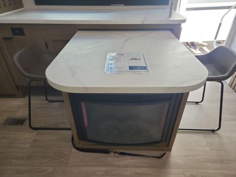 You can enjoy at-home comforts wherever you decide to camp in this travel trailer. The custom king bed with Versa Tilt includes dual shelves and a wardrobe so you can keep your space tidy. If you have a guest or two little ones, they can sleep on the jackknife sofa within the large slide out. Once you've made breakfast in the fully equipped kitchen, you can utilize the pull-out table to dine at. There is also a fireplace below the table, which will be perfect for cozy evenings indoors. And don't overlook the full rear bath, complete with a spacious shower, a toilet, bath shelves, and ample counter space!