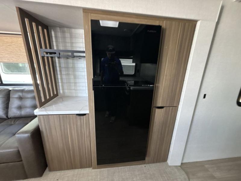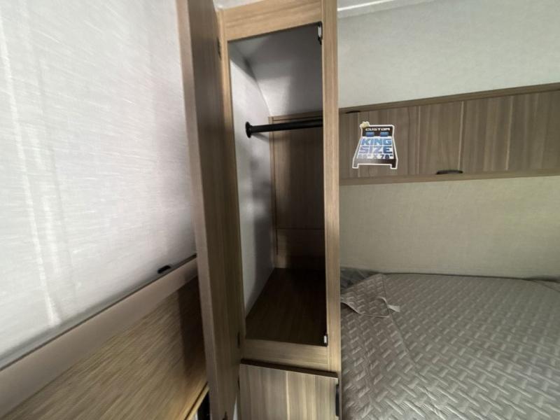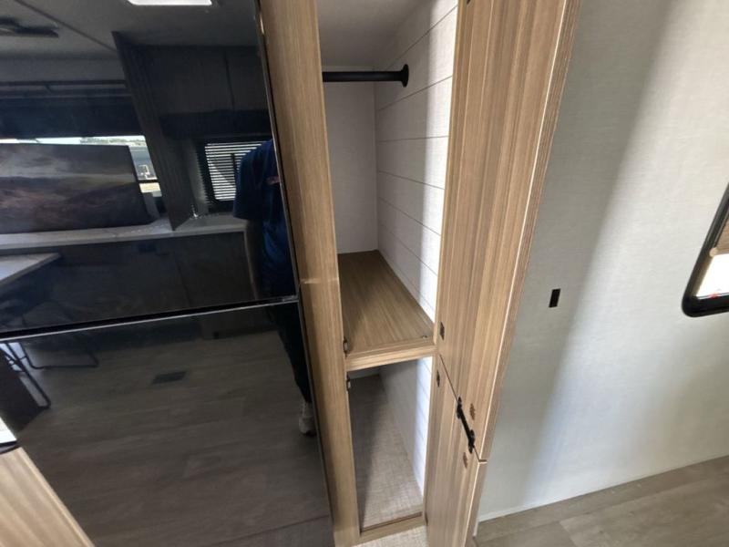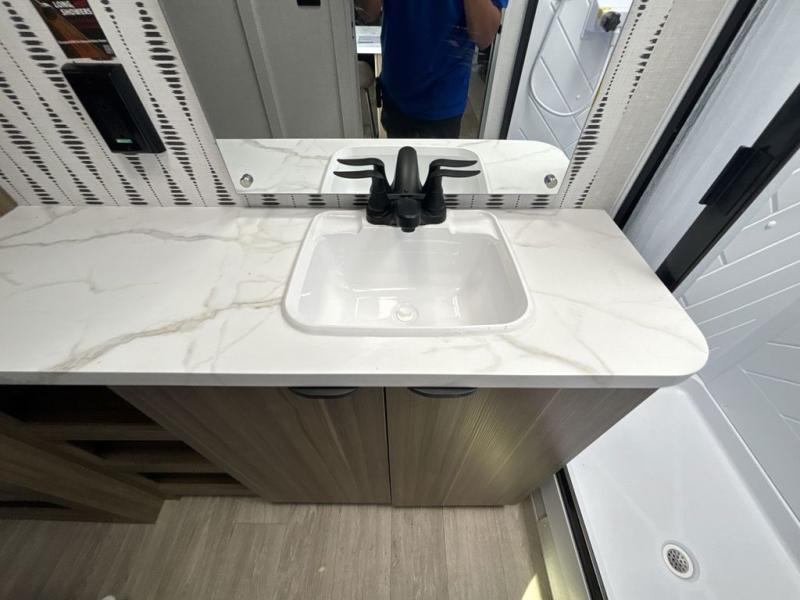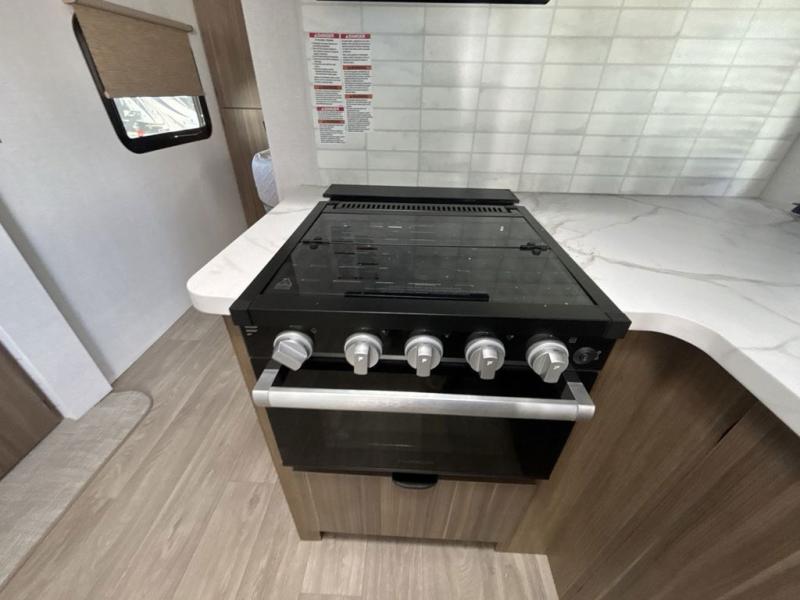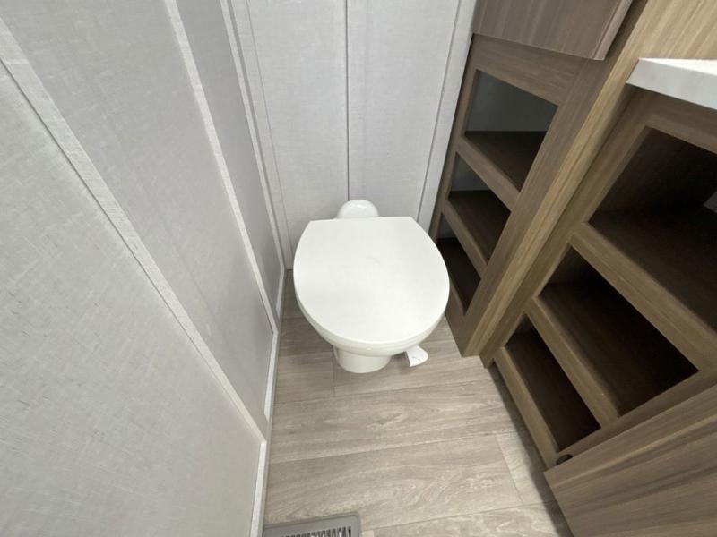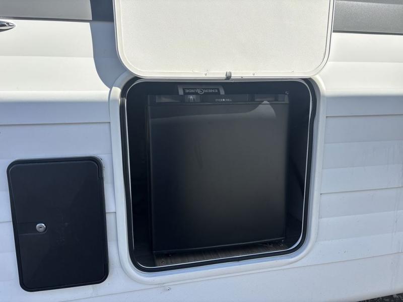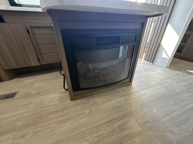 You can enjoy at-home comforts wherever you decide to camp in this travel trailer. The custom king bed with Versa Tilt includes dual shelves and a wardrobe so you can keep your space tidy. If you have a guest or two little ones, they can sleep on the jackknife sofa within the large slide out. Once you've made breakfast in the fully equipped kitchen, you can utilize the pull-out table to dine at. There is also a fireplace below the table, which will be perfect for cozy evenings indoors. And don't overlook the full rear bath, complete with a spacious shower, a toilet, bath shelves, and ample counter space!