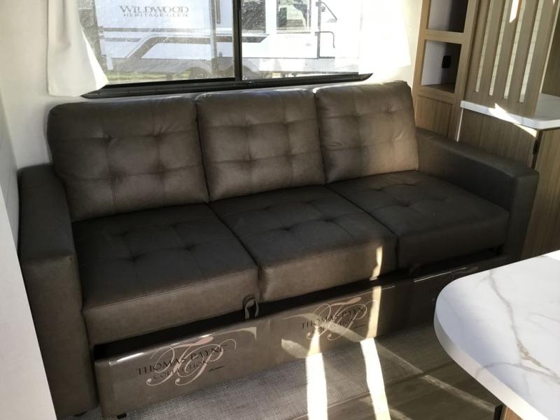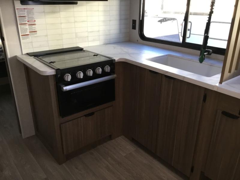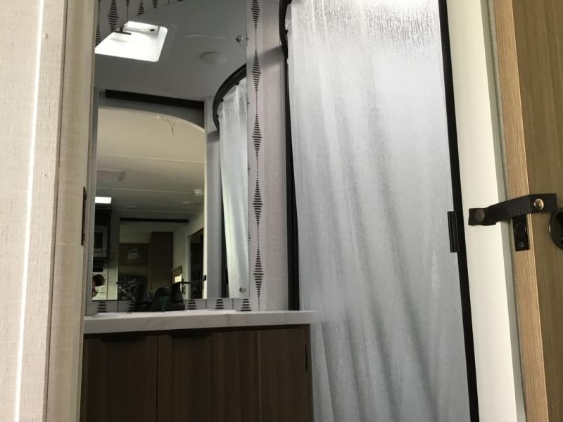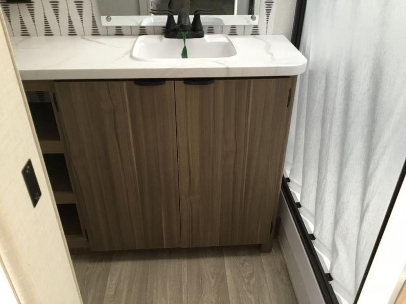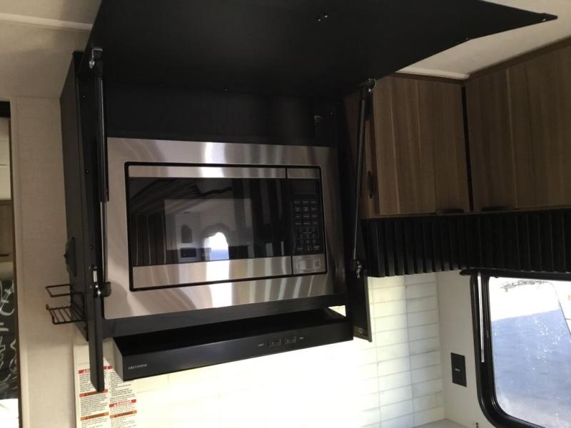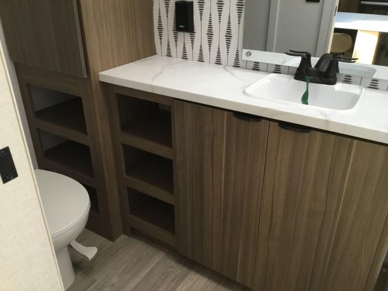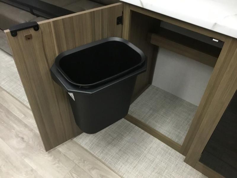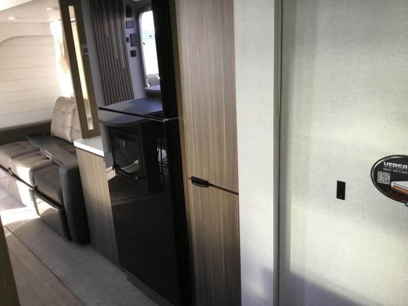 You can enjoy at-home comforts wherever you decide to camp in this travel trailer. The custom king bed with Versa Tilt includes dual shelves and a wardrobe so you can keep your space tidy. If you have a guest or two little ones, they can sleep on the jackknife sofa within the large slide out. Once you've made breakfast in the fully equipped kitchen, you can utilize the pull-out table to dine at. There is also a fireplace below the table, which will be perfect for cozy evenings indoors. And don't overlook the full rear bath, complete with a spacious shower, a toilet, bath shelves, and ample counter space!
