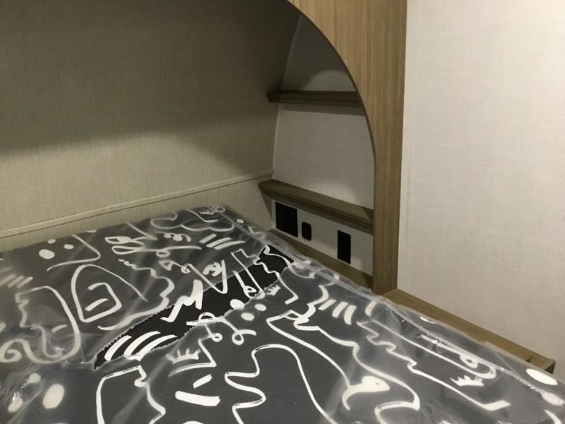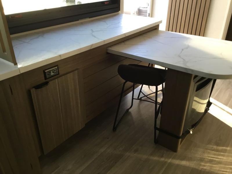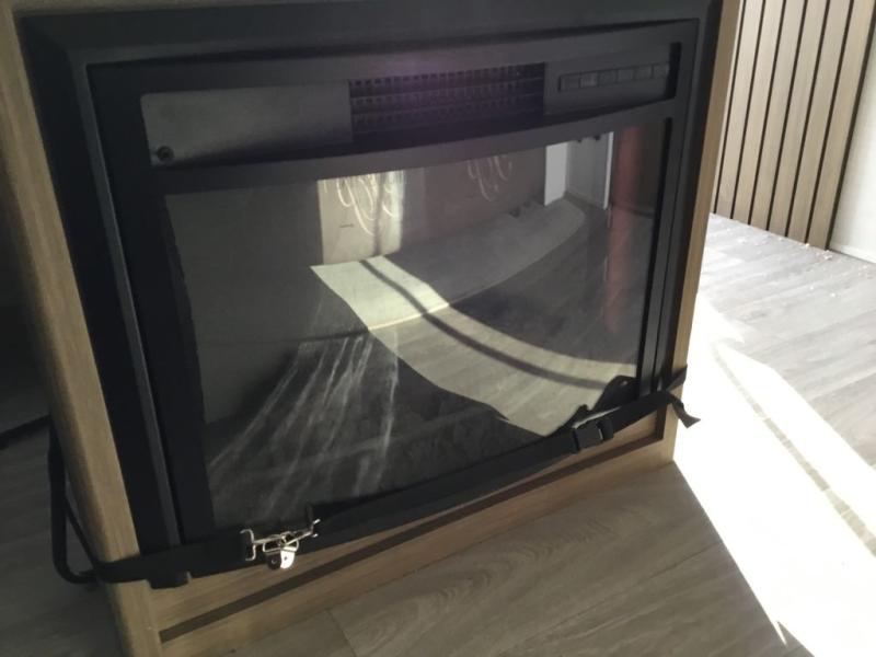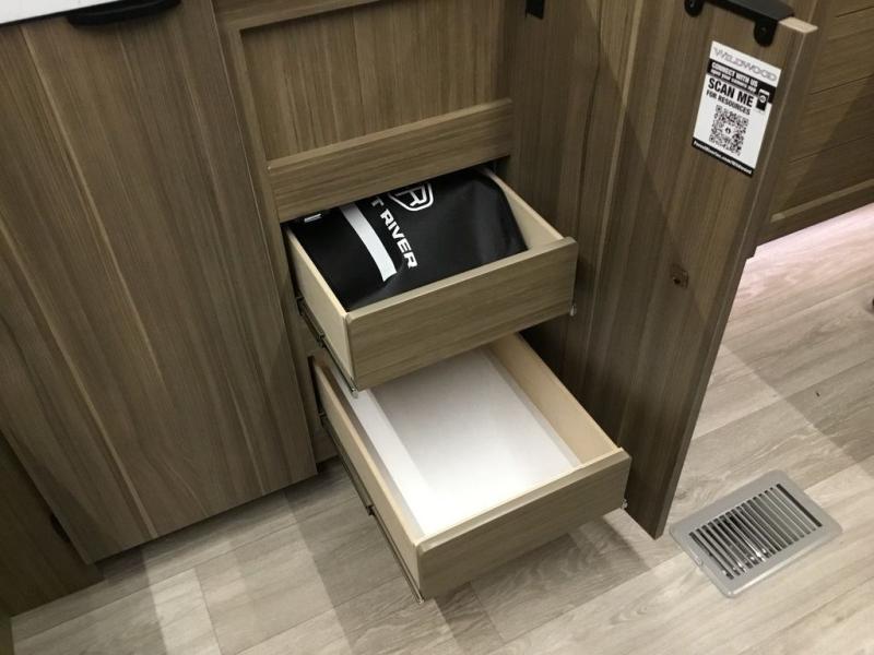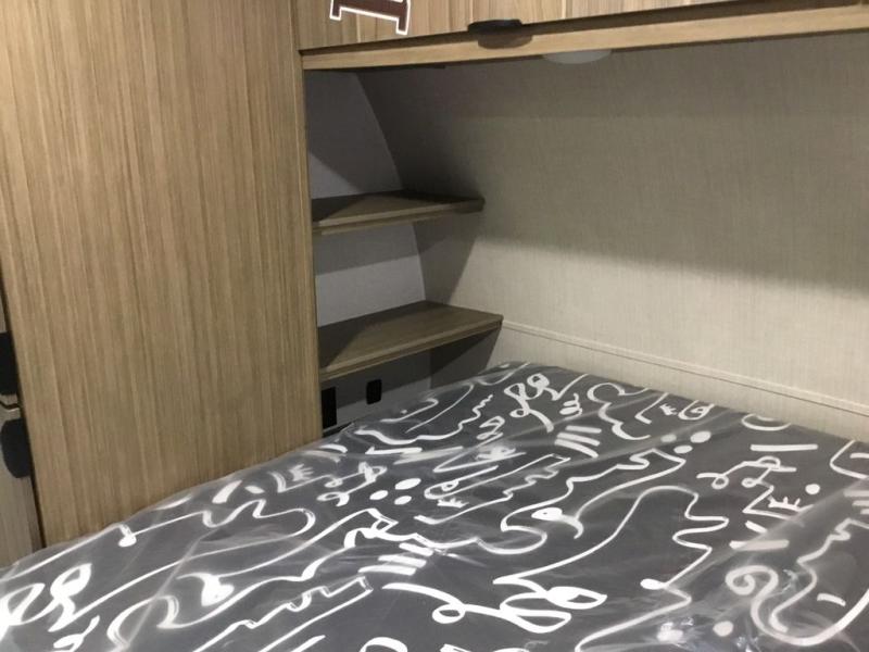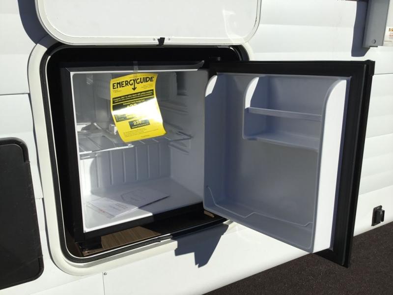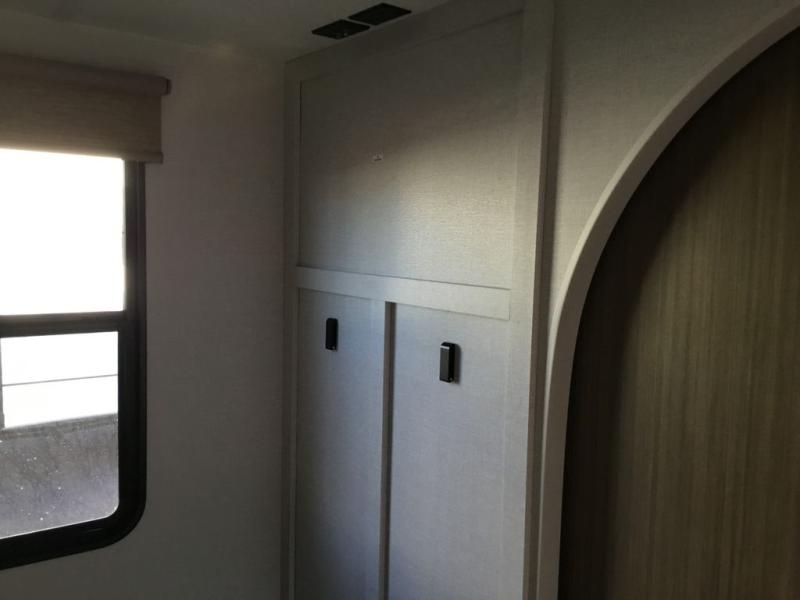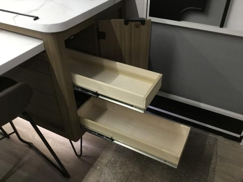 You can enjoy at-home comforts wherever you decide to camp in this travel trailer. The custom king bed with Versa Tilt includes dual shelves and a wardrobe so you can keep your space tidy. If you have a guest or two little ones, they can sleep on the jackknife sofa within the large slide out. Once you've made breakfast in the fully equipped kitchen, you can utilize the pull-out table to dine at. There is also a fireplace below the table, which will be perfect for cozy evenings indoors. And don't overlook the full rear bath, complete with a spacious shower, a toilet, bath shelves, and ample counter space!