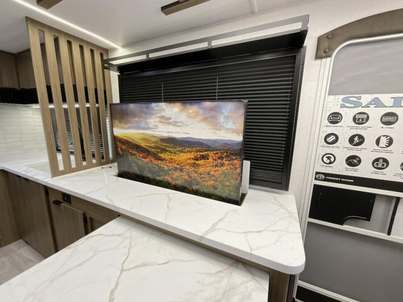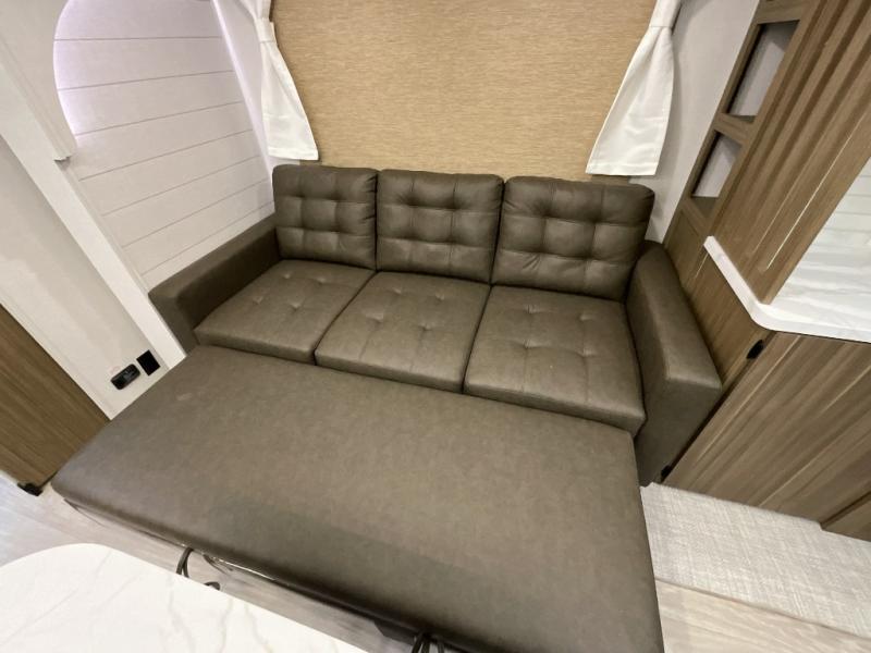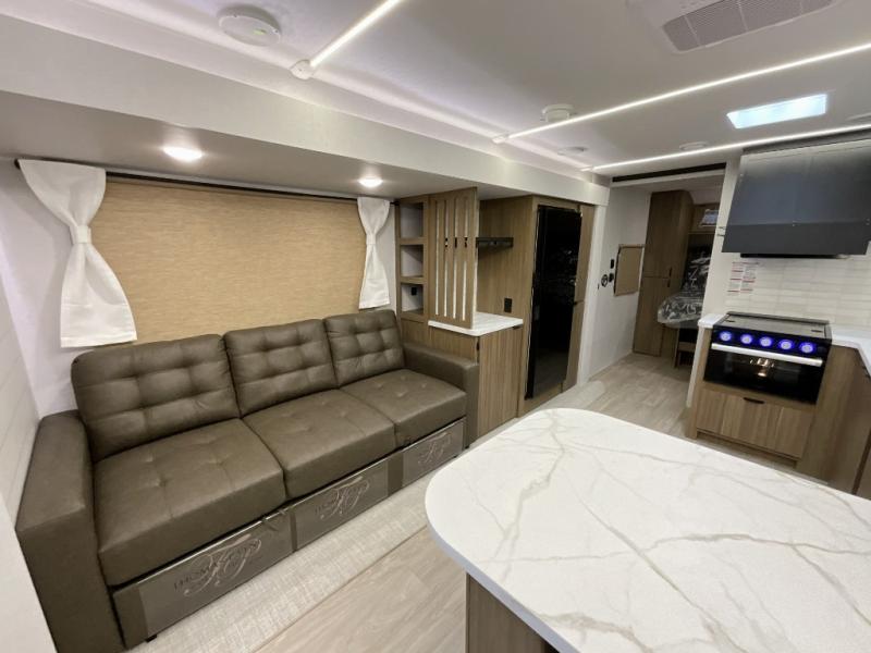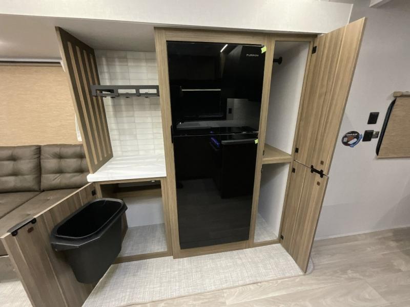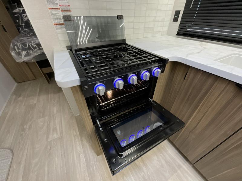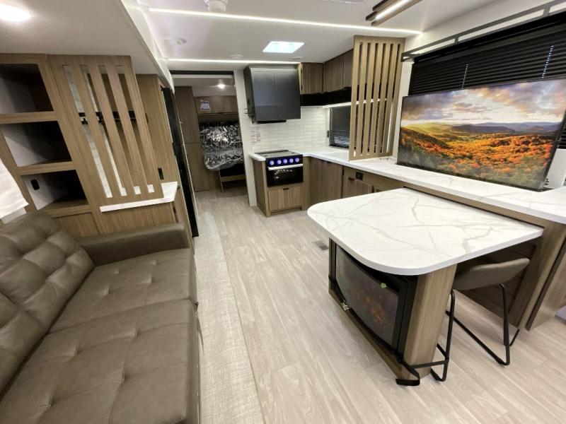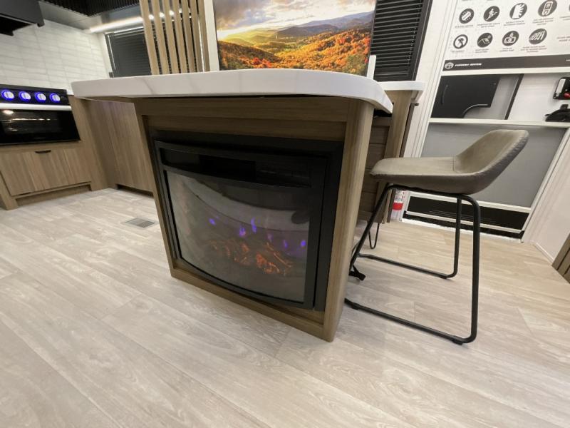 You can enjoy at-home comforts wherever you decide to camp in this travel trailer. The custom king bed with Versa Tilt includes dual shelves and a wardrobe so you can keep your space tidy. If you have a guest or two little ones, they can sleep on the jackknife sofa within the large slide out. Once you've made breakfast in the fully equipped kitchen, you can utilize the pull-out table to dine at. There is also a fireplace below the table, which will be perfect for cozy evenings indoors. And don't overlook the full rear bath, complete with a spacious shower, a toilet, bath shelves, and ample counter space!