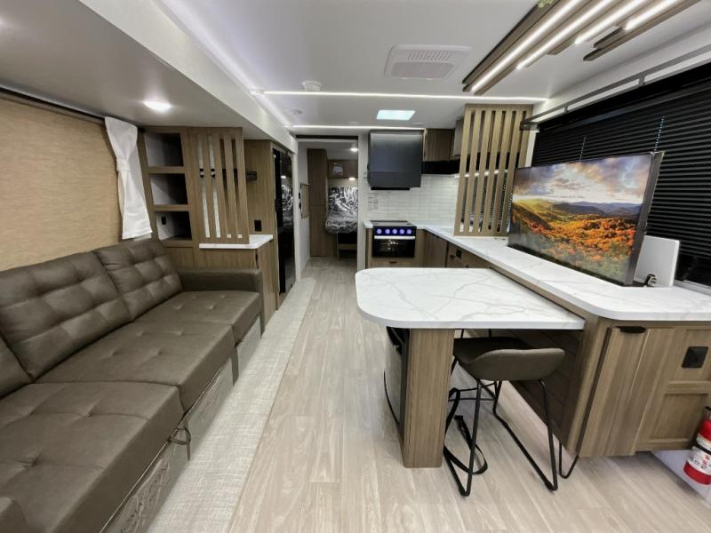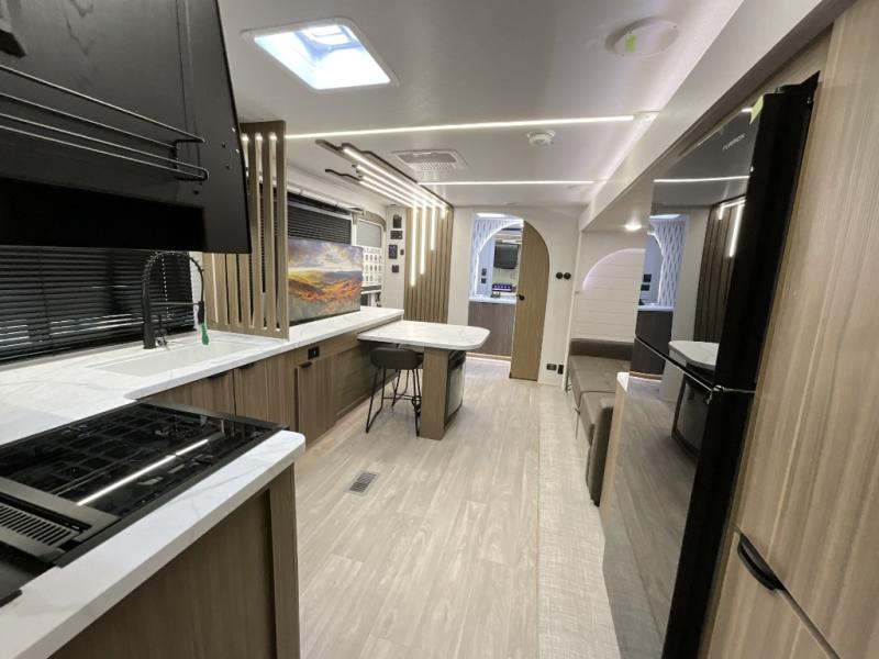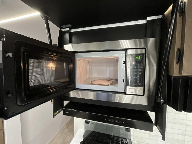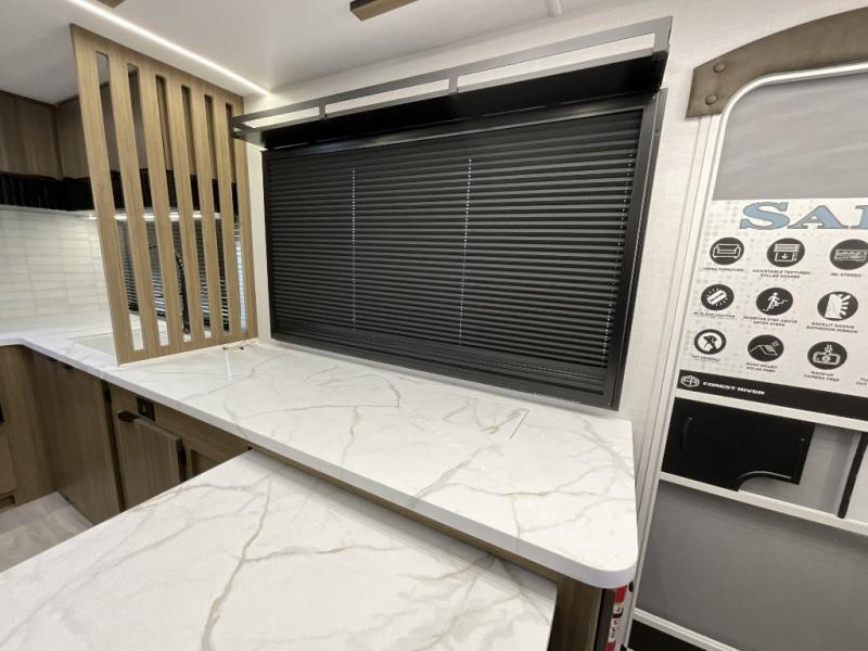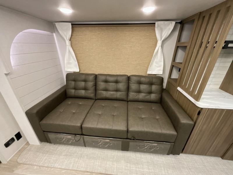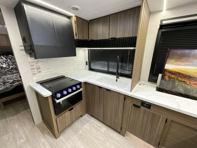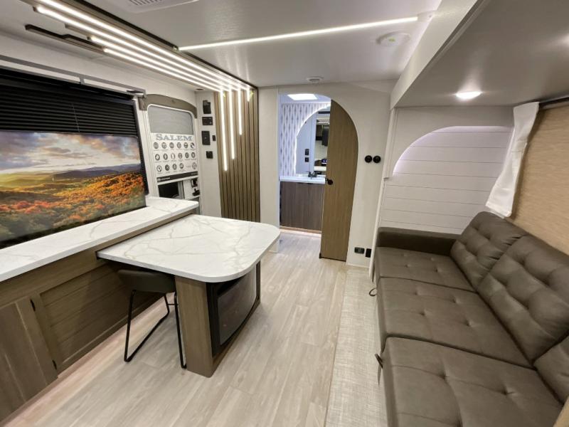 You can enjoy at-home comforts wherever you decide to camp in this travel trailer. The custom king bed with Versa Tilt includes dual shelves and a wardrobe so you can keep your space tidy. If you have a guest or two little ones, they can sleep on the jackknife sofa within the large slide out. Once you've made breakfast in the fully equipped kitchen, you can utilize the pull-out table to dine at. There is also a fireplace below the table, which will be perfect for cozy evenings indoors. And don't overlook the full rear bath, complete with a spacious shower, a toilet, bath shelves, and ample counter space!