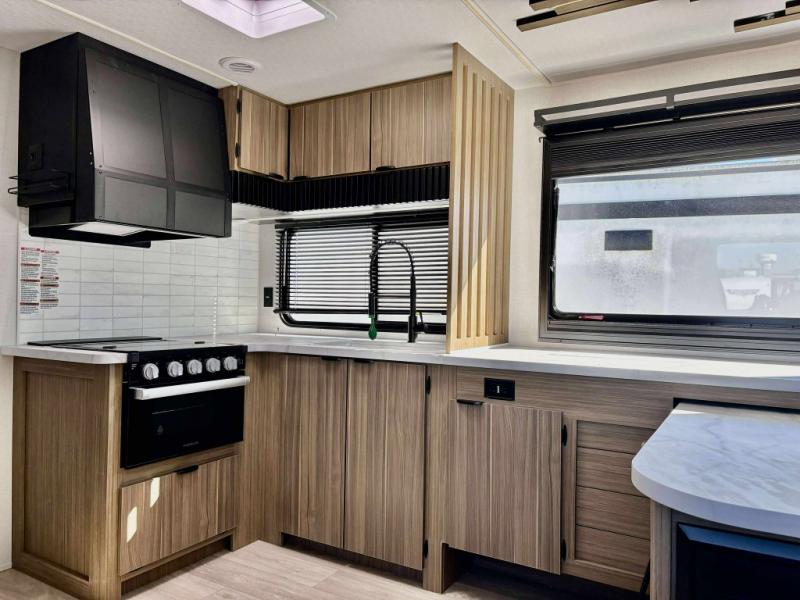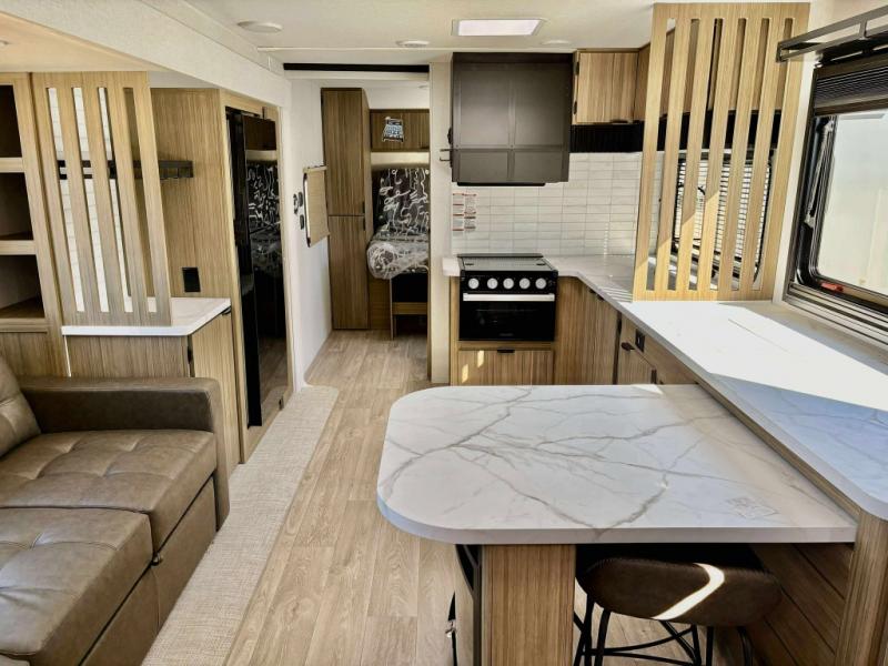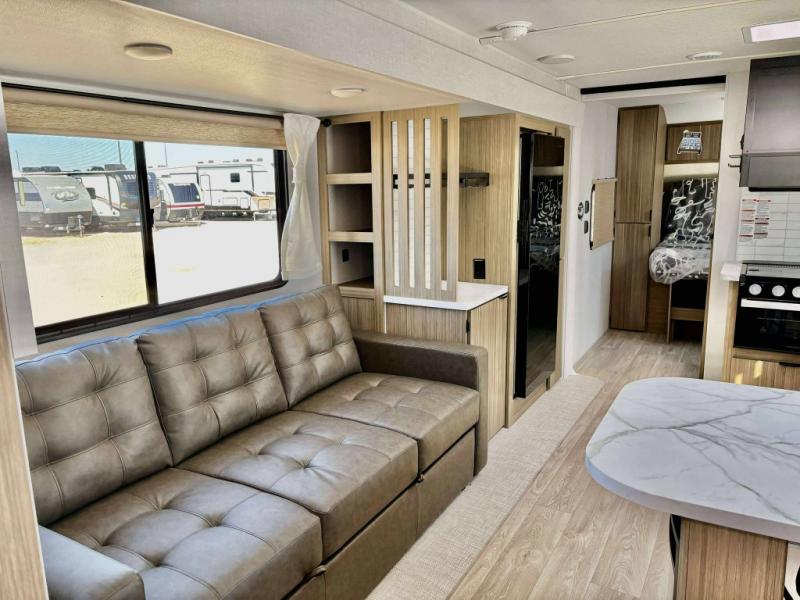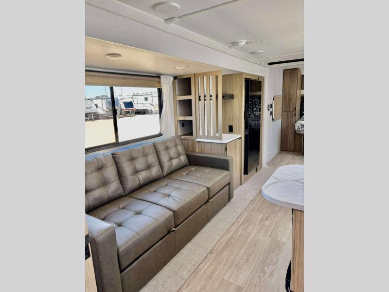 You can enjoy at-home comforts wherever you decide to camp in this travel trailer. The custom king bed with Versa Tilt includes dual shelves and a wardrobe so you can keep your space tidy. If you have a guest or two little ones, they can sleep on the jackknife sofa within the large slide out. Once you've made breakfast in the fully equipped kitchen, you can utilize the pull-out table to dine at. There is also a fireplace below the table, which will be perfect for cozy evenings indoors. And don't overlook the full rear bath, complete with a spacious shower, a toilet, bath shelves, and ample counter space!