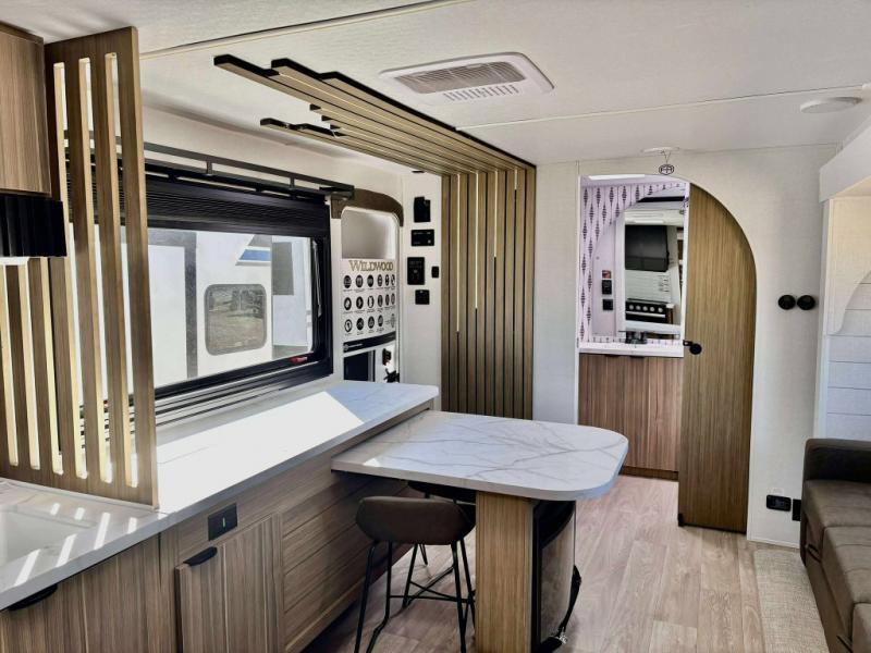 The Wildwood travel trailers are packed with hassle-free camping amenities! There are a variety of floorplans to choose from so you can find the layout that best fits your needs. The heated and enclosed Accessibelly will help protect against the elements and debris during transport, and the exterior retro/metal redesign is sure to be eye-catching! There are stylish roller shades inside, along with updated backsplash, elegant curtain rods and curtains, plus many more interior comforts! Choose a Wildwood travel trailer today for quality and value!