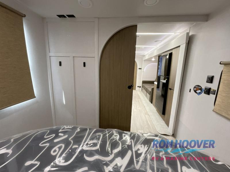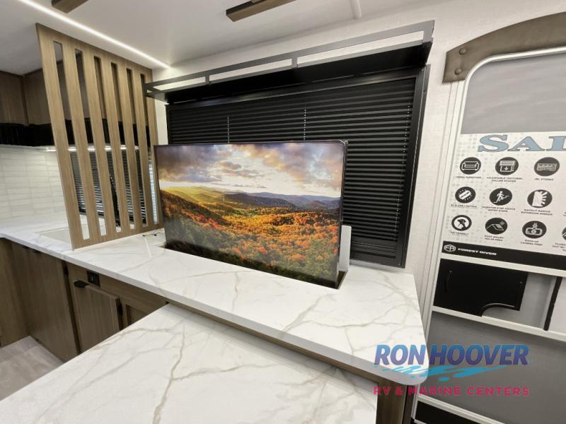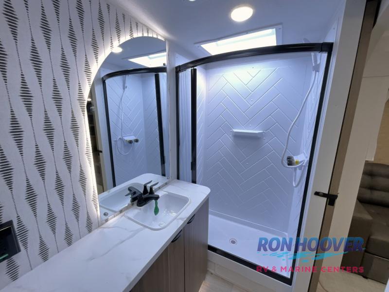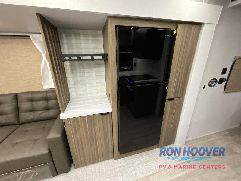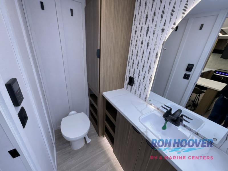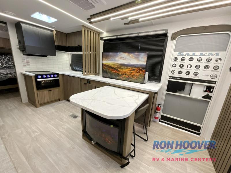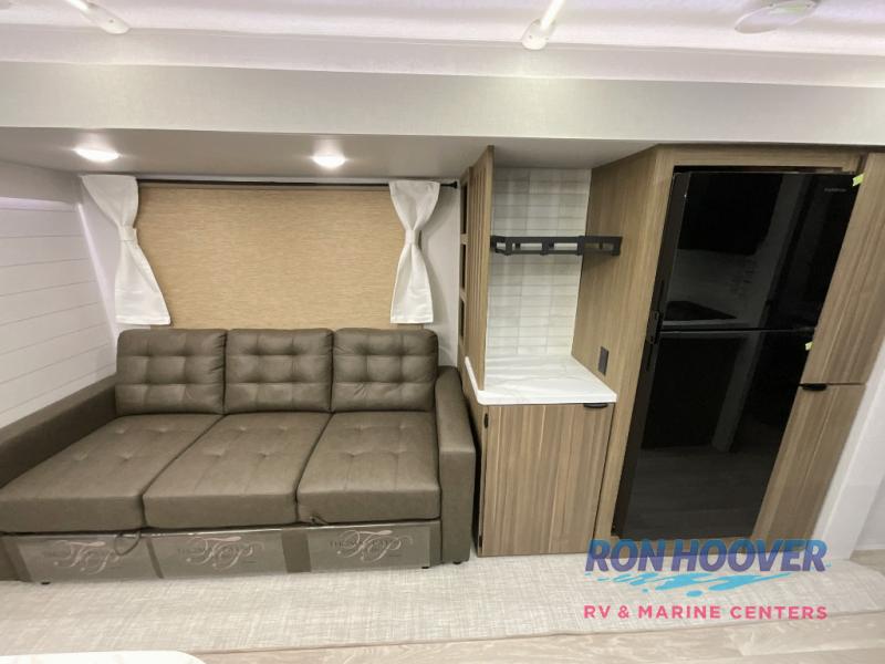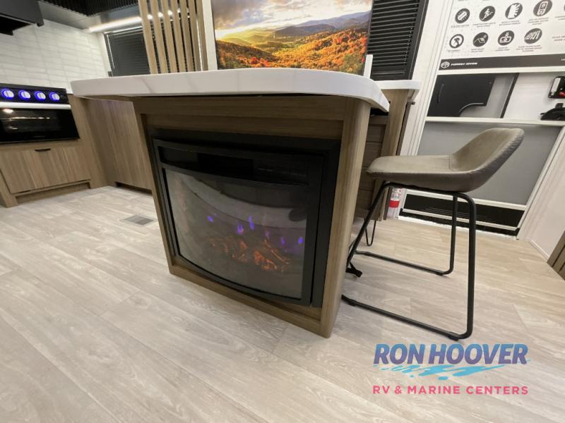 You can enjoy at-home comforts wherever you decide to camp in this travel trailer. The custom king bed with Versa Tilt includes dual shelves and a wardrobe so you can keep your space tidy. If you have a guest or two little ones, they can sleep on the jackknife sofa within the large slide out. Once you've made breakfast in the fully equipped kitchen, you can utilize the pull-out table to dine at. There is also a fireplace below the table, which will be perfect for cozy evenings indoors. And don't overlook the full rear bath, complete with a spacious shower, a toilet, bath shelves, and ample counter space!