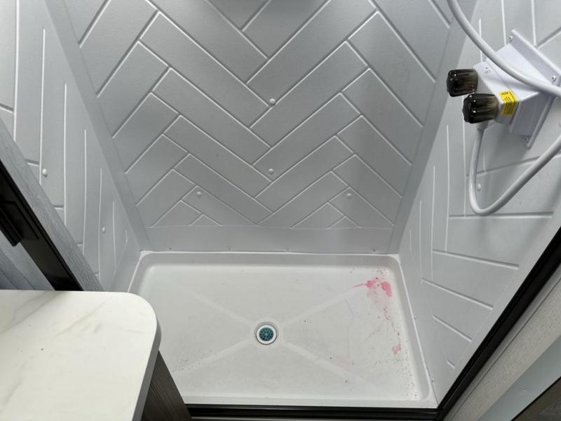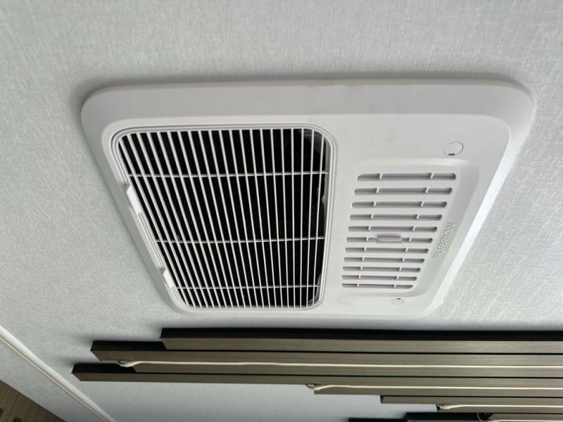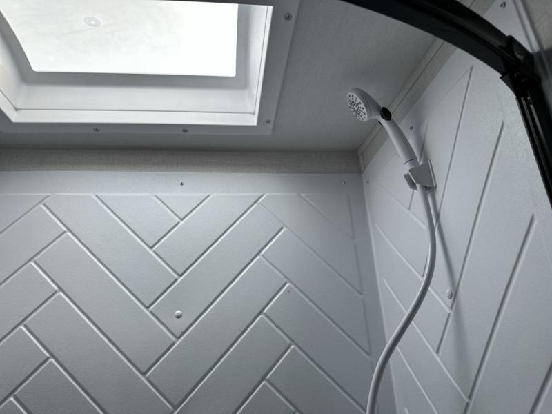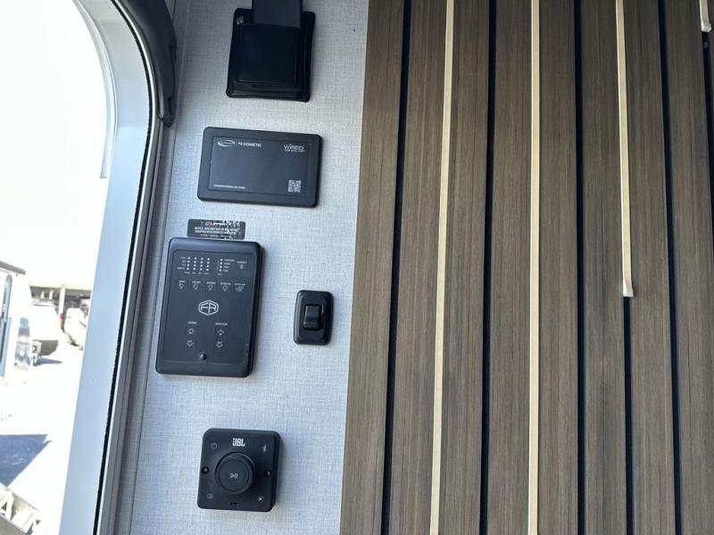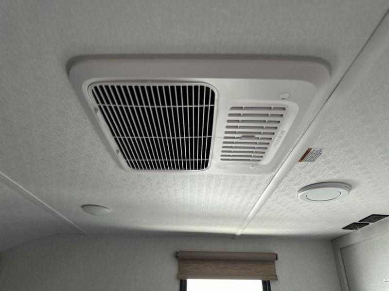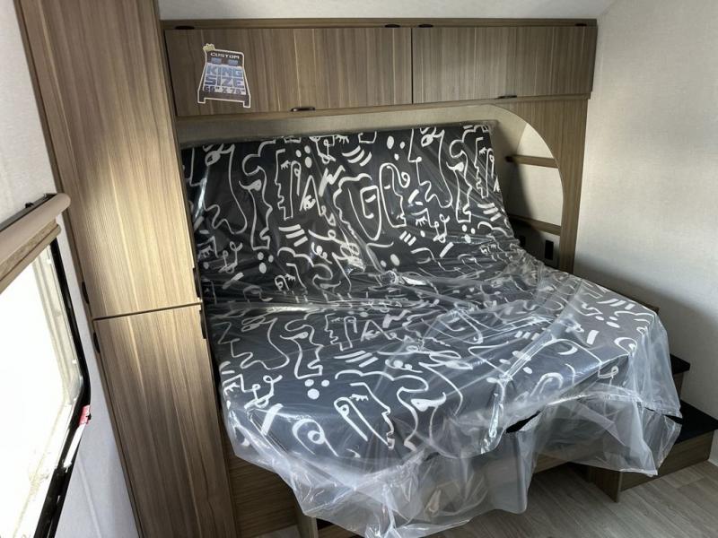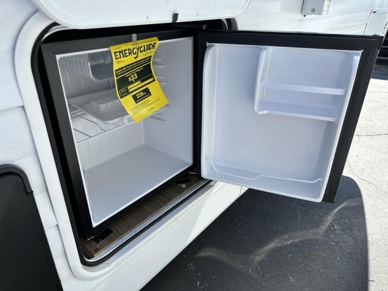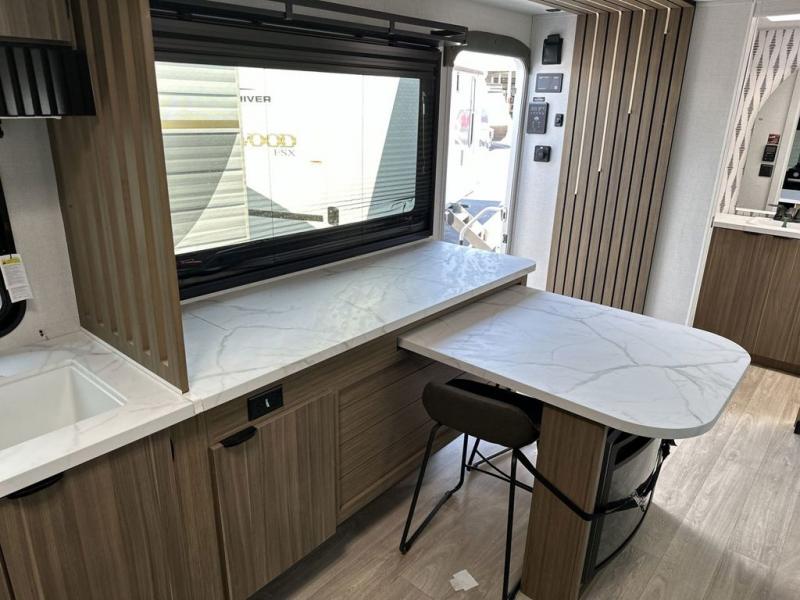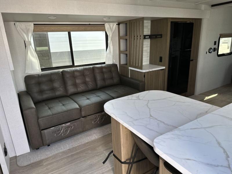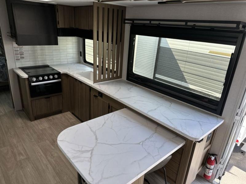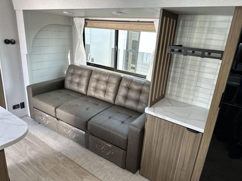 You can enjoy at-home comforts wherever you decide to camp in this travel trailer. The custom king bed with Versa Tilt includes dual shelves and a wardrobe so you can keep your space tidy. If you have a guest or two little ones, they can sleep on the jackknife sofa within the large slide out. Once you've made breakfast in the fully equipped kitchen, you can utilize the pull-out table to dine at. There is also a fireplace below the table, which will be perfect for cozy evenings indoors. And don't overlook the full rear bath, complete with a spacious shower, a toilet, bath shelves, and ample counter space!
