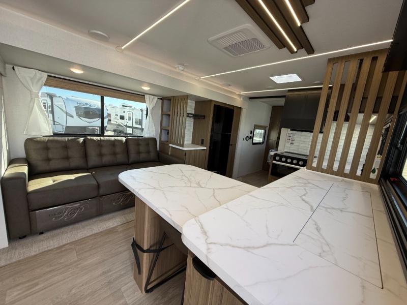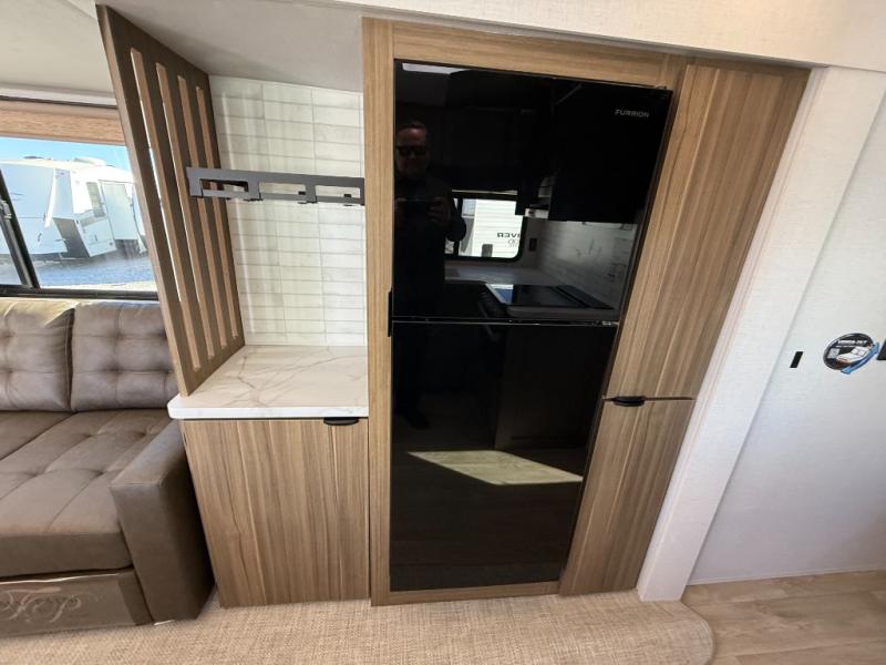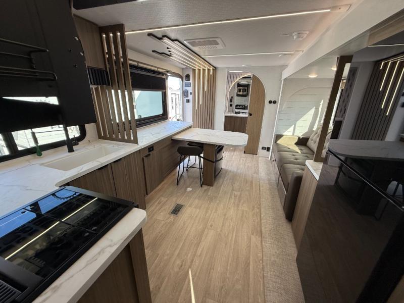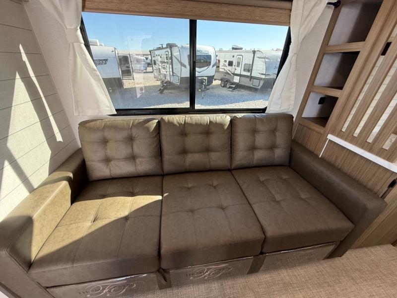 You can enjoy at-home comforts wherever you decide to camp in this travel trailer. The custom king bed with Versa Tilt includes dual shelves and a wardrobe so you can keep your space tidy. If you have a guest or two little ones, they can sleep on the jackknife sofa within the large slide out. Once you've made breakfast in the fully equipped kitchen, you can utilize the pull-out table to dine at. There is also a fireplace below the table, which will be perfect for cozy evenings indoors. And don't overlook the full rear bath, complete with a spacious shower, a toilet, bath shelves, and ample counter space!