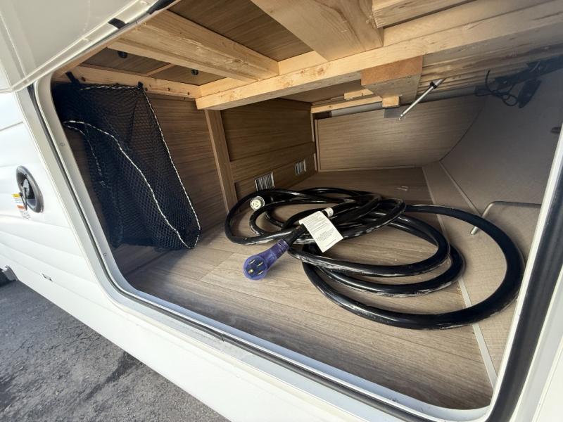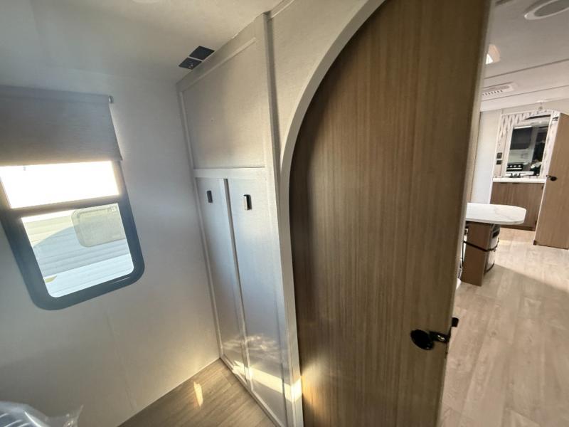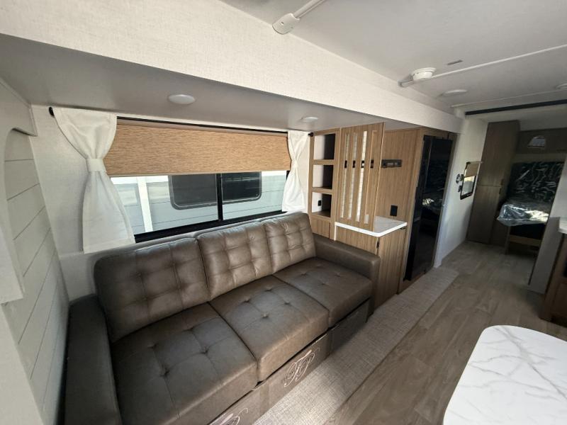 You can enjoy at-home comforts wherever you decide to camp in this travel trailer. The custom king bed with Versa Tilt includes dual shelves and a wardrobe so you can keep your space tidy. If you have a guest or two little ones, they can sleep on the jackknife sofa within the large slide out. Once you've made breakfast in the fully equipped kitchen, you can utilize the pull-out table to dine at. There is also a fireplace below the table, which will be perfect for cozy evenings indoors. And don't overlook the full rear bath, complete with a spacious shower, a toilet, bath shelves, and ample counter space!