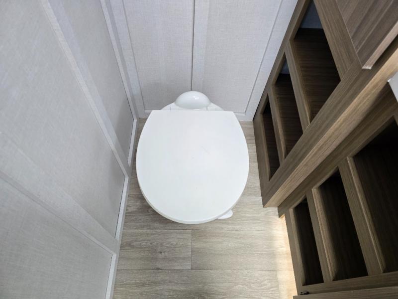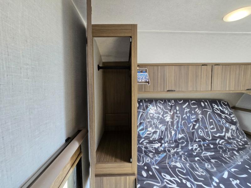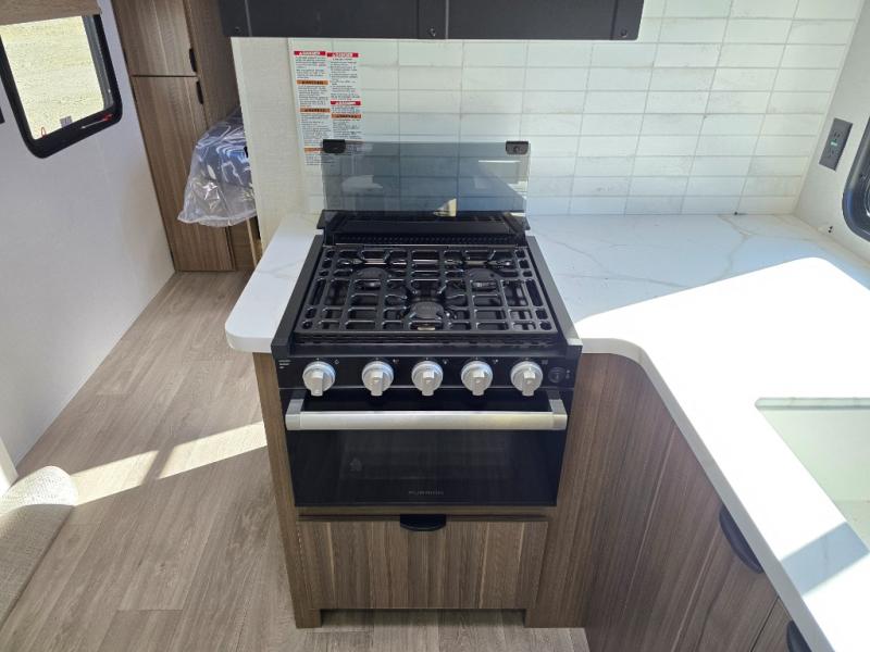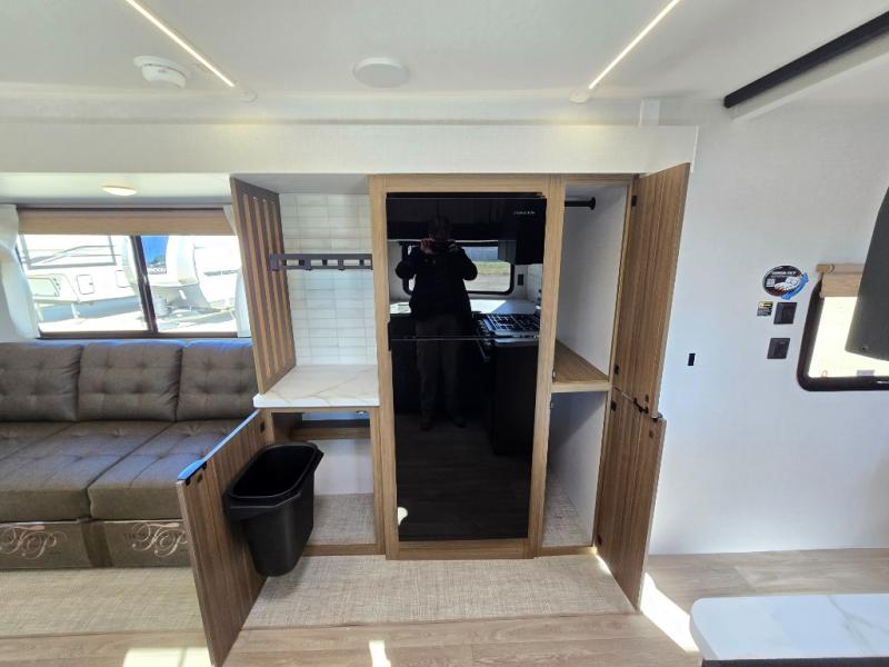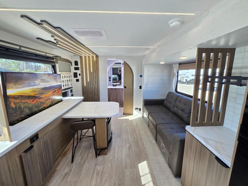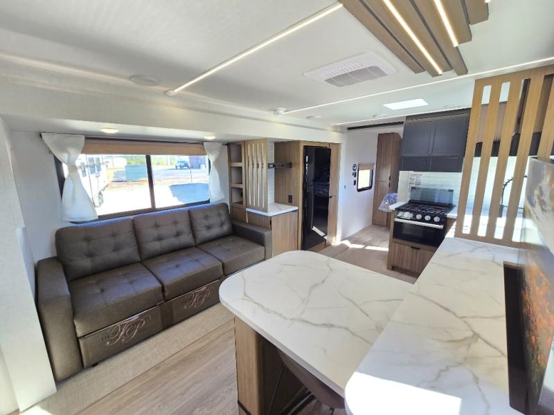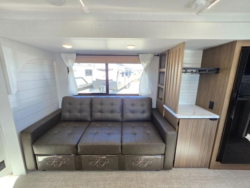You can enjoy at-home comforts wherever you decide to camp in this travel trailer. The custom king bed with Versa Tilt includes dual shelves and a wardrobe so you can keep your space tidy. If you have a guest or two little ones, they can sleep on the jackknife sofa within the large slide out. Once you've made breakfast in the fully equipped kitchen, you can utilize the pull-out table to dine at. There is also a fireplace below the table, which will be perfect for cozy evenings indoors. And don't overlook the full rear bath, complete with a spacious shower, a toilet, bath shelves, and ample counter space!