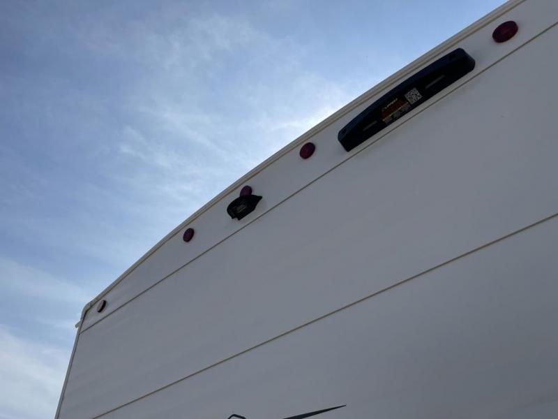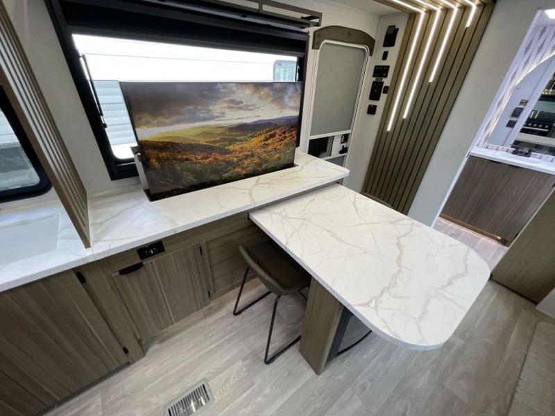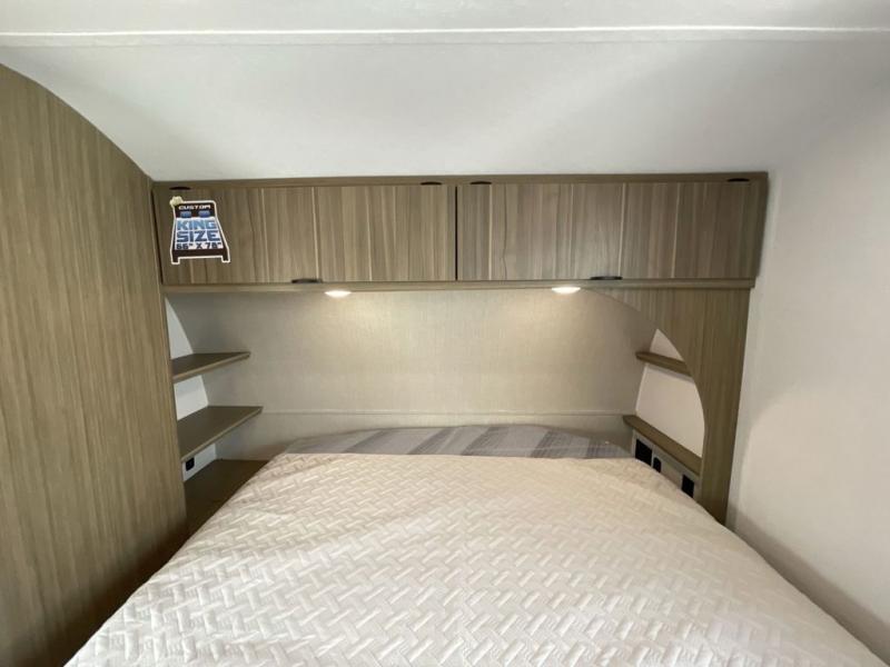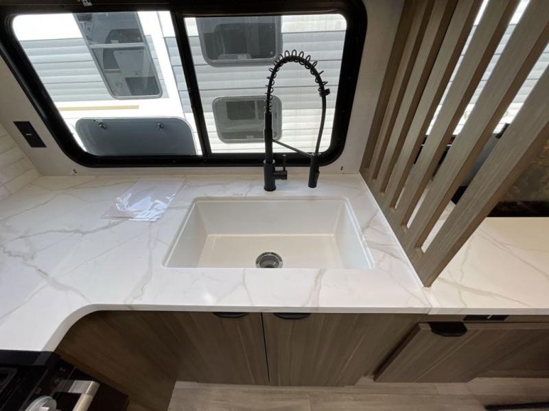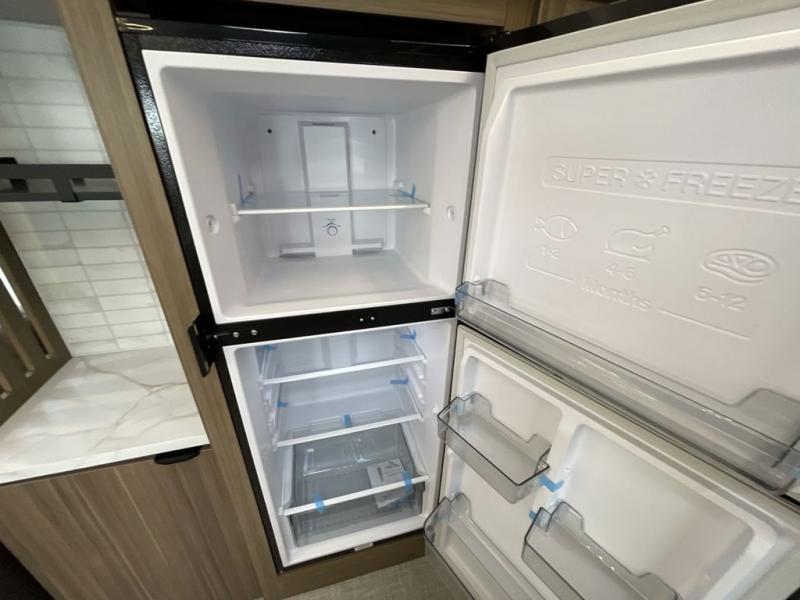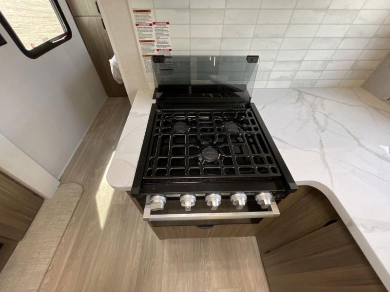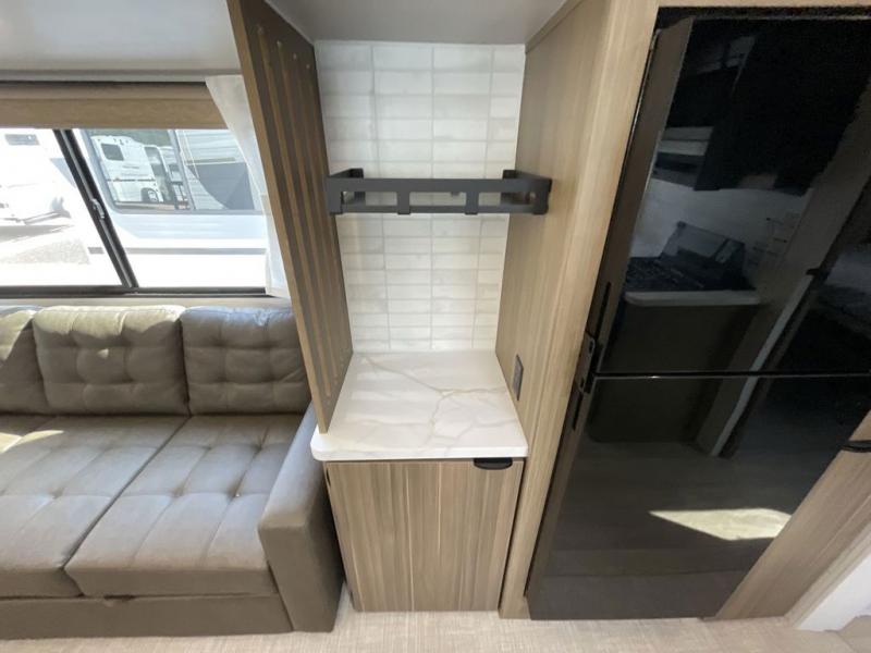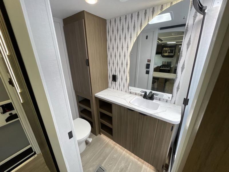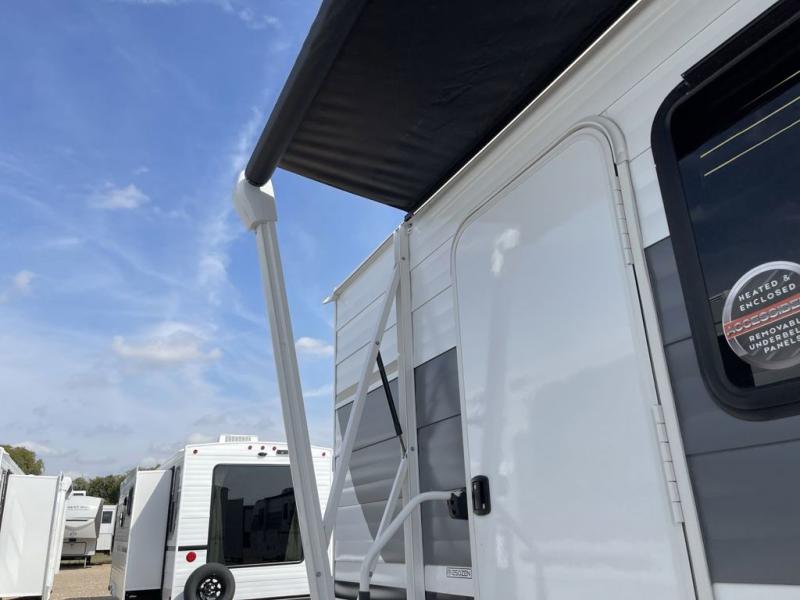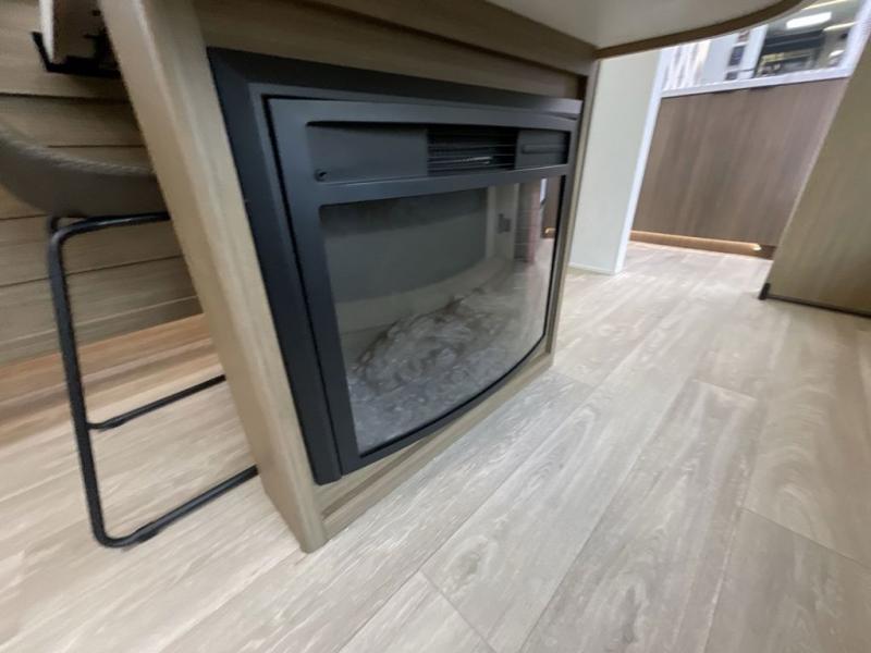 You can enjoy at-home comforts wherever you decide to camp in this travel trailer. The custom king bed with Versa Tilt includes dual shelves and a wardrobe so you can keep your space tidy. If you have a guest or two little ones, they can sleep on the jackknife sofa within the large slide out. Once you've made breakfast in the fully equipped kitchen, you can utilize the pull-out table to dine at. There is also a fireplace below the table, which will be perfect for cozy evenings indoors. And don't overlook the full rear bath, complete with a spacious shower, a toilet, bath shelves, and ample counter space!