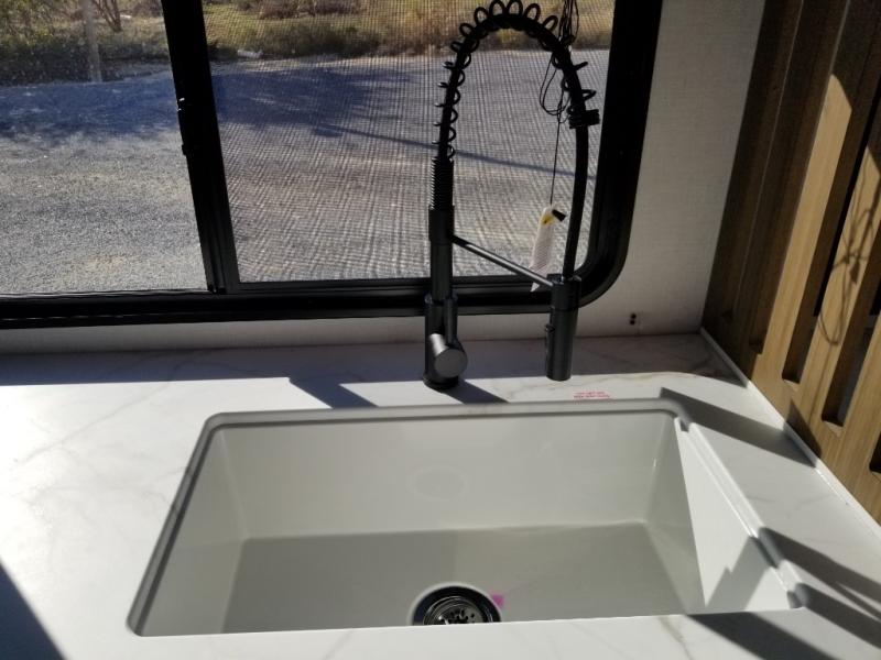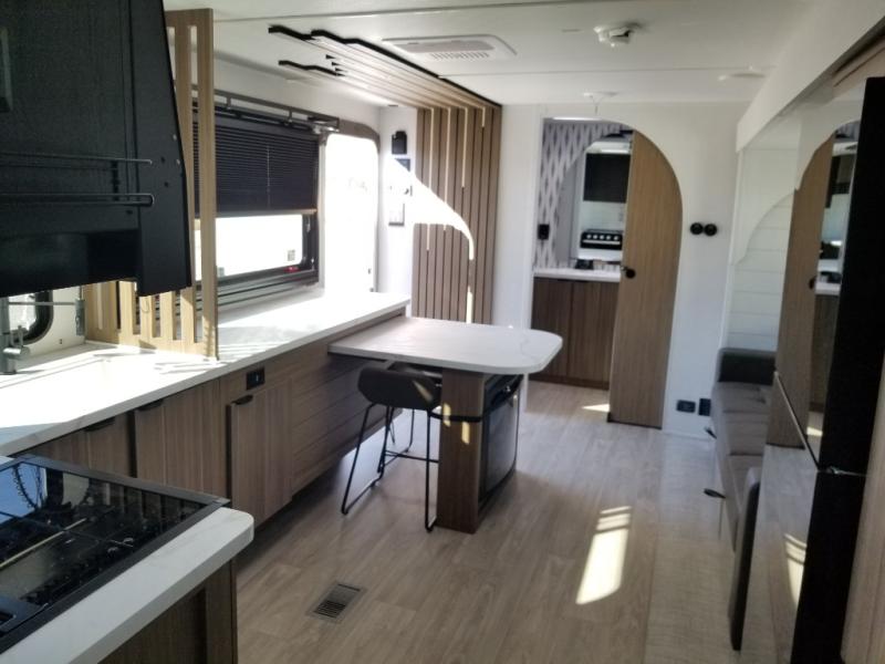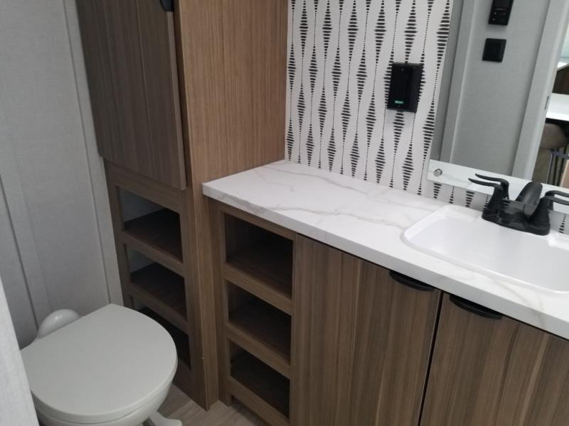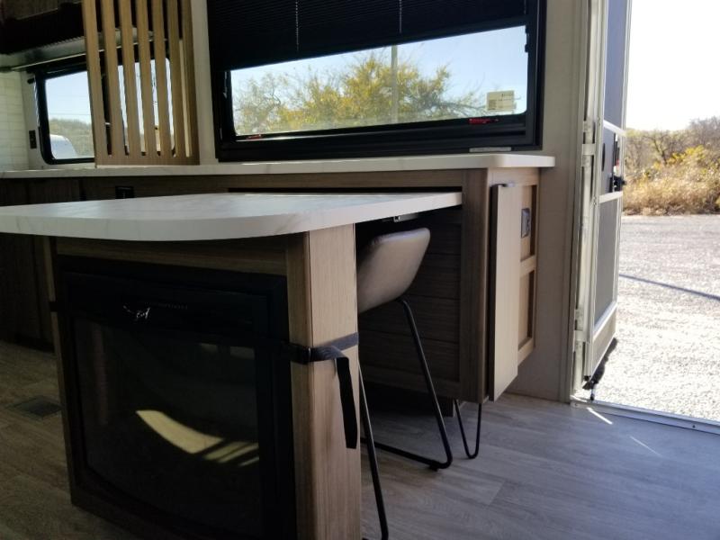 You can enjoy at-home comforts wherever you decide to camp in this travel trailer. The custom king bed with Versa Tilt includes dual shelves and a wardrobe so you can keep your space tidy. If you have a guest or two little ones, they can sleep on the jackknife sofa within the large slide out. Once you've made breakfast in the fully equipped kitchen, you can utilize the pull-out table to dine at. There is also a fireplace below the table, which will be perfect for cozy evenings indoors. And don't overlook the full rear bath, complete with a spacious shower, a toilet, bath shelves, and ample counter space!