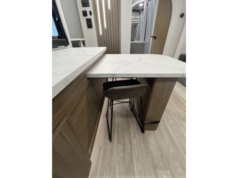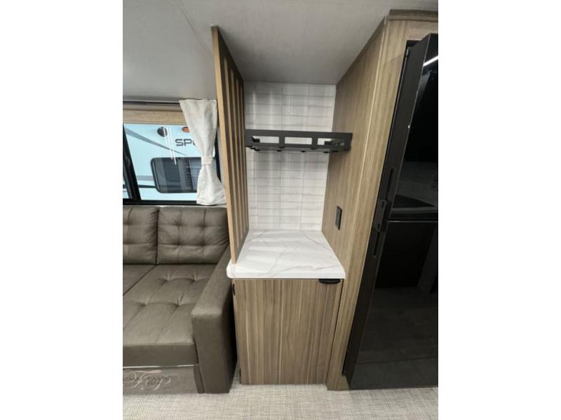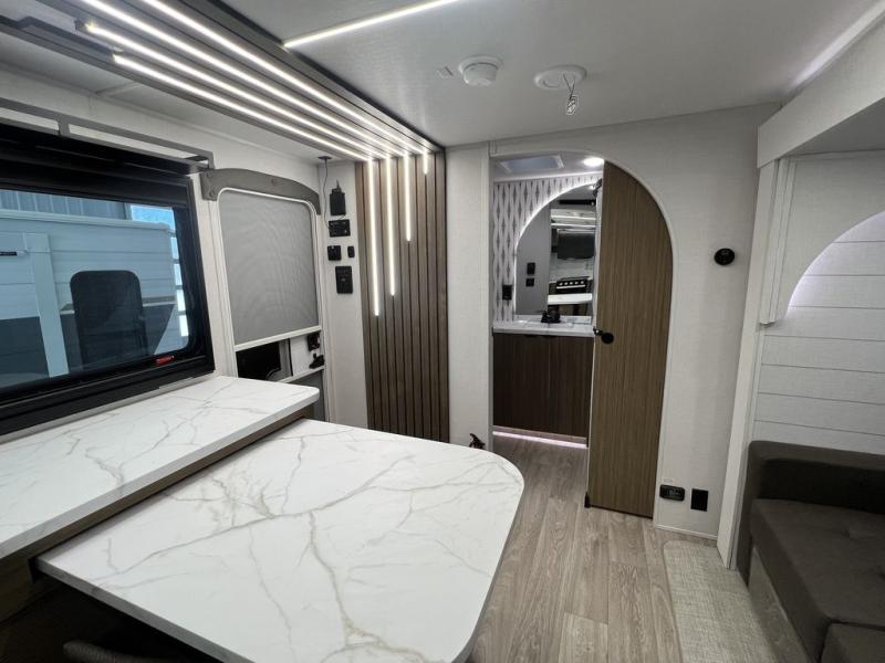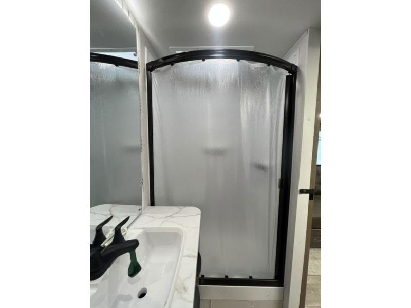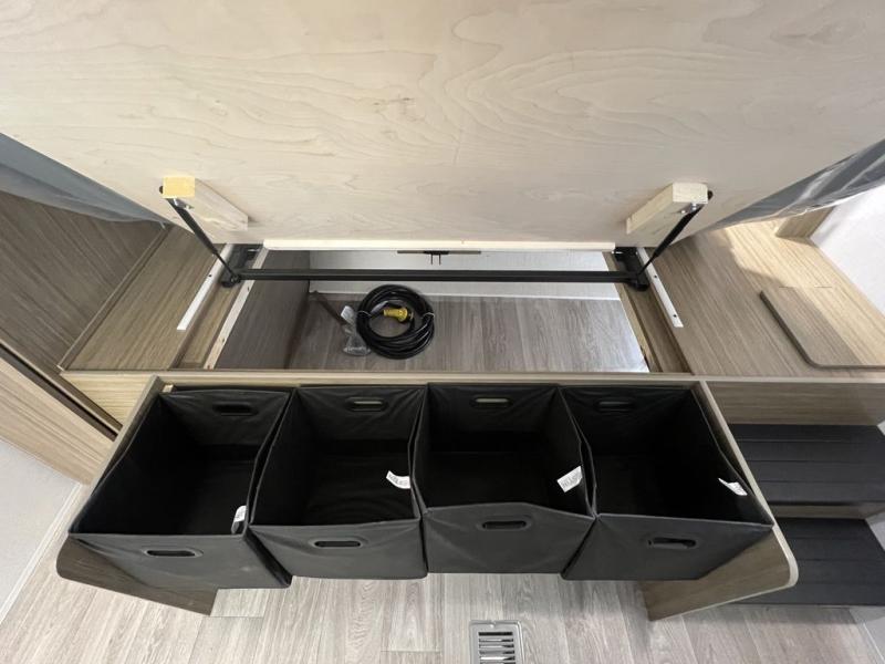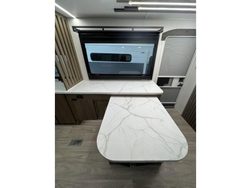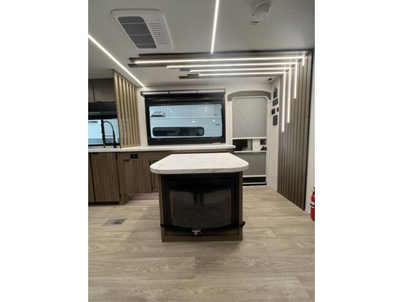 You can enjoy at-home comforts wherever you decide to camp in this travel trailer. The custom king bed with Versa Tilt includes dual shelves and a wardrobe so you can keep your space tidy. If you have a guest or two little ones, they can sleep on the 68" trundle sofa within the large slide out. Once you've made breakfast in the fully equipped kitchen, you can utilize the pull-out table to dine at. There is also a fireplace below the table, which will be perfect for cozy evenings indoors. And don't overlook the full rear bath, complete with a spacious shower, a toilet, bath shelves, and ample counter space!