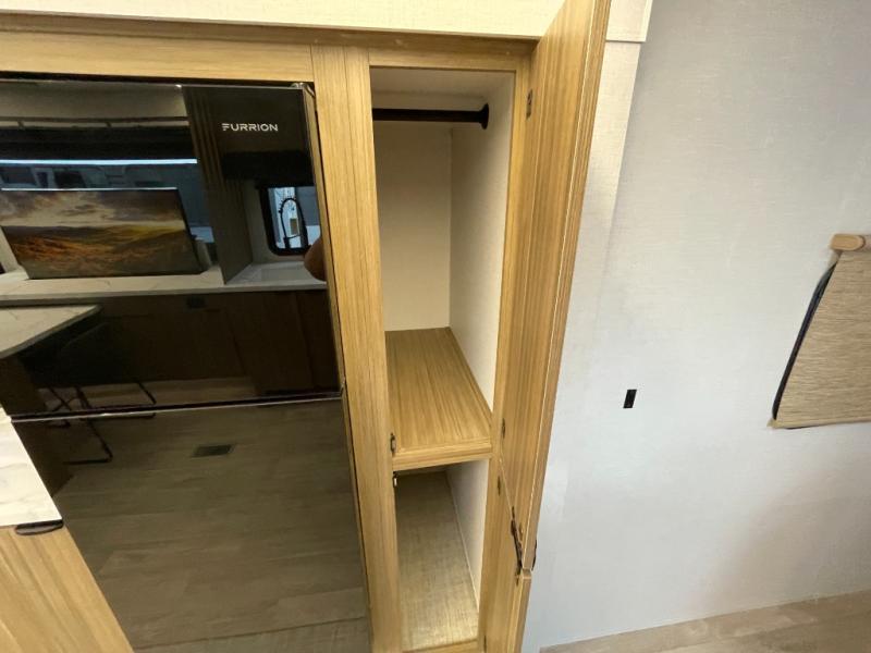 At the front of the trailer, you’ll find a private bedroom designed for restful nights and relaxing mornings. The comfortable king-size bed provides plenty of space to stretch out and recharge after a day of adventure. Overhead cabinets and wardrobe storage keep clothing and travel essentials organized, while the private layout creates a cozy retreat within the RV.