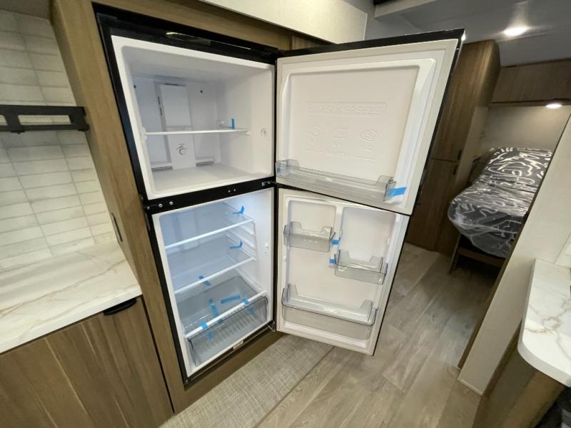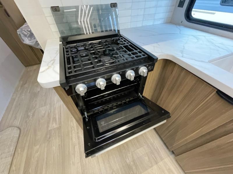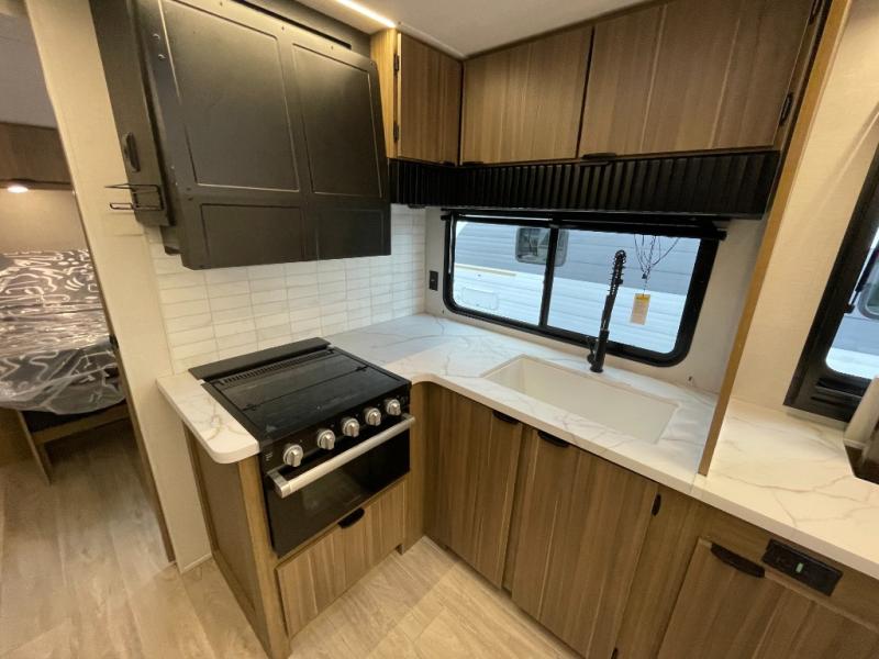 The kitchen in the Wildwood 250ZEN is designed to make cooking on the road simple and enjoyable. It features a three-burner cooktop, microwave, refrigerator, and generous cabinet storage for cookware and groceries.