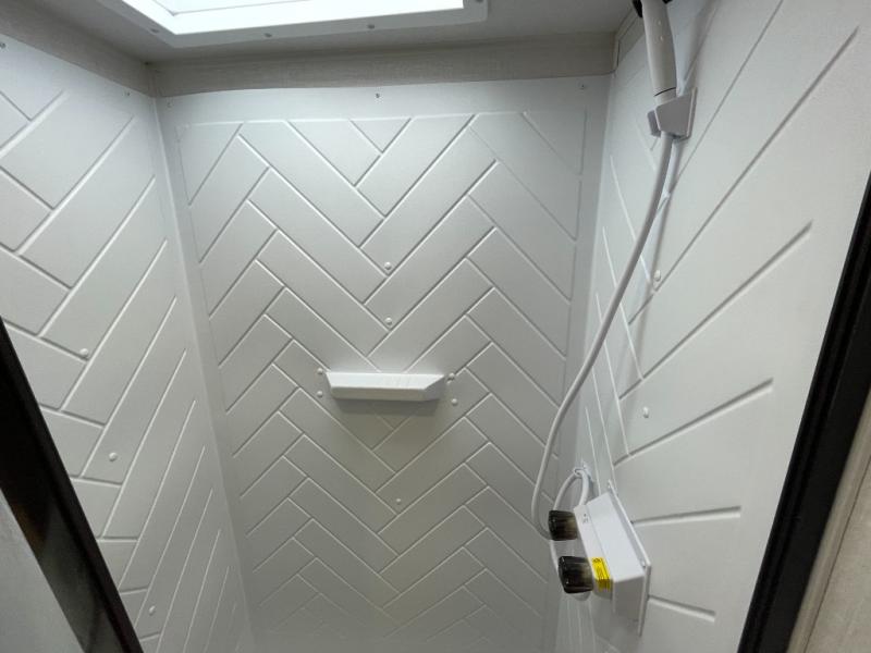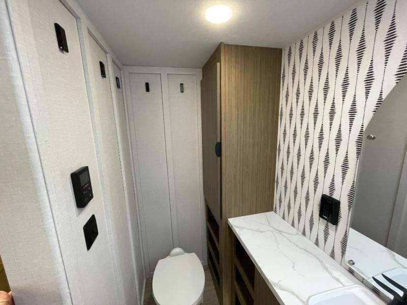 The bathroom includes a large shower, vanity sink, toilet, mirror, and additional storage for toiletries and personal items. This spacious design makes daily routines more convenient and adds to the residential feel of the RV.